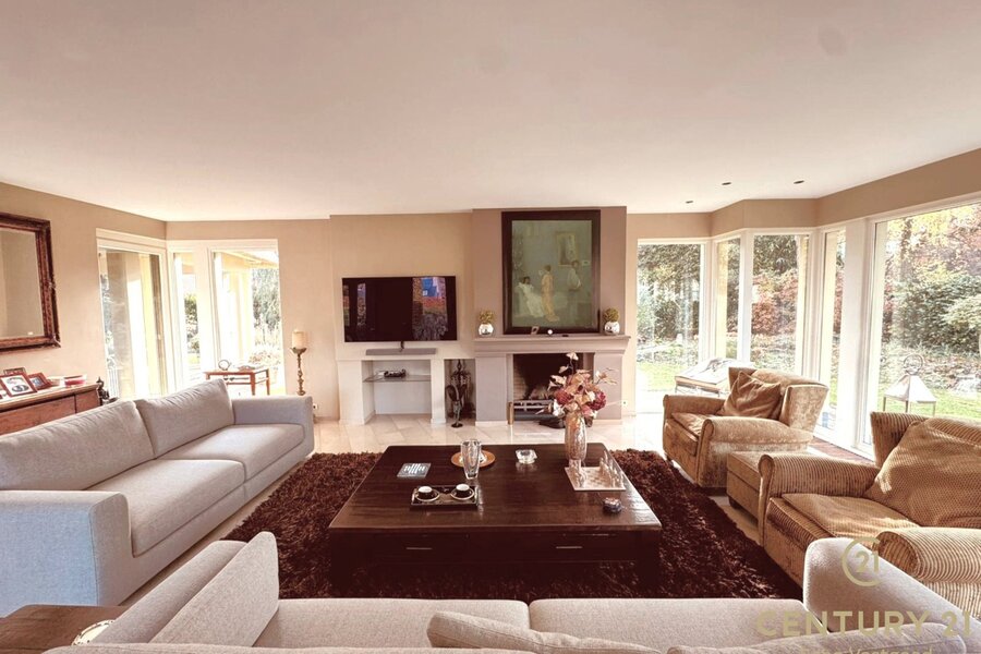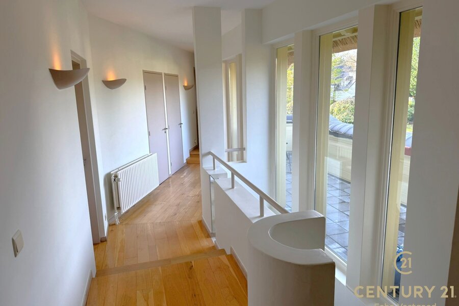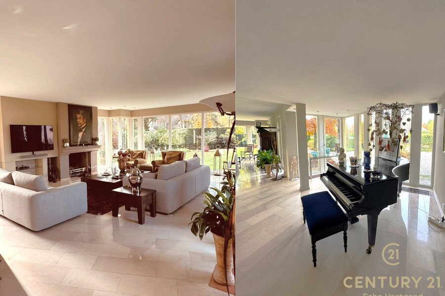 De ruime inkomhal vormt een stijlvolle entree, geeft uit naar het gastentoilet en de bureauruimte alsook naar de verschillende leefruimtes van de woning. De royale woonkamer baadt in natuurlijk licht en geniet dankzij grote raampartijen van een continu zicht op de tuin. De volledige gelijkvloerse verdieping is afgewerkt met een prachtige natuurstenen vloer in combinatie met vloerverwarming, wat zorgt voor een warm en luxueus wooncomfort.