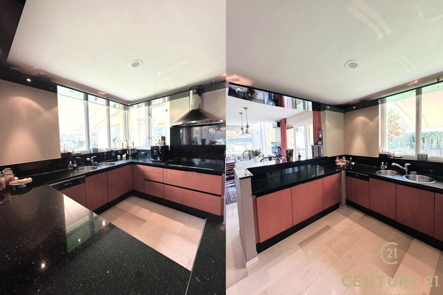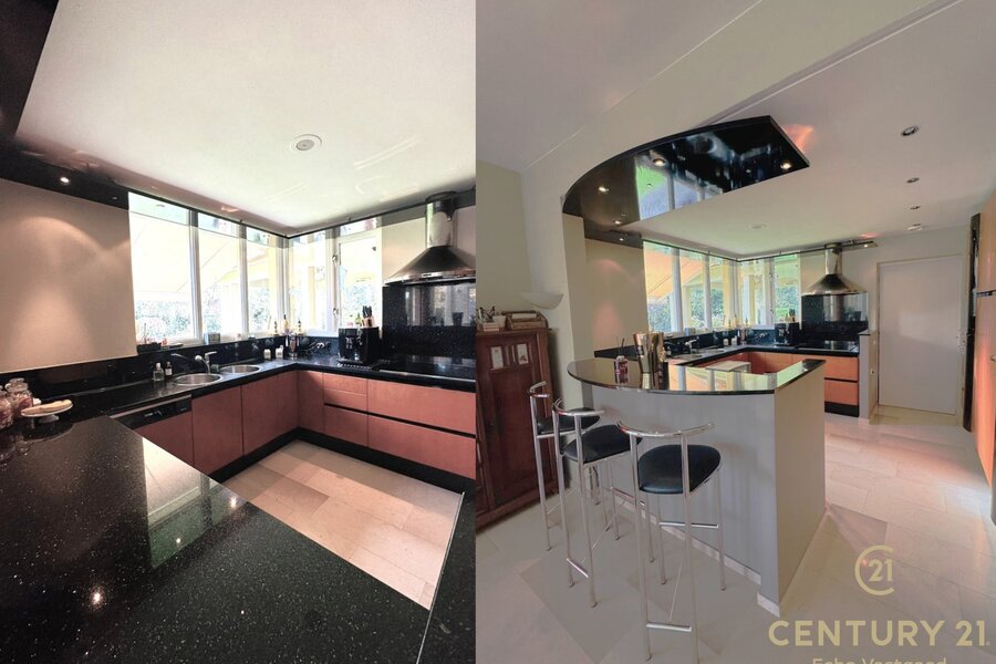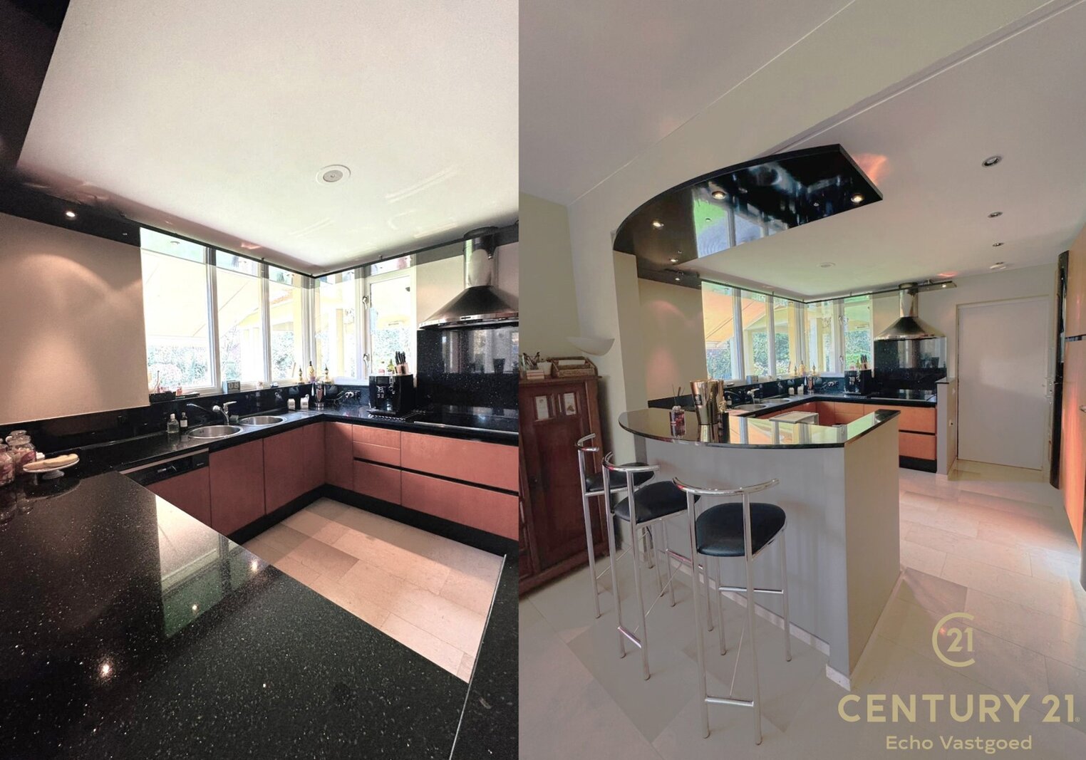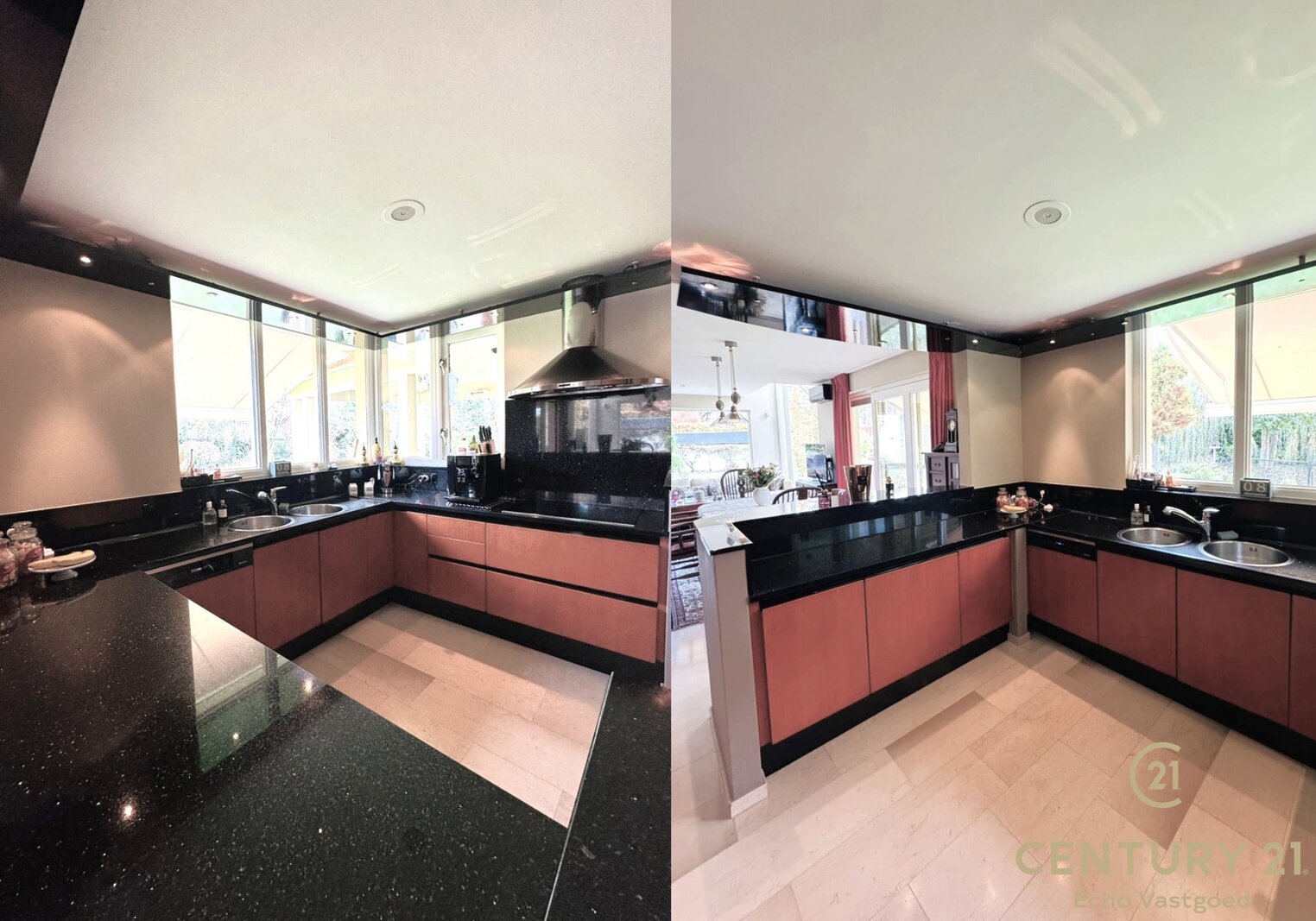 De heerlijke leefkeuken, uitgerust met geïntegreerde eetkamer en een gezellige tv-hoek, vormt het hart van het huis. Aansluitend bevindt zich de praktische wasruimte met achterliggend een apart toilet en douche, ideaal voor zwembadgasten. Verder is er een inpandige garage voor twee wagens.
