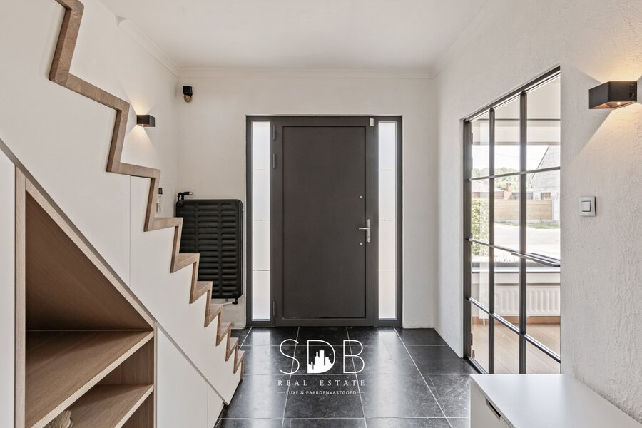 We betreden de woning via de ruime inkomhal, de blikvanger is ongetwijfeld de prachtige smeedijzeren deur welke de inkomhal verbindt met de leefruimte.