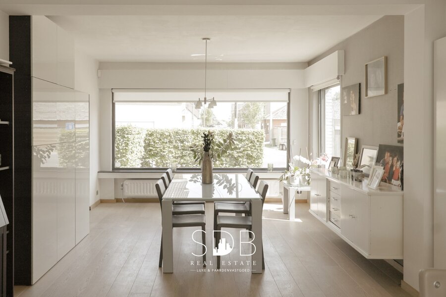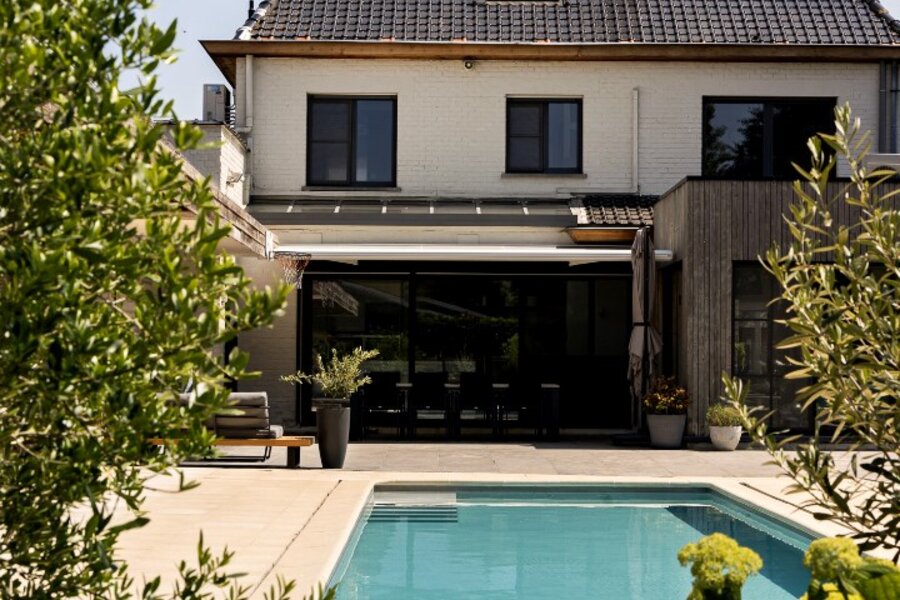 Deze ruimte straalt een tijdloos en open karakter uit, met de openhaard als centraal gedeelte. Dankzij de vele raampartijen geniet je niet alleen van het natuurlijk daglicht maar ook van het prachtig uitzicht op de tuin en het zwembad.