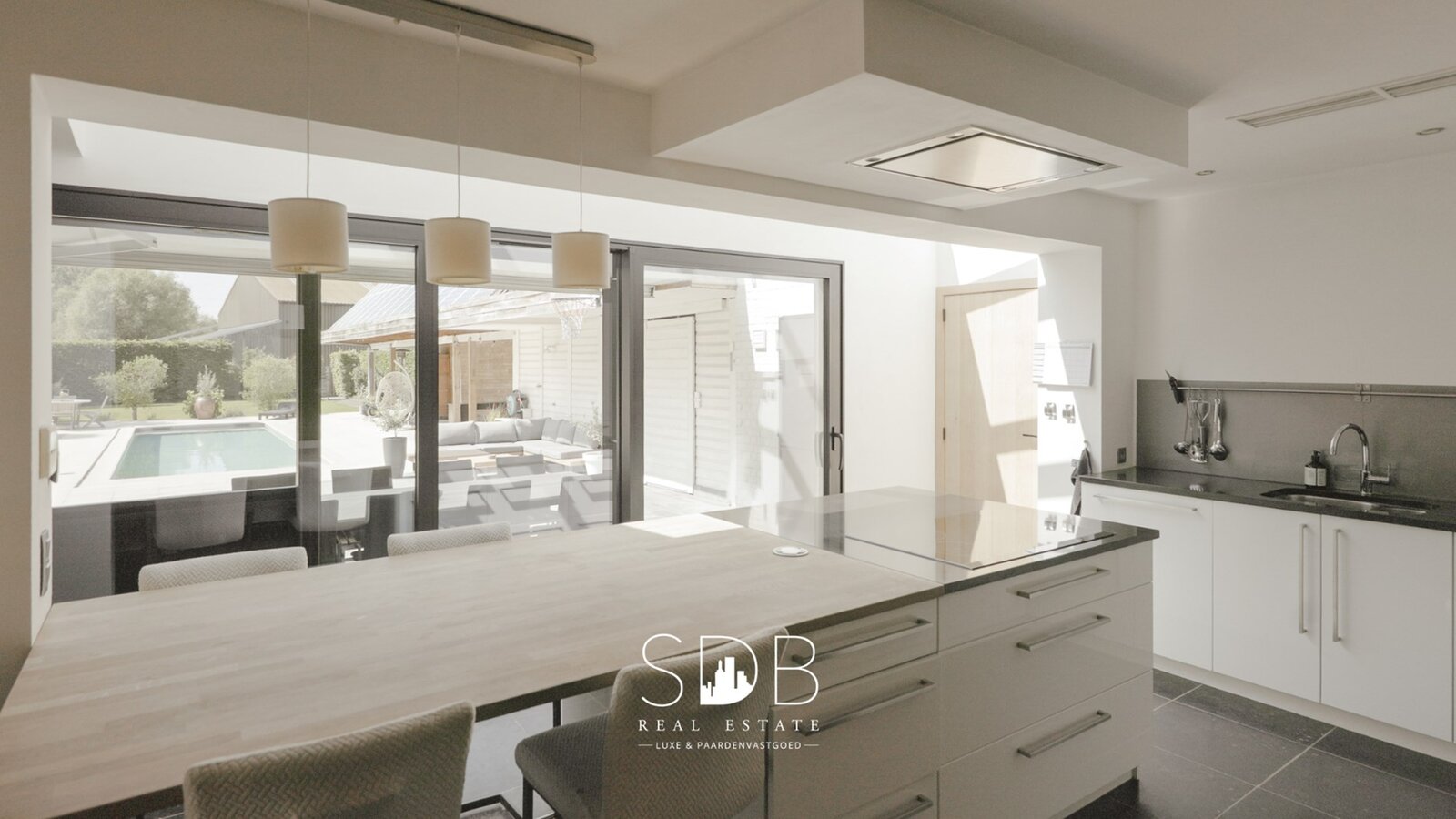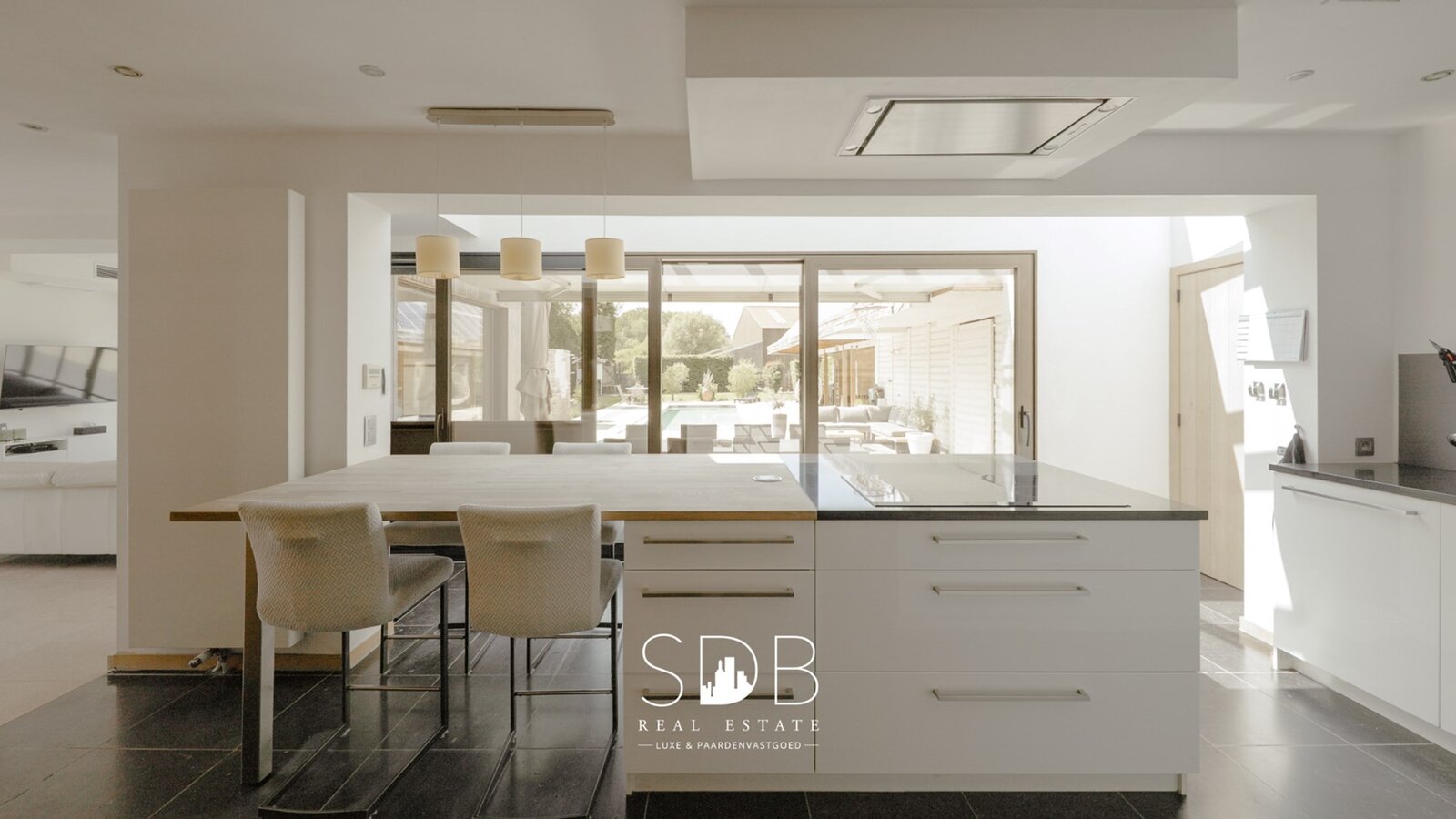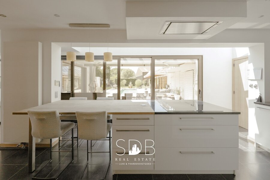 Aanpalend bevindt zich de semi-open keuken. Deze hedendaagse witte keuken met accenten is voorzien in al haar faciliteiten. Het centraal keukeneiland met zitruimte en zicht op het terras met zwembad maken van deze keuken een heerlijke leefplek!