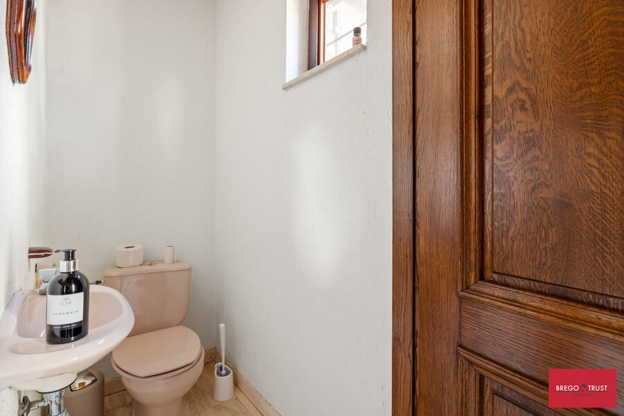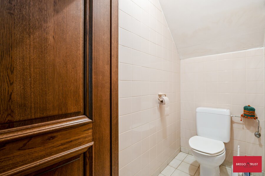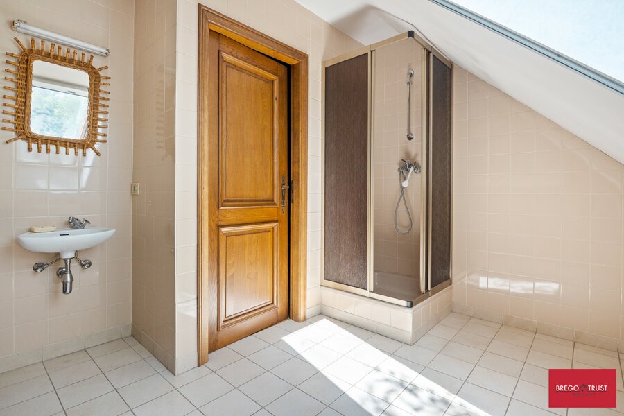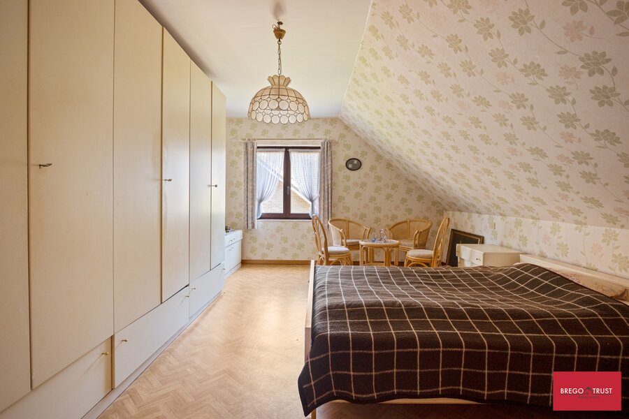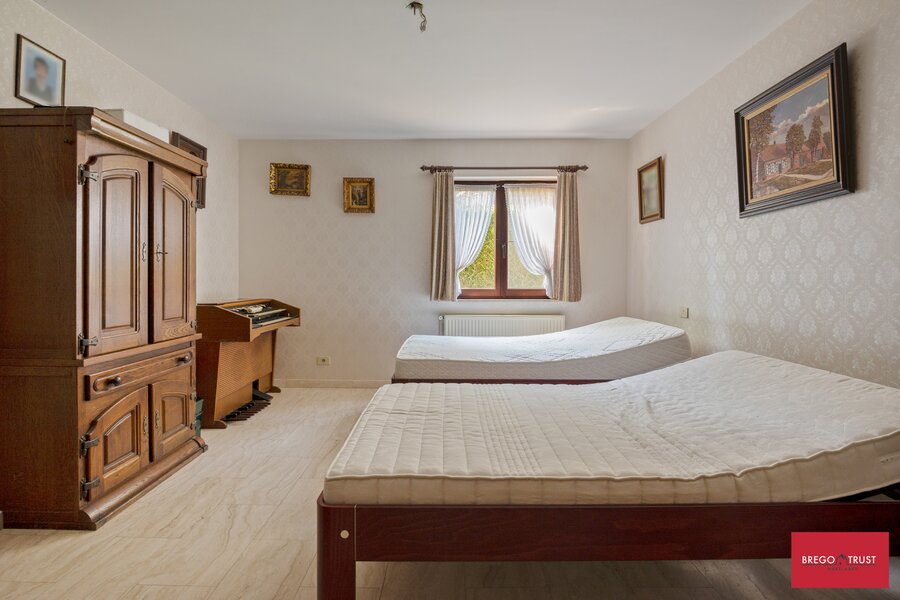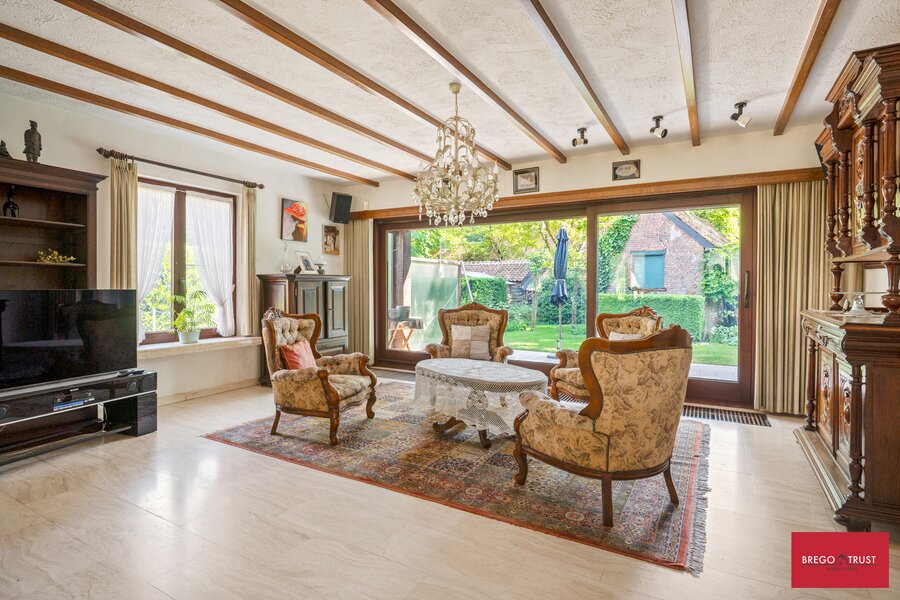 Bestaande uit een riante inkomhal met gastentoilet dewelke toegang verleent naar o.a. een sfeervolle ruime living op travertin vloeren en een grote eetkeuken, beiden uitgevende op een prachtige tuin met terras, veel privacy en een authentiek bakhuis. Tevens vinden we op het gelijkvloers één grote slaapkamer en ruime badkamer alsook de wasplaats en een ruime dubbele inpandige garage met sectionale poorten. Via de karaktervolle trappenhal bereiken we een droge ruime kelder en op de verdieping vinden we twee grote slaapkamers met een tweede badkamer voorzien van douche. Apart nachttoilet en vervolgens nog twee zeer ruime afgemaakte zolderkamers waar men eenvoudig nog extra kamers van kan maken ofwel als hobbyruimtes kan gebruiken. De verzorgde sfeervolle tuin met karaktervolle volwassen aanplantingen beschikt eveneens over een authentiek bakhuis hetwelk ook als tuinberging geschikt is. Putwater is ook aanwezig.