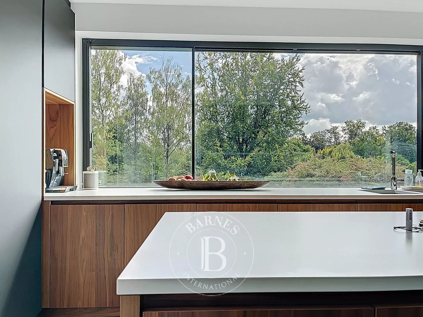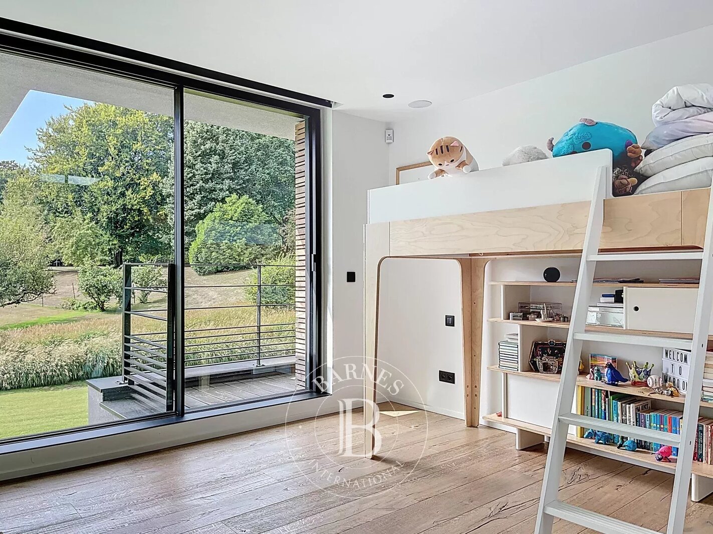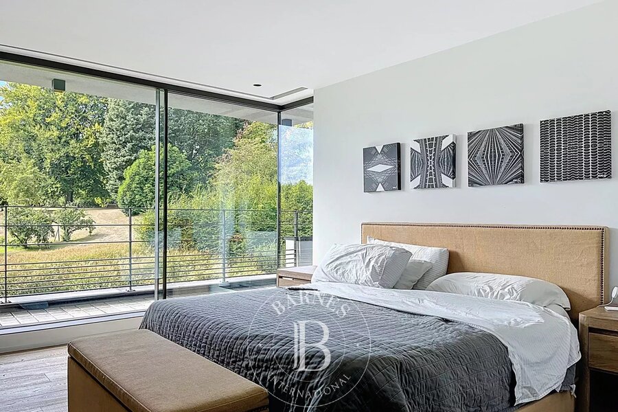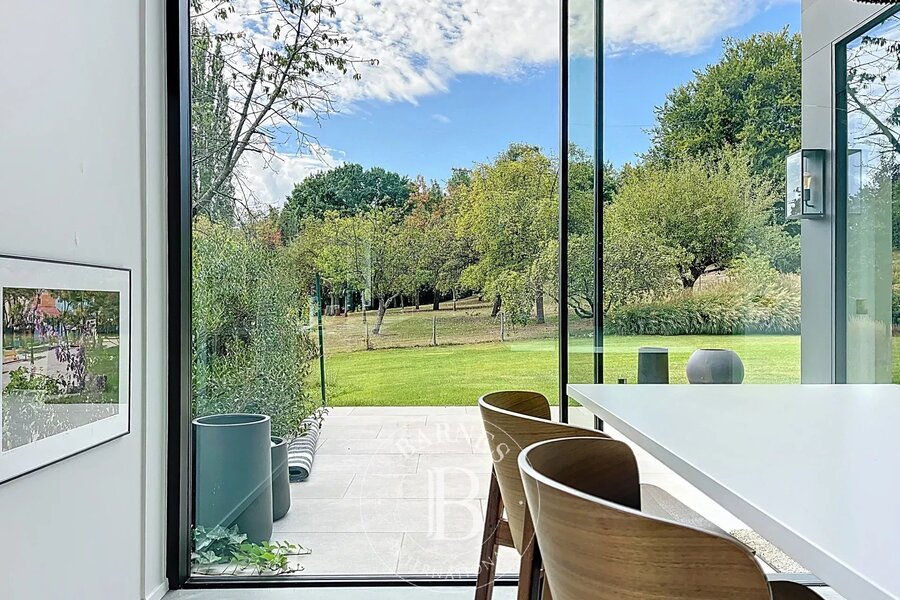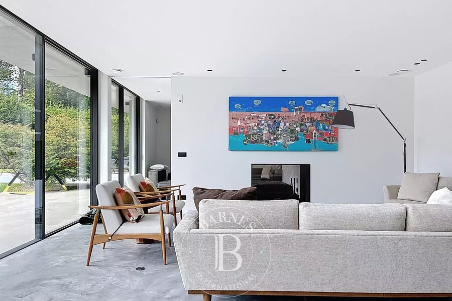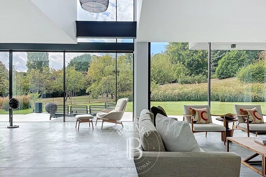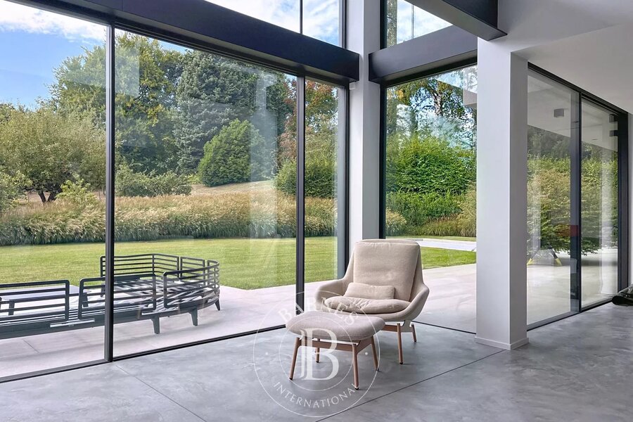Op de begane grond geeft de inkomhal uit op de woonkamer, met zijn zorgvuldig ontworpen volumes en lichtinval. Iets verder naar achteren is er een tv-lounge met een dubbelzijdige gaskookplaat en een eigentijdse keuken van topklasse en een bijkeuken. Het geheel geeft uit op de tuin en het terras op het zuidwesten. Het huis heeft een buitenzwembad en toegang tot een tennisbaan.