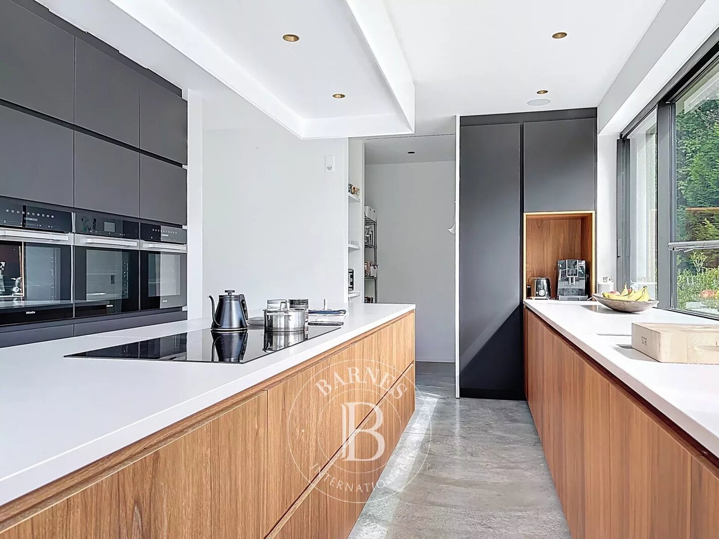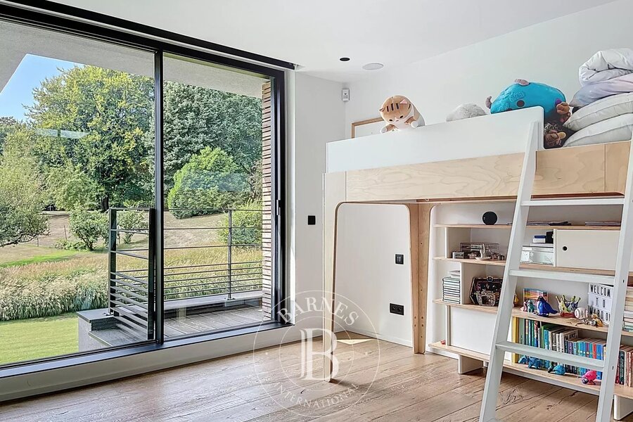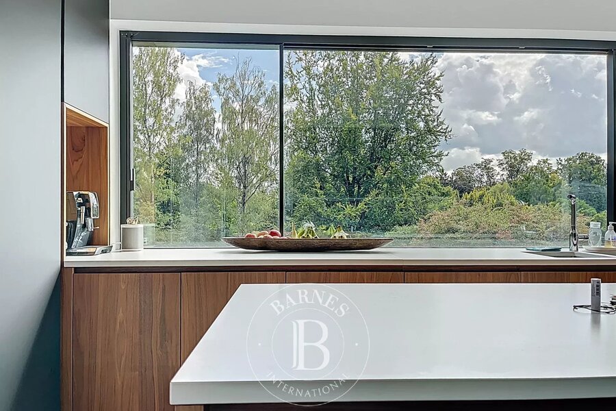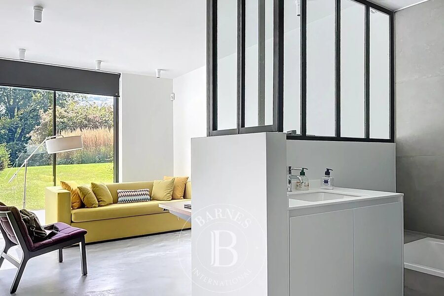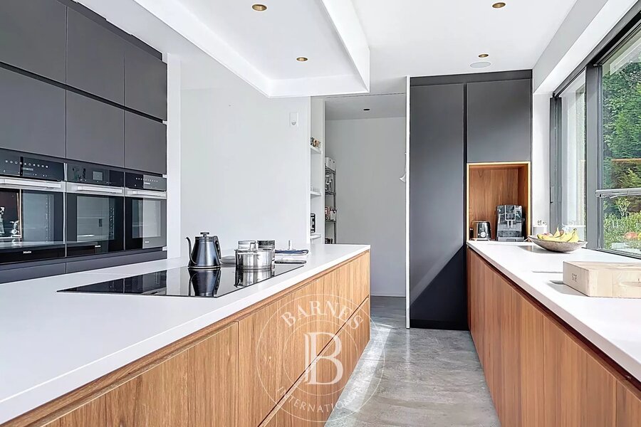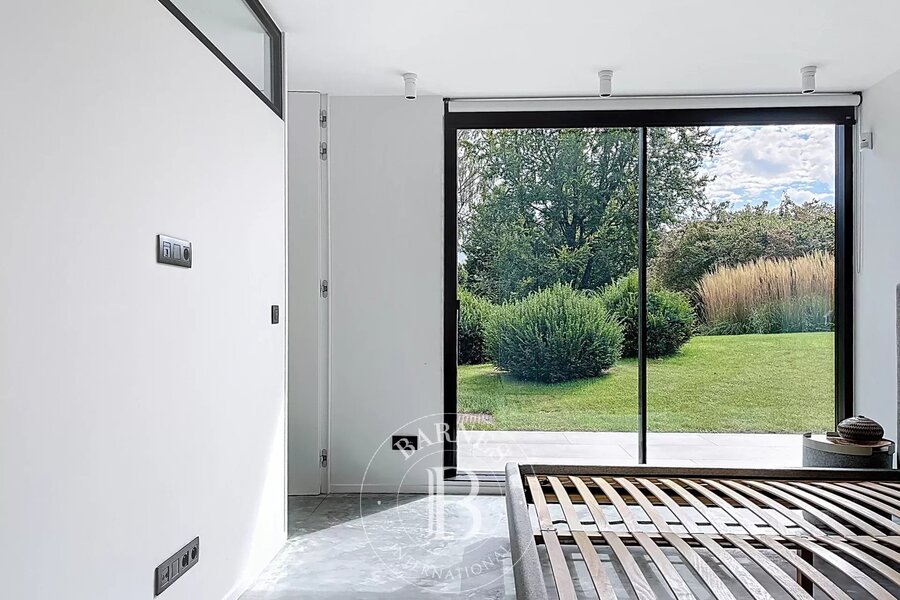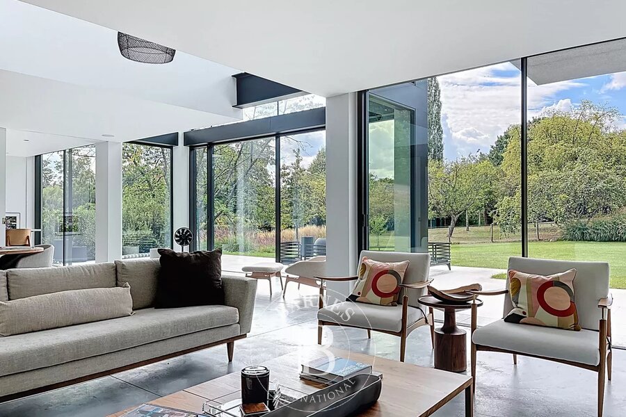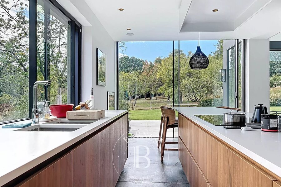 Op de begane grond geeft de inkomhal uit op de woonkamer, met zijn zorgvuldig ontworpen volumes en lichtinval. Iets verder naar achteren is er een tv-lounge met een dubbelzijdige gaskookplaat en een eigentijdse keuken van topklasse en een bijkeuken. Het geheel geeft uit op de tuin en het terras op het zuidwesten. Het huis heeft een buitenzwembad en toegang tot een tennisbaan.