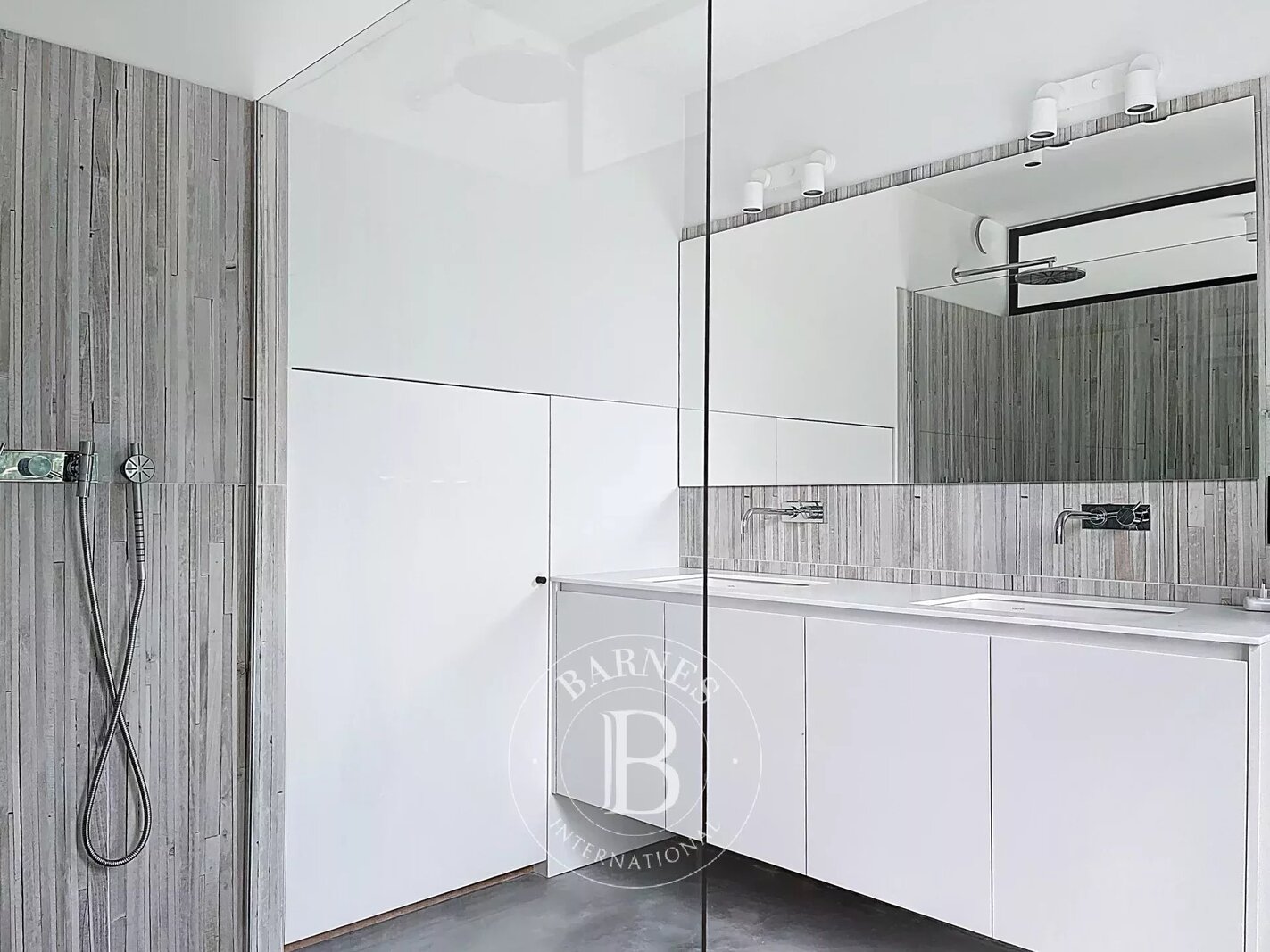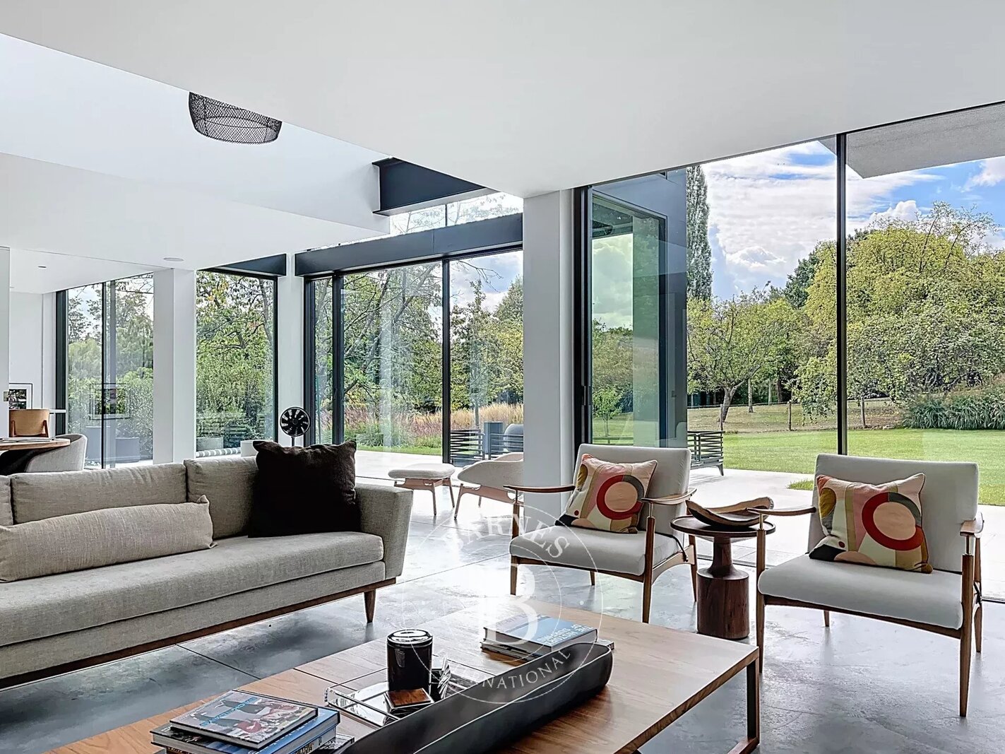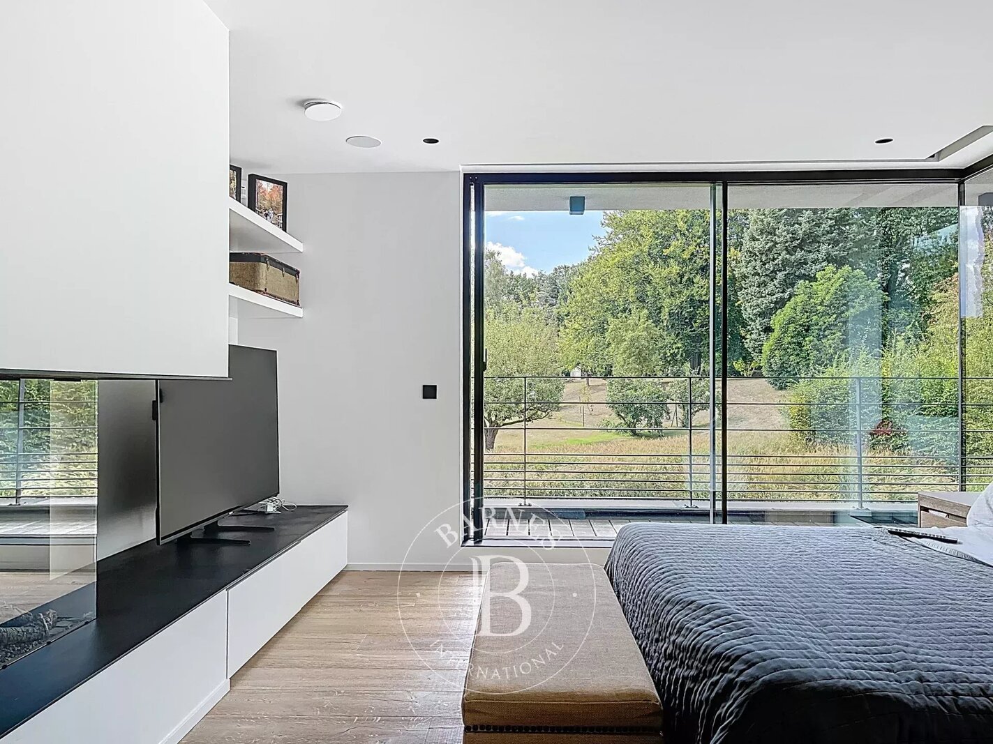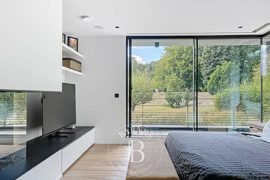 Op de begane grond geeft de inkomhal uit op de woonkamer, met zijn zorgvuldig ontworpen volumes en lichtinval. Iets verder naar achteren is er een tv-lounge met een dubbelzijdige gaskookplaat en een eigentijdse keuken van topklasse en een bijkeuken. Het geheel geeft uit op de tuin en het terras op het zuidwesten. Het huis heeft een buitenzwembad en toegang tot een tennisbaan.