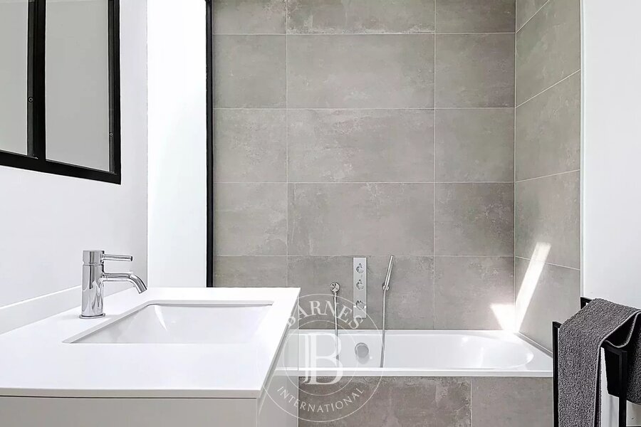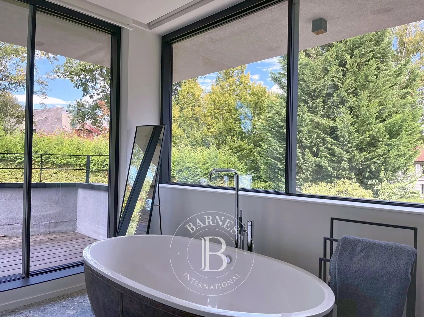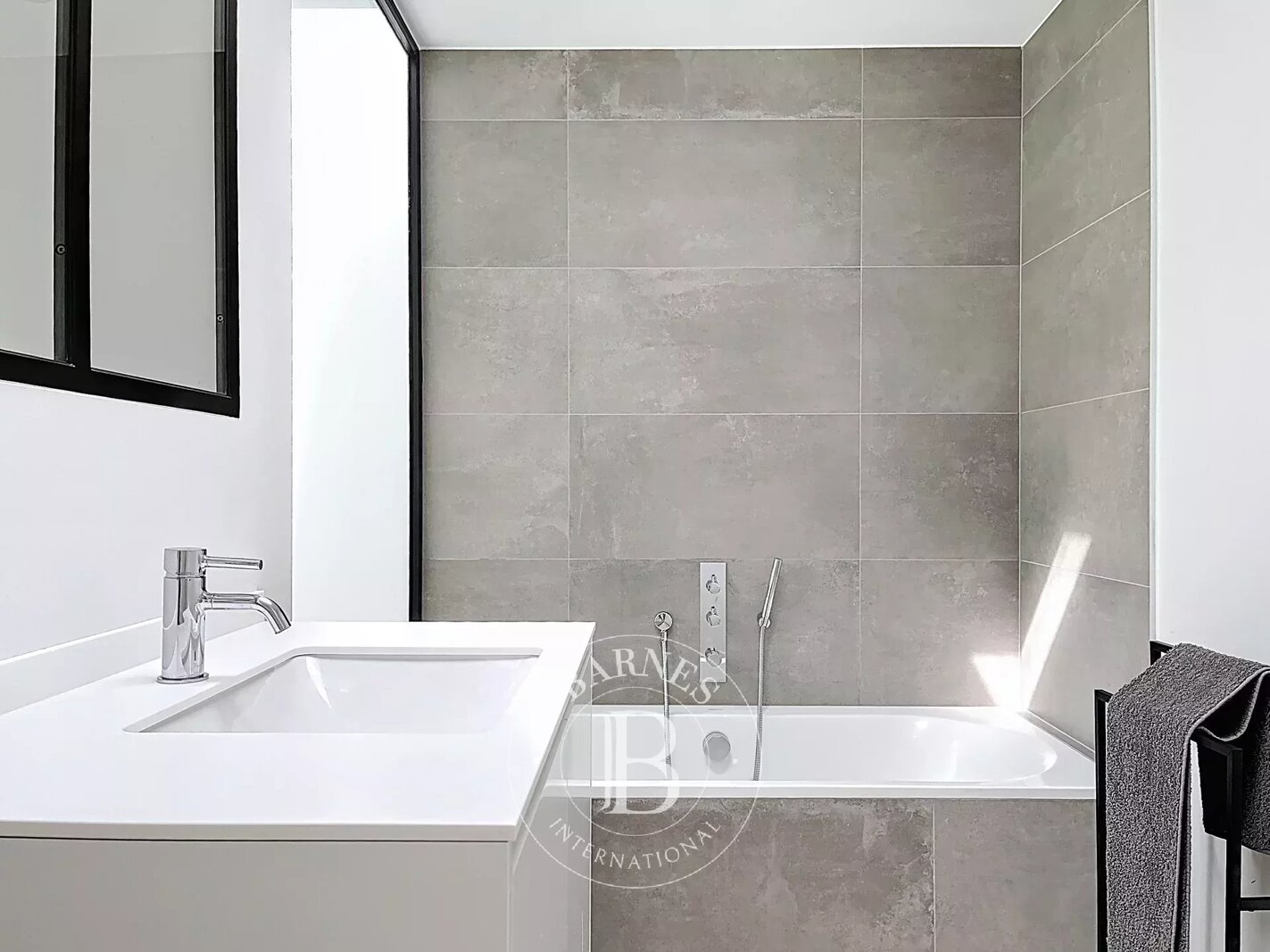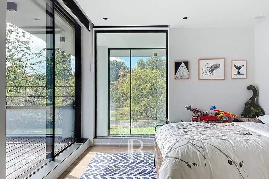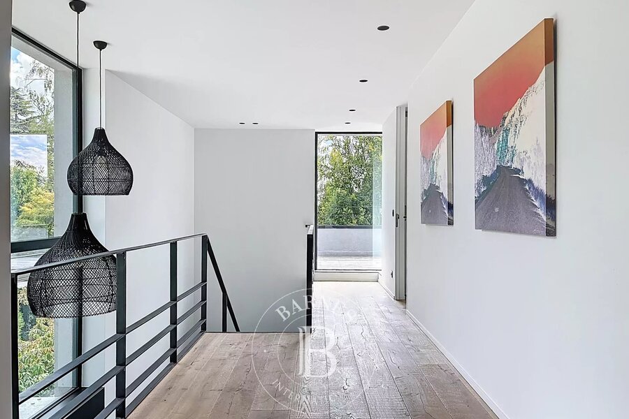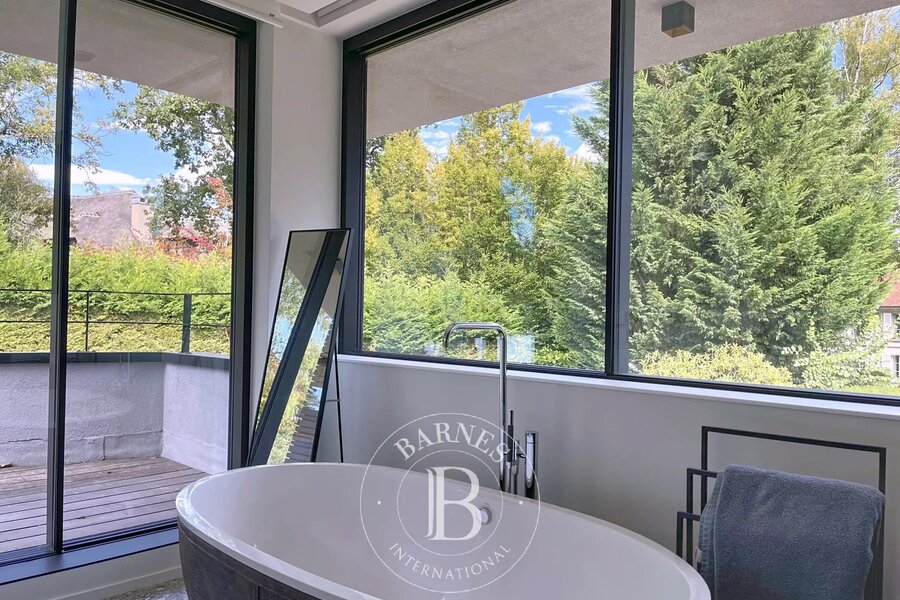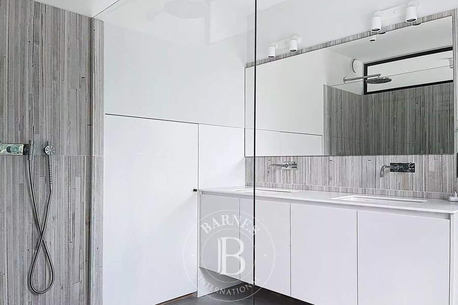 Op de begane grond geeft de inkomhal uit op de woonkamer, met zijn zorgvuldig ontworpen volumes en lichtinval. Iets verder naar achteren is er een tv-lounge met een dubbelzijdige gaskookplaat en een eigentijdse keuken van topklasse en een bijkeuken. Het geheel geeft uit op de tuin en het terras op het zuidwesten. Het huis heeft een buitenzwembad en toegang tot een tennisbaan.