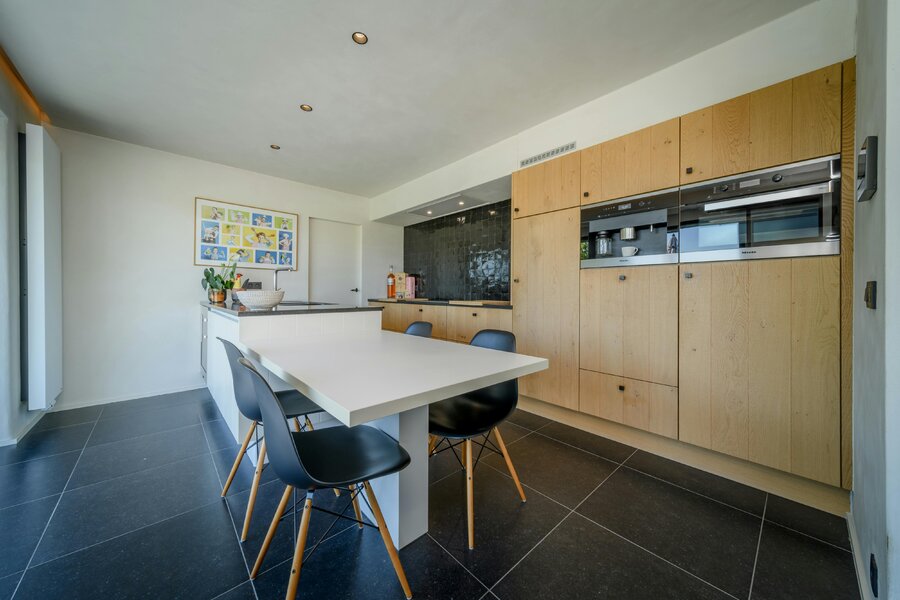- op maat gemaakte keuken met oa inductiekookplaat, vaatwas, oven, koelkast, wijnkoelkast, koffiemachine, dampkap en dubbele spoelbak