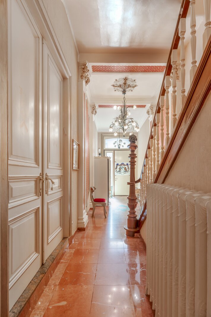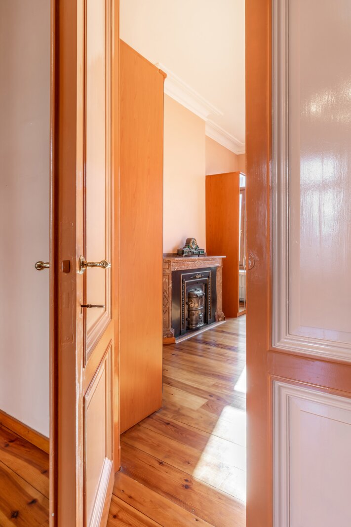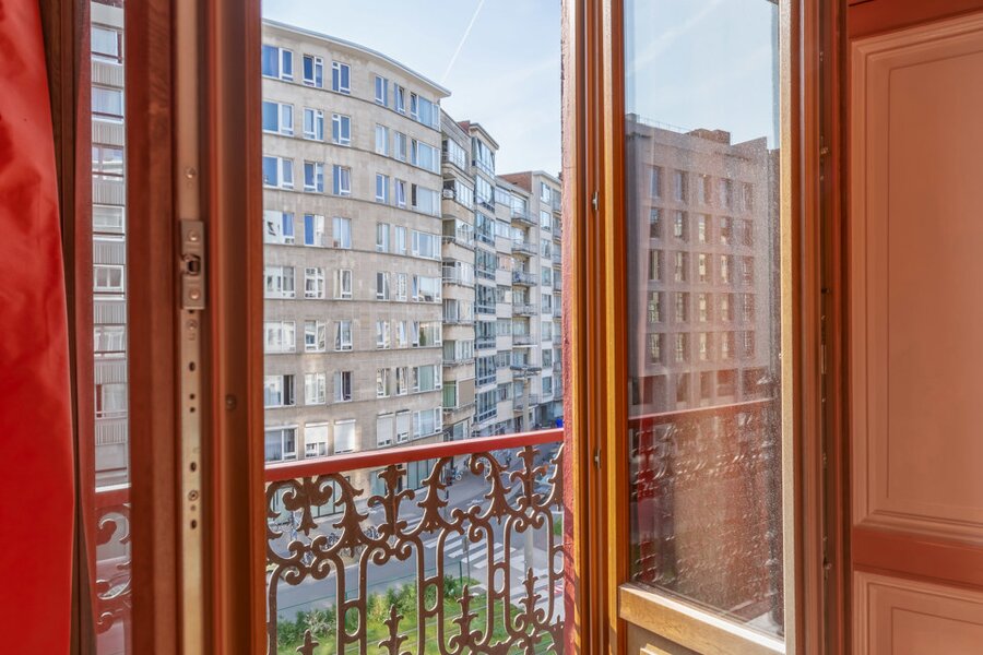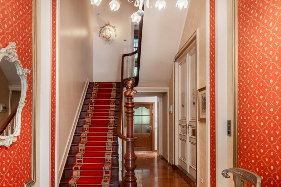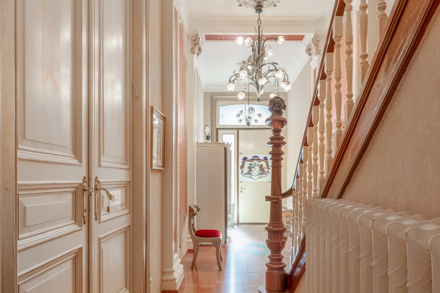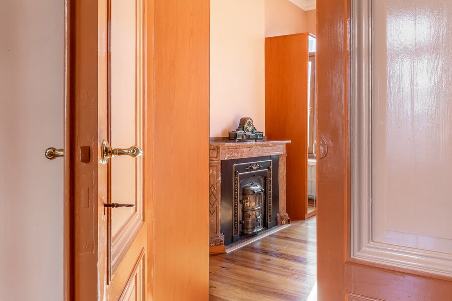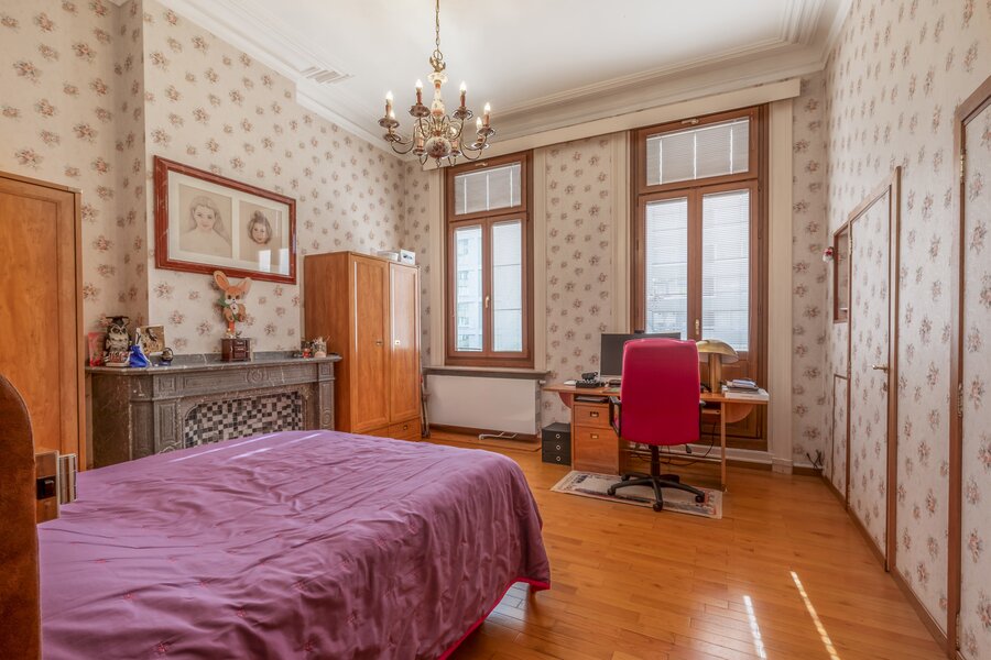 De imposante inkomhal en het gastentoilet zetten de toon voor wat de rest van de woning te bieden heeft. Via de geschilderde dubbele eiken deur betreedt u de leefruimte, waar het originele visgraatparket en twee indrukwekkende marmeren open haarden de aandacht trekken. Daarnaast bevindt zich een prachtige eetruimte met directe toegang tot een moderne keuken, die hypergeïnstalleerd is met de nieuwste Siemens-toestellen. Achter de keuken en de eetruimte ligt een gezellige veranda die uitgeeft op een charmante stadstuin.