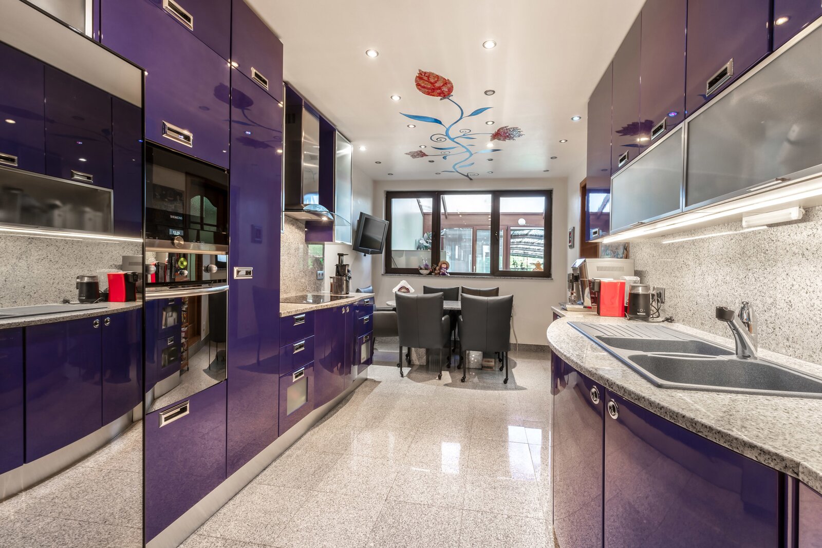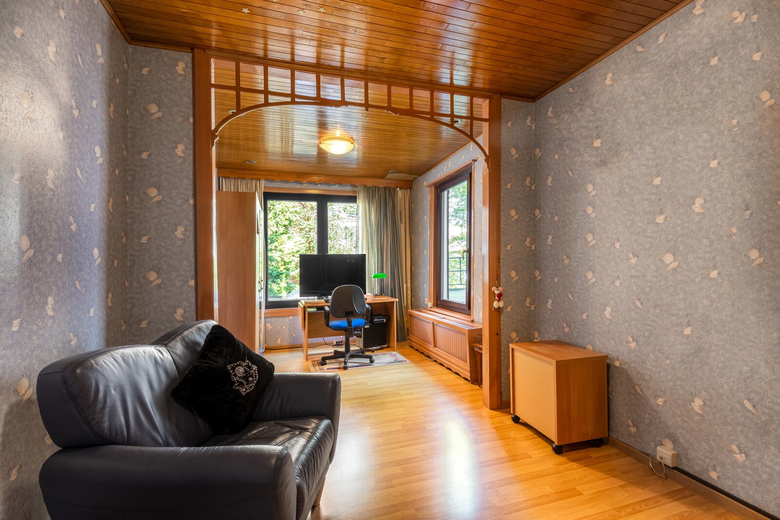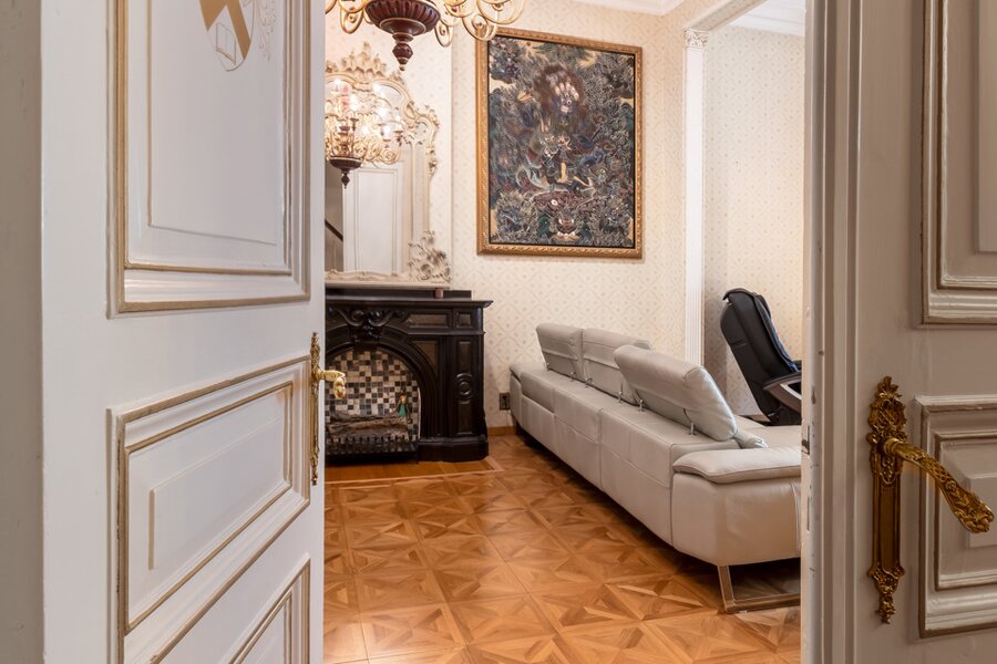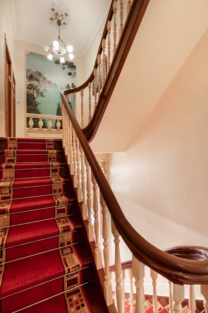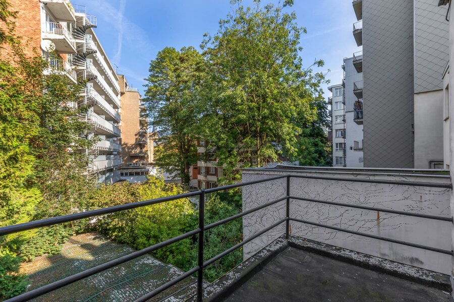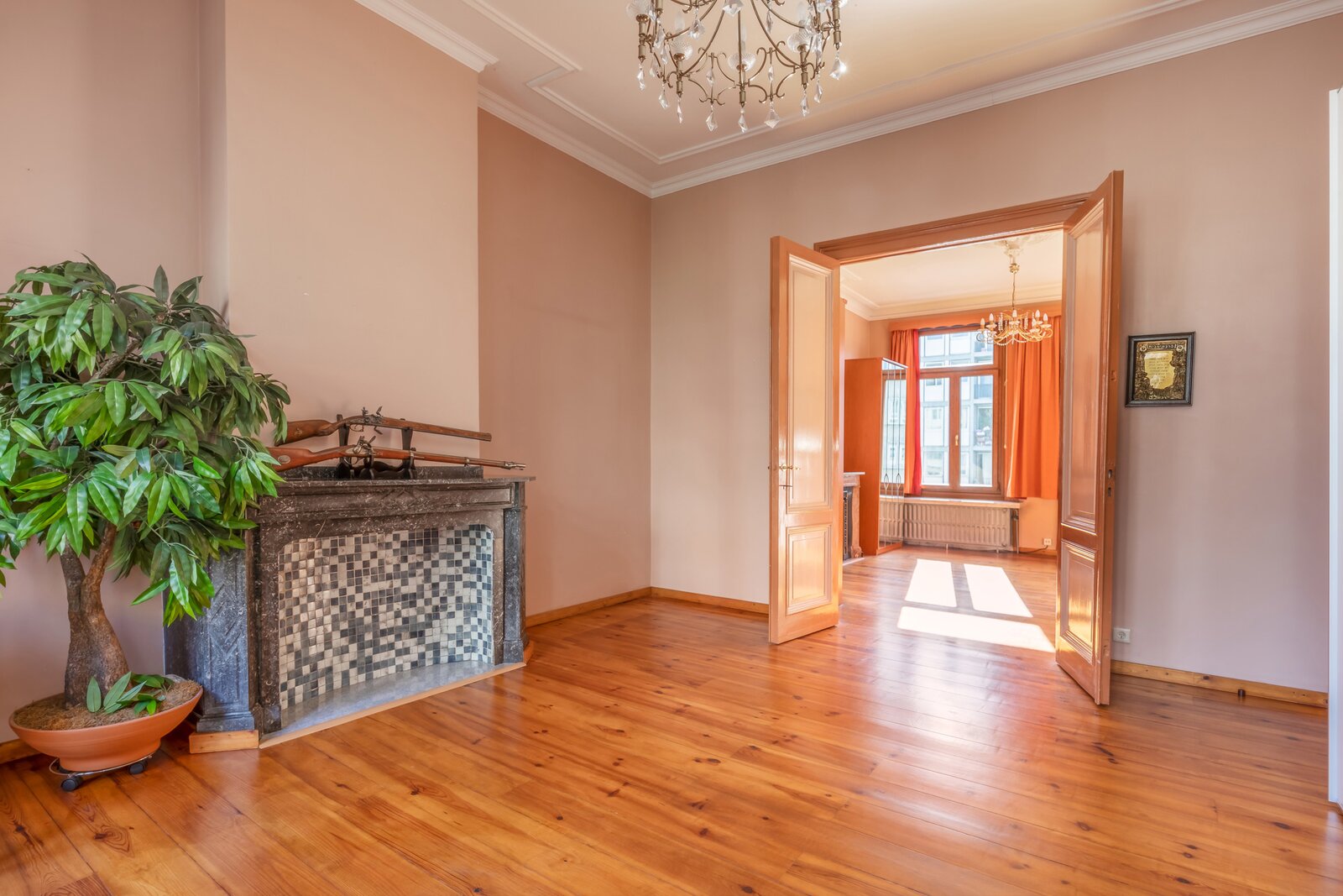 De imposante inkomhal en het gastentoilet zetten de toon voor wat de rest van de woning te bieden heeft. Via de geschilderde dubbele eiken deur betreedt u de leefruimte, waar het originele visgraatparket en twee indrukwekkende marmeren open haarden de aandacht trekken. Daarnaast bevindt zich een prachtige eetruimte met directe toegang tot een moderne keuken, die hypergeïnstalleerd is met de nieuwste Siemens-toestellen. Achter de keuken en de eetruimte ligt een gezellige veranda die uitgeeft op een charmante stadstuin.