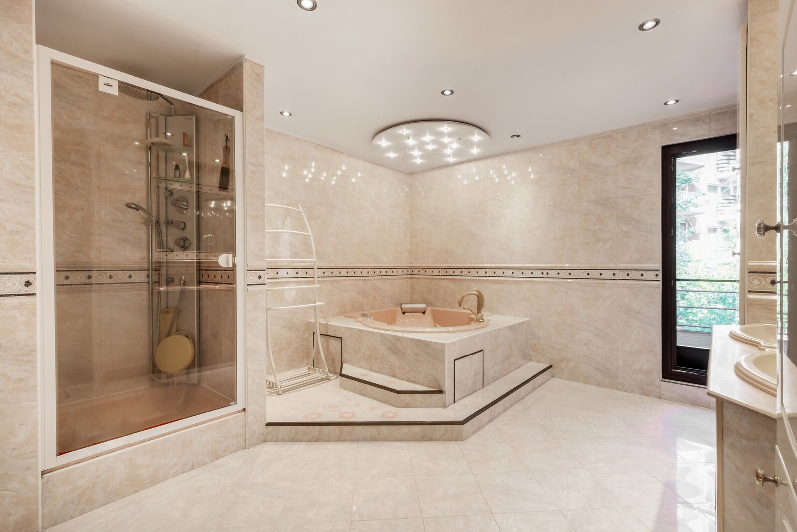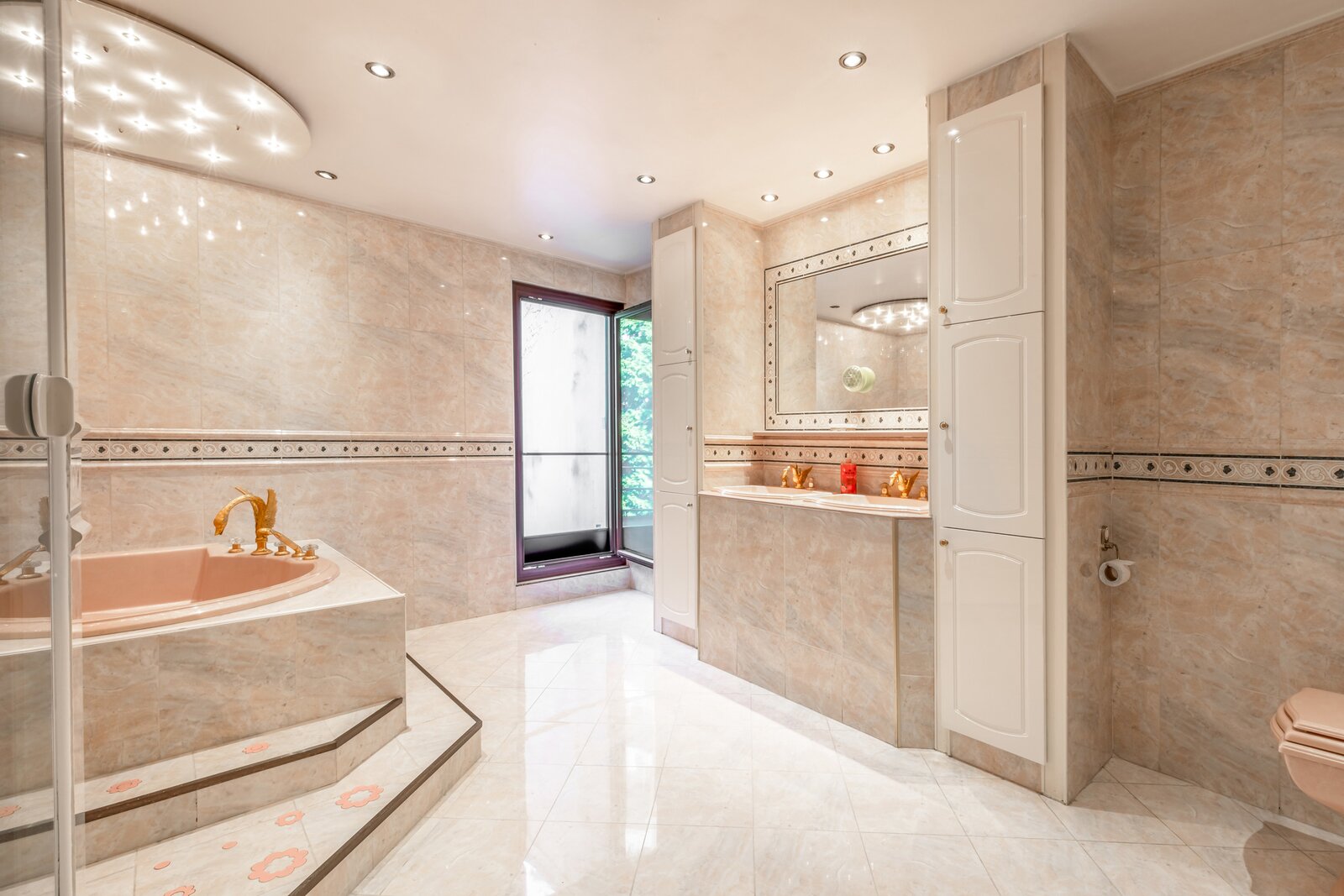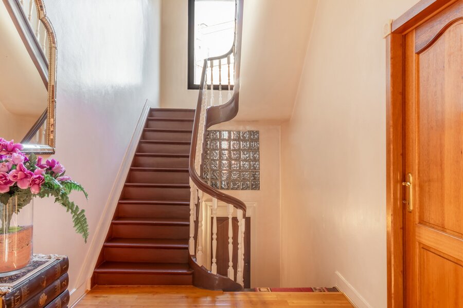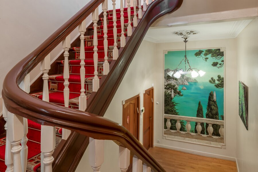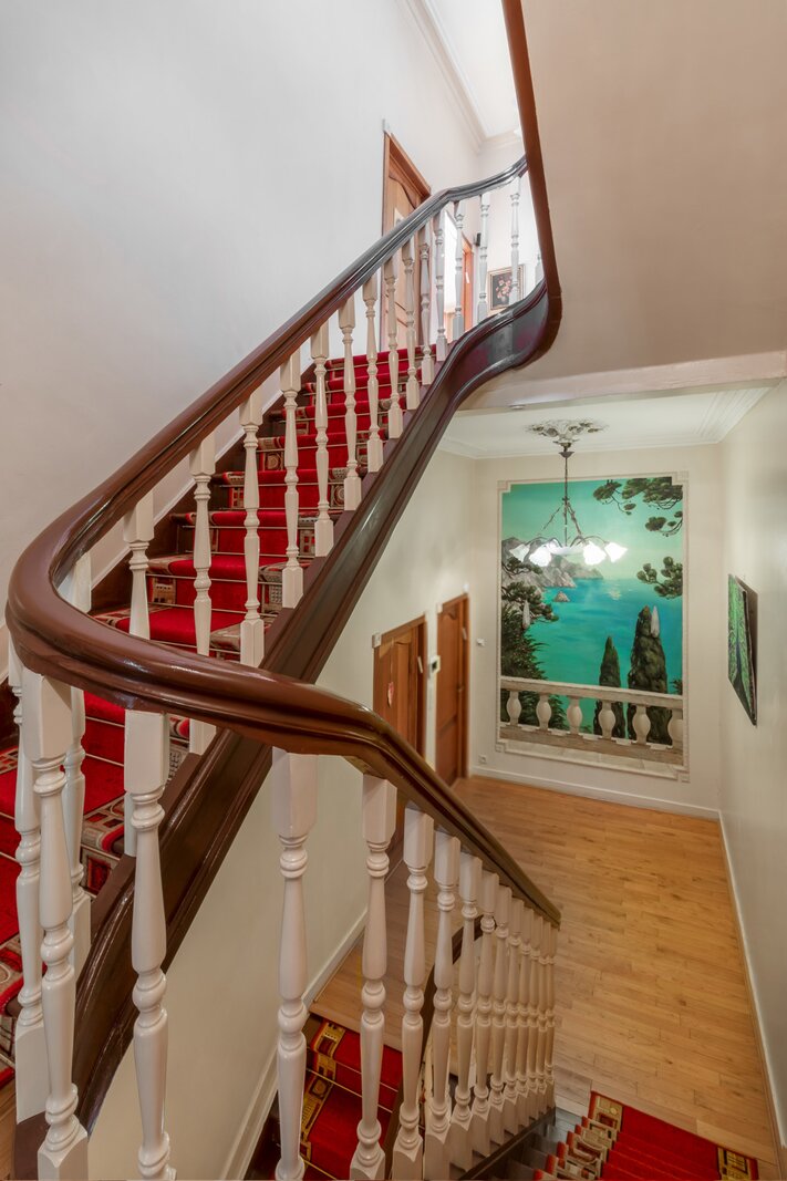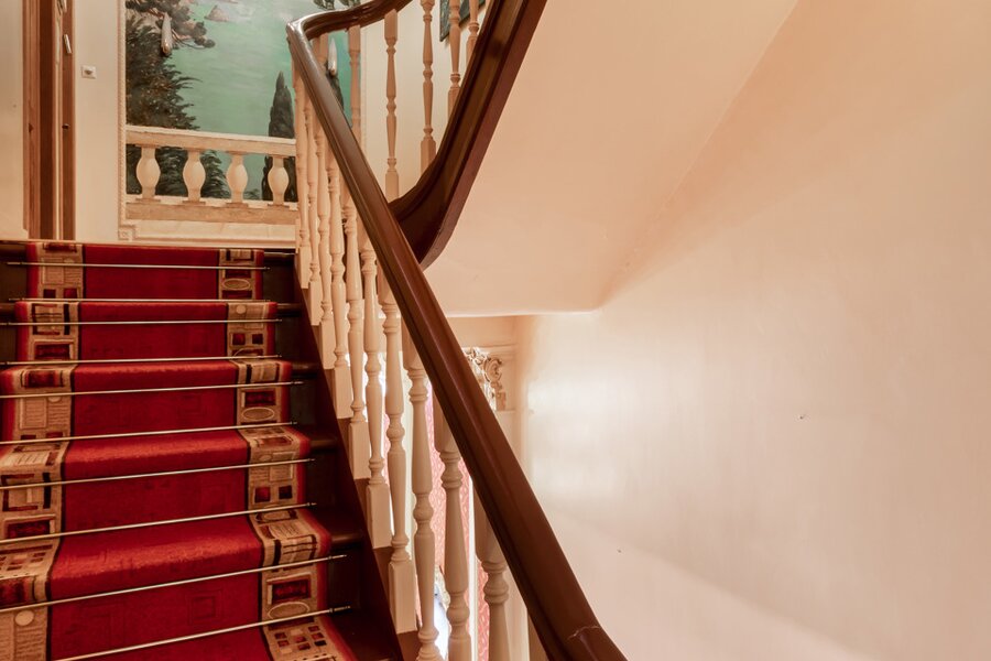 De eiken trap en de fresco's op de muren werden met oog voor detail gerestaureerd. Op de tussenverdieping bevindt zich een kamer met een zonnig terras, die momenteel in gebruik is als bureau en bovendien toegang biedt tot een badkamer met daarnaast een apart toilet. Op de eerste verdieping bevindt zich de royale master bedroom, met een ensuite badkamer volledig uitgevoerd in marmer. Grote dressingkasten bieden veel opbergruimte en praktisch gemak. Na het baden kunt u ontspannen op een nog aan te leggen terras. Op deze verdieping is er ook een tweede grote slaapkamer, eveneens voorzien van een open haard, een dressing en een ensuite badkamer. Een gezellig balkon maakt het plaatje compleet.