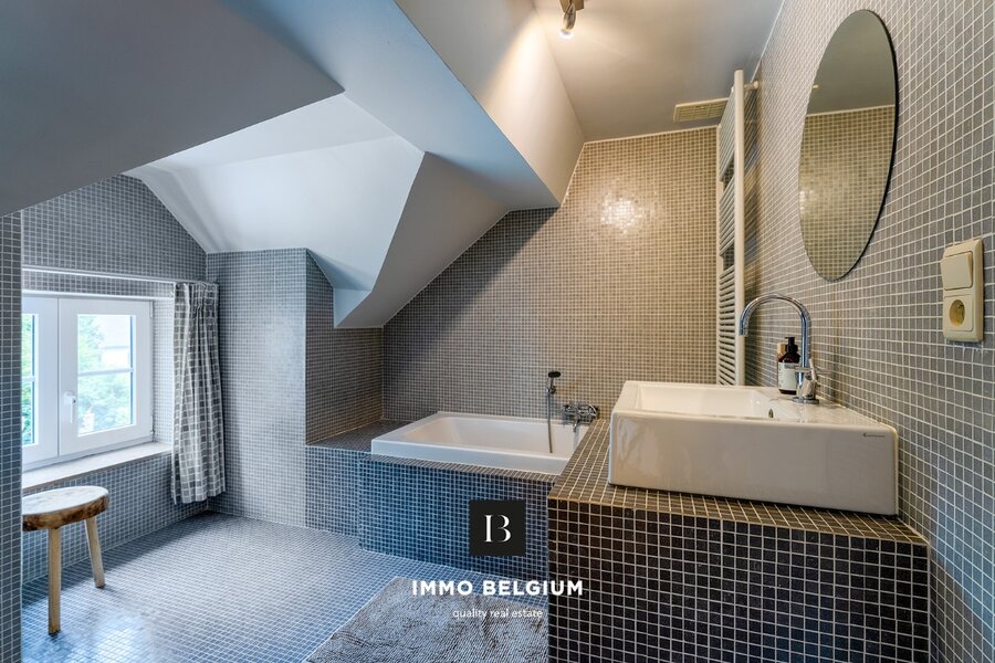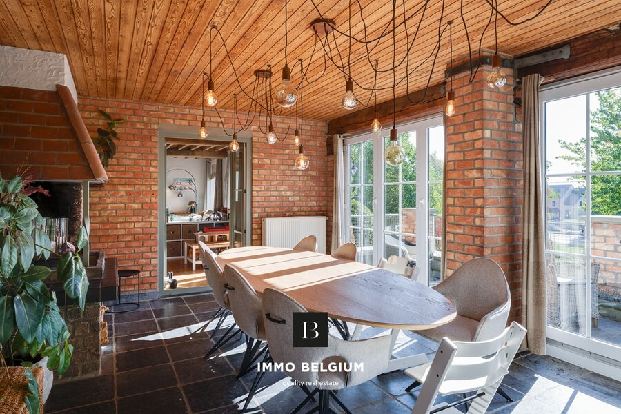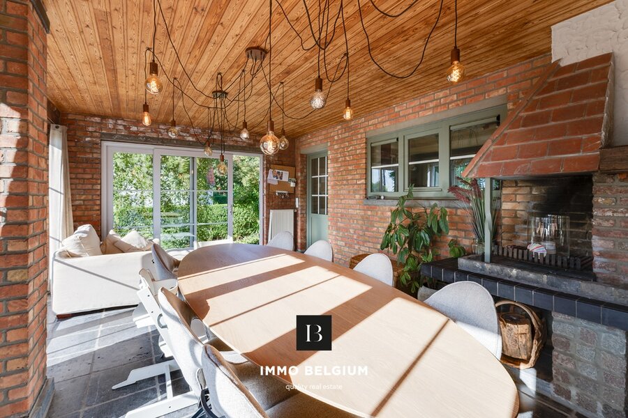 Het eigendom omvat een inkomhal met gastentoilet, een ruime woonkamer met veel mogelijkheden en rechtstreekse toegang tot de wintertuin die momenteel als eetplaats is ingericht, een goed uitgeruste keuken, een bureauruimte/slaapkamer, een terras aan de voorzijde en een privatieve tuin met terras achteraan. Op de eerste verdieping bevinden zich vier slaapkamers, waarvan één met badkamer ensuite, een afzonderlijke badkamer, een apart toilet en een bureauhoek op de overloop. De hoge plafonds en de vele raampartijen zorgen voor een aangename en lichte woonsfeer.