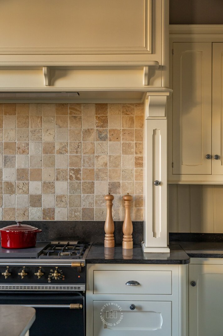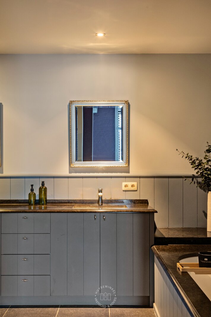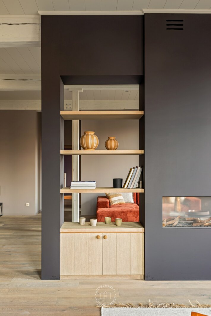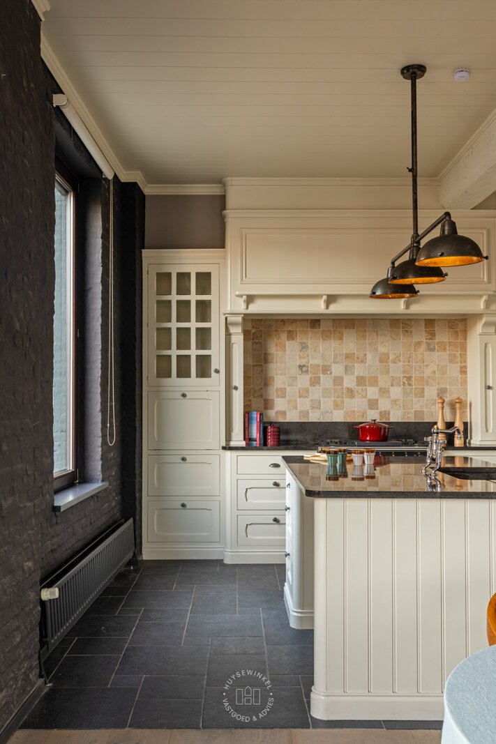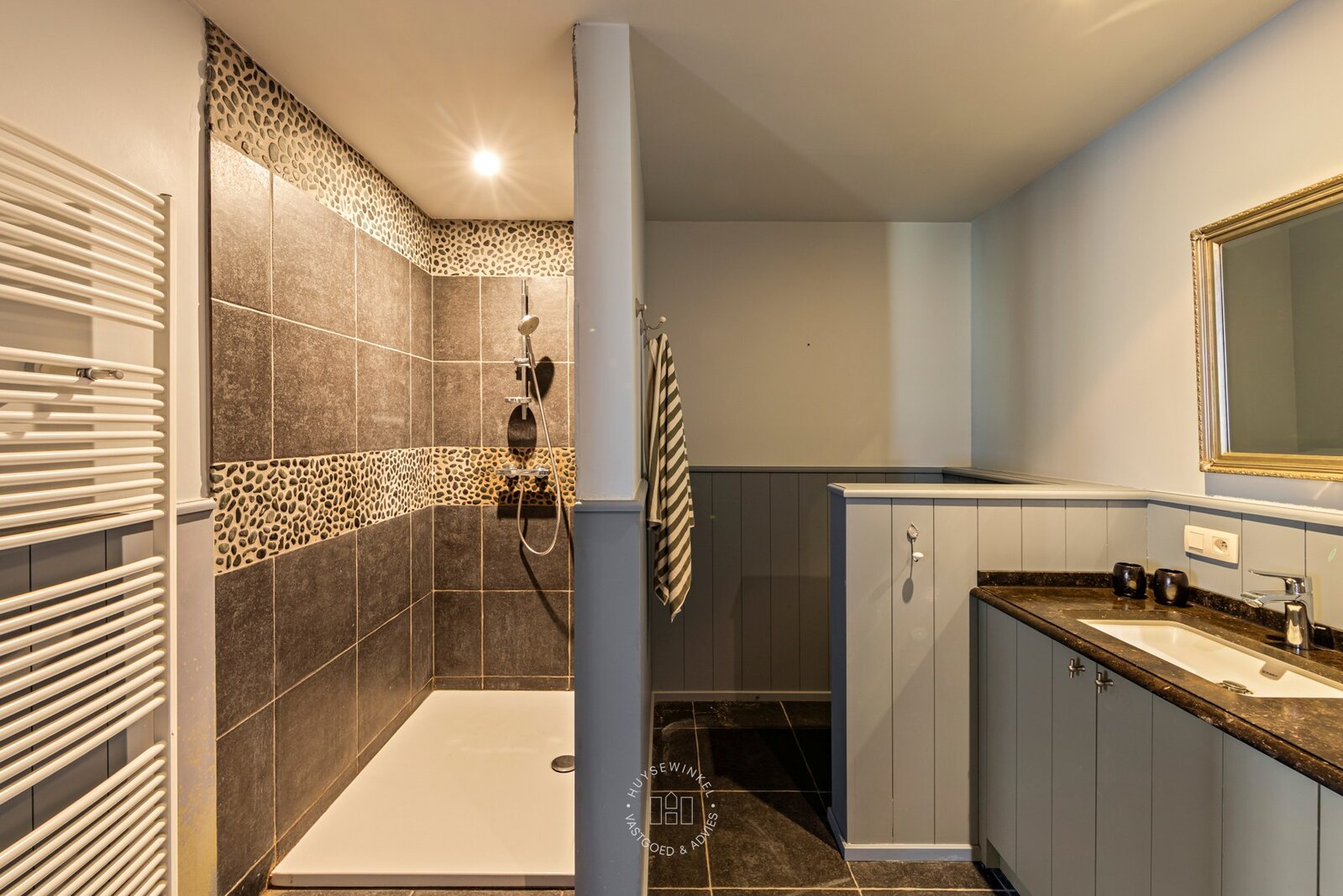 De open keuken met eiland is voorzien van de nodige toestellen, waaronder een Lacanche-vuur. Aansluitend is er plaats voor een royale tafel waar u gezellig kan dineren met gasten. Verder is er een dubbele zithoek, in het midden gescheiden door een kastenwand voorzien van een doorkijkgashaard.