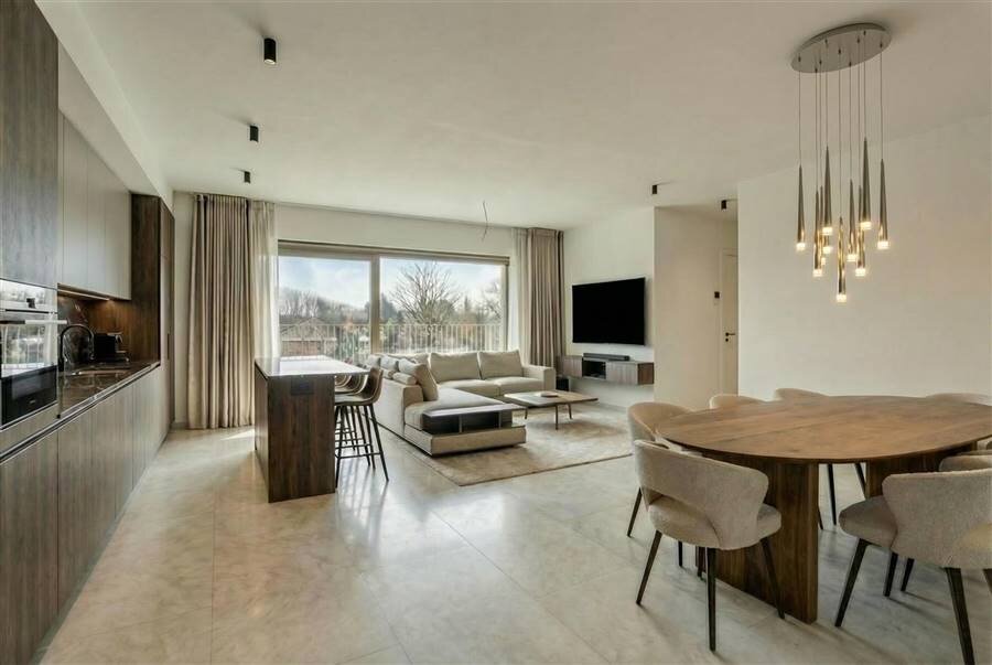 Met een bewoonbare oppervlakte van 103 m² beschikt het penthouse over een lichtrijke leefruimte met open keuken, die rechtstreeks uitgeeft op de terrassen. Dankzij de grote raampartijen geniet u hier van een aangename lichtinval en een mooi gevoel van ruimte.