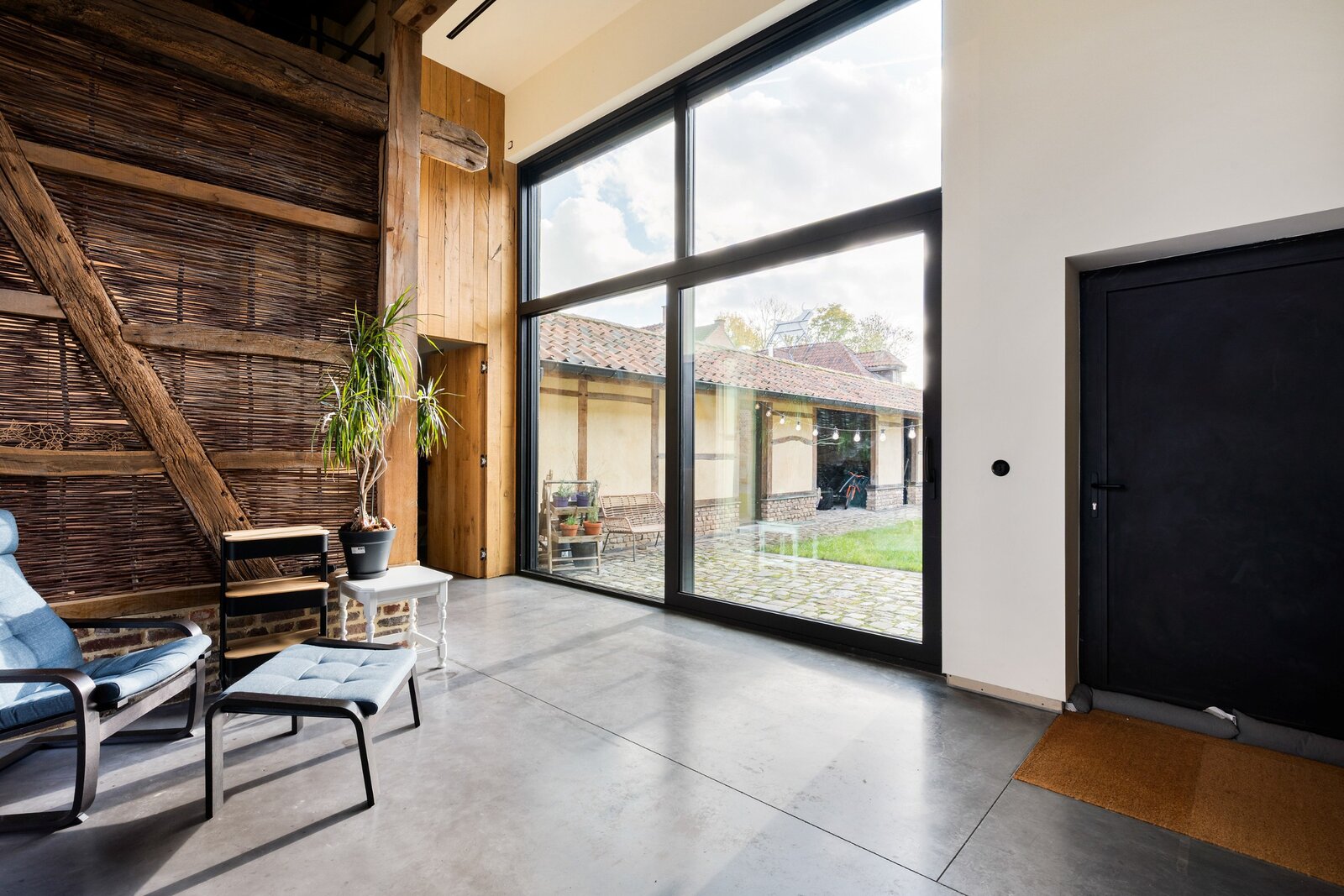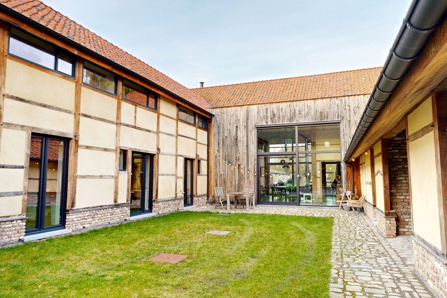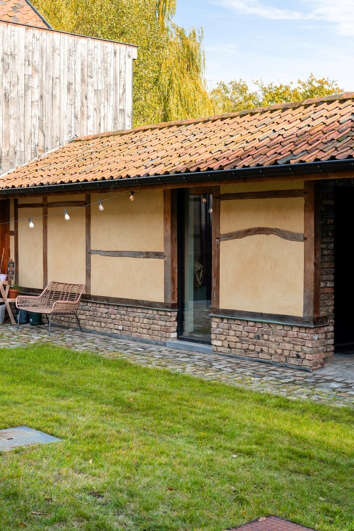 Georiënteerd op de ruime tuin vind je de voormalige vakwerkschuren, die met veel zorg voor detail en respect voor het erfgoed werden omgevormd tot een moderne, instapklare woning.