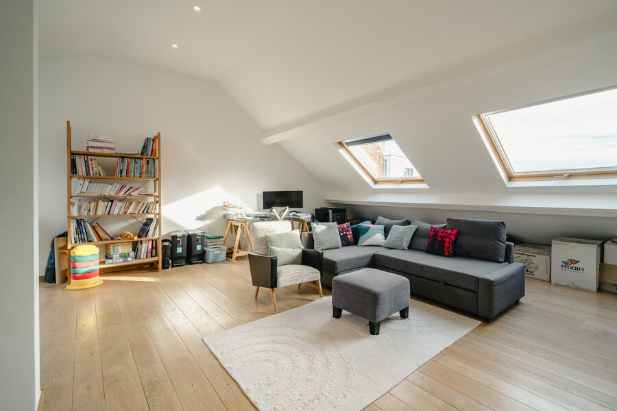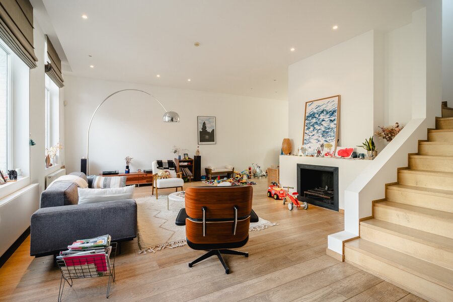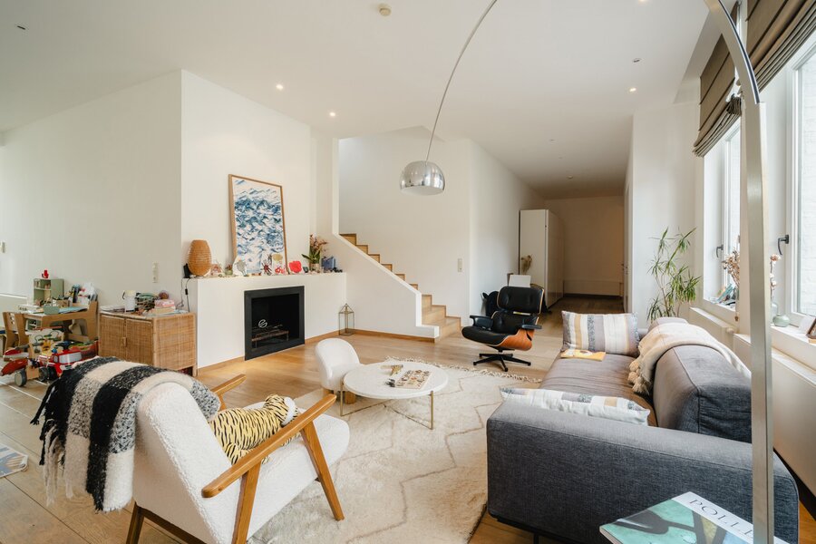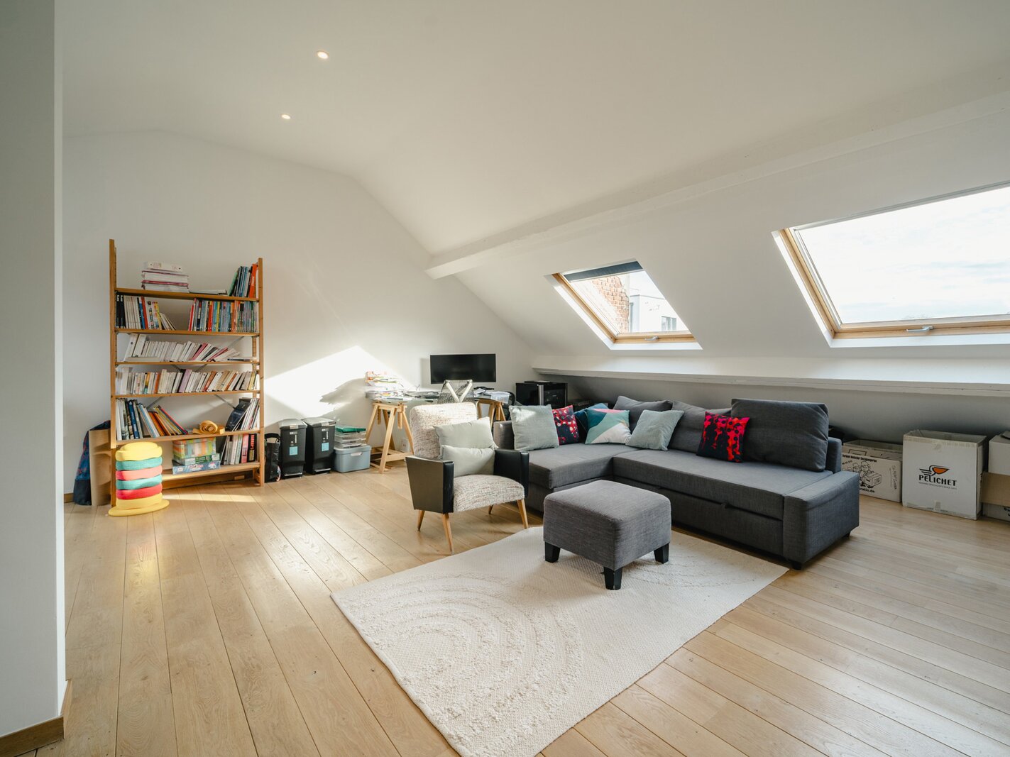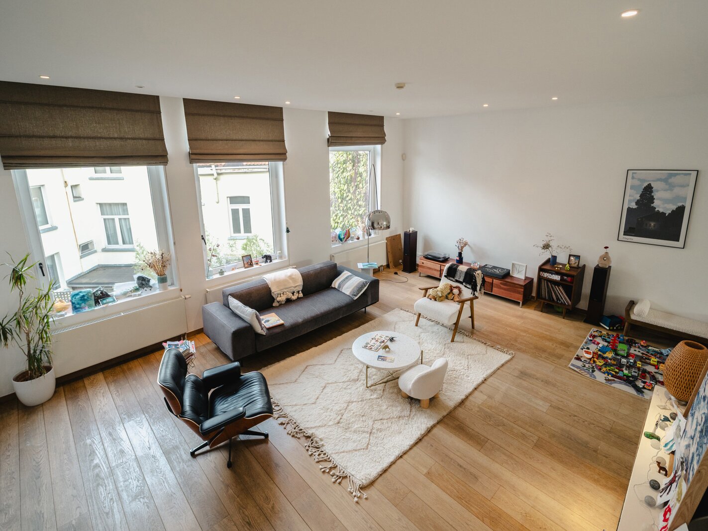 In een klein art-nouveaugebouw, gelegen op de 2e en 3e verdieping, komt het appartement uit op een inkomhal die leidt naar de leefruimtes in loftstijl. Deze omvatten een volledig uitgeruste keuken met kookeiland, die open is naar de eetkamer en woonkamer met open haard. De ruimte wordt gekenmerkt door hoge plafonds en veel natuurlijk licht dankzij grote ramen. Het slaapgedeelte bestaat uit een hoofdslaapkamer met een en-suite badkamer en twee andere slaapkamers die een doucheruimte delen. Boven biedt een ruime familiekamer of kantoor toegang tot het achterterras.