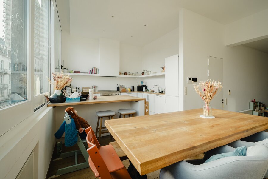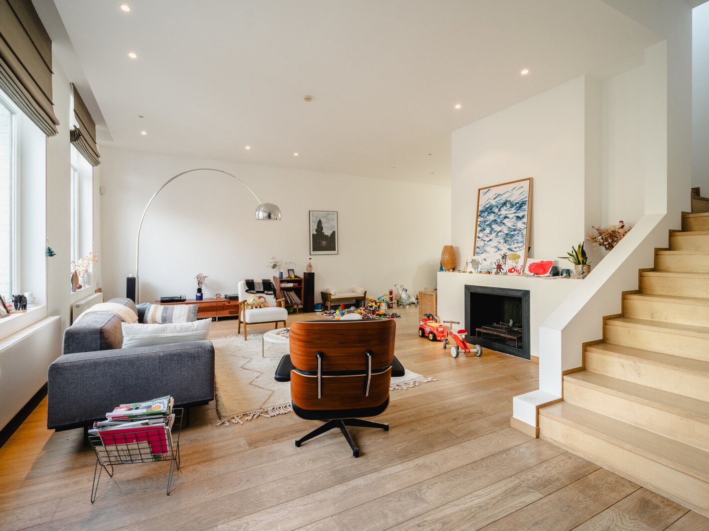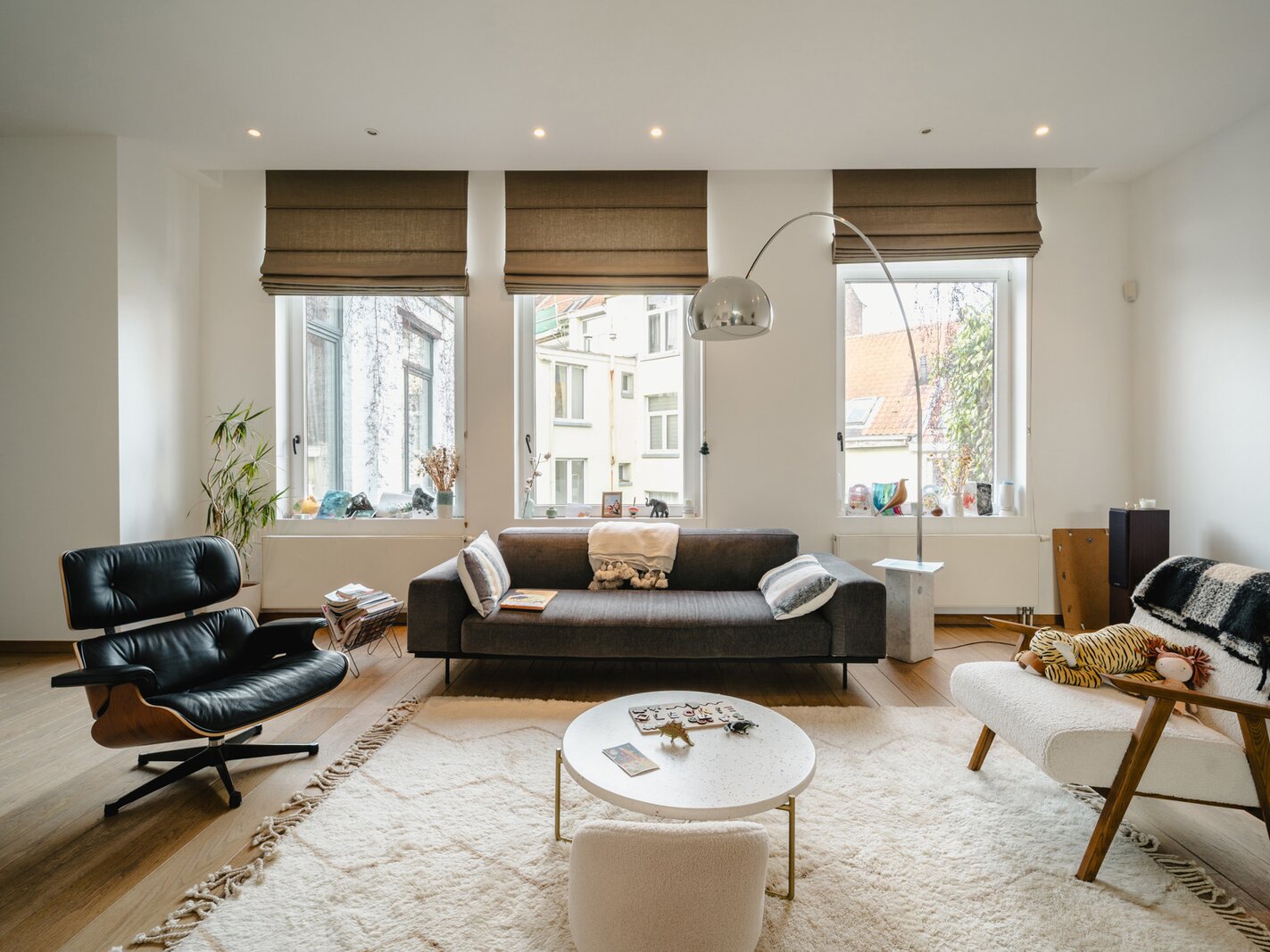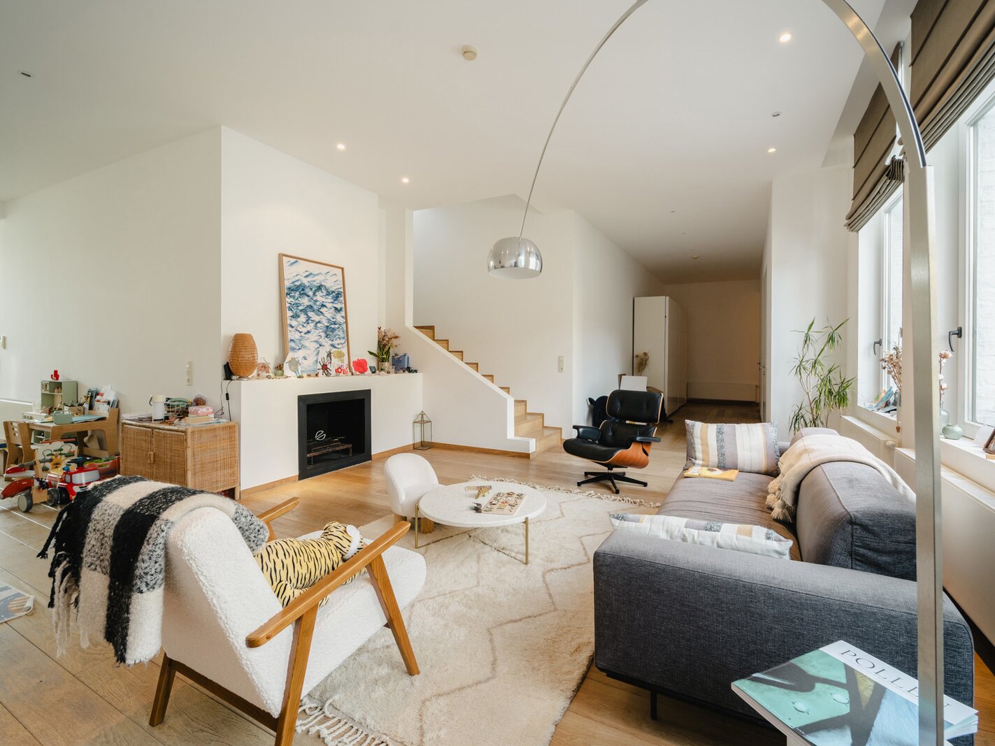 In een klein art-nouveaugebouw, gelegen op de 2e en 3e verdieping, komt het appartement uit op een inkomhal die leidt naar de leefruimtes in loftstijl. Deze omvatten een volledig uitgeruste keuken met kookeiland, die open is naar de eetkamer en woonkamer met open haard. De ruimte wordt gekenmerkt door hoge plafonds en veel natuurlijk licht dankzij grote ramen. Het slaapgedeelte bestaat uit een hoofdslaapkamer met een en-suite badkamer en twee andere slaapkamers die een doucheruimte delen. Boven biedt een ruime familiekamer of kantoor toegang tot het achterterras.