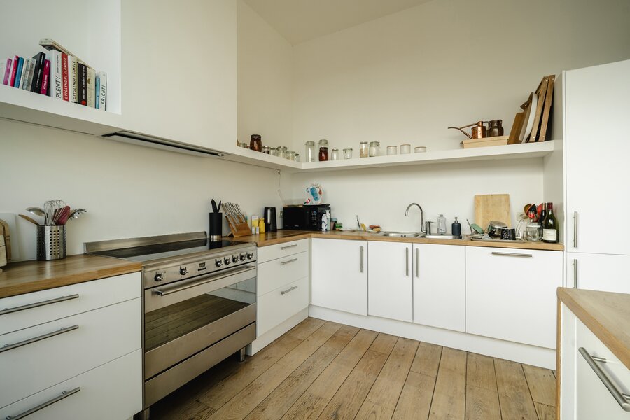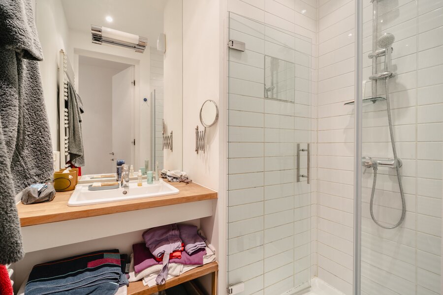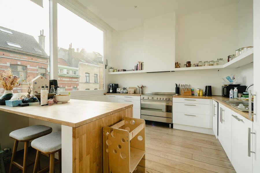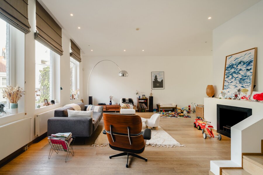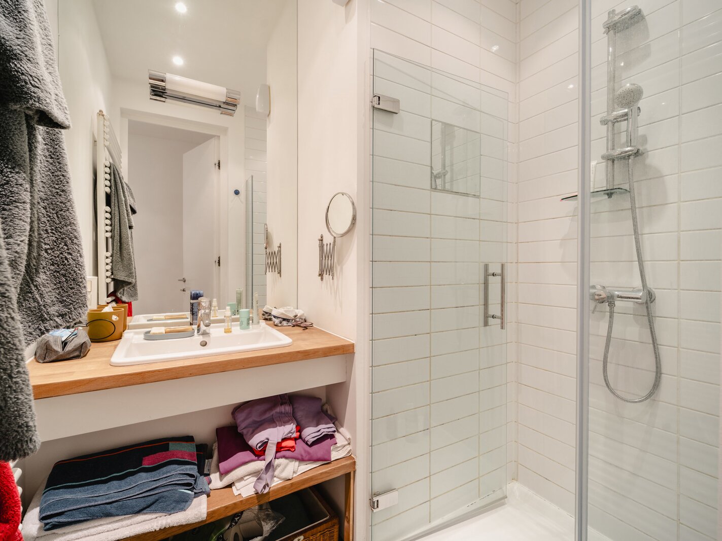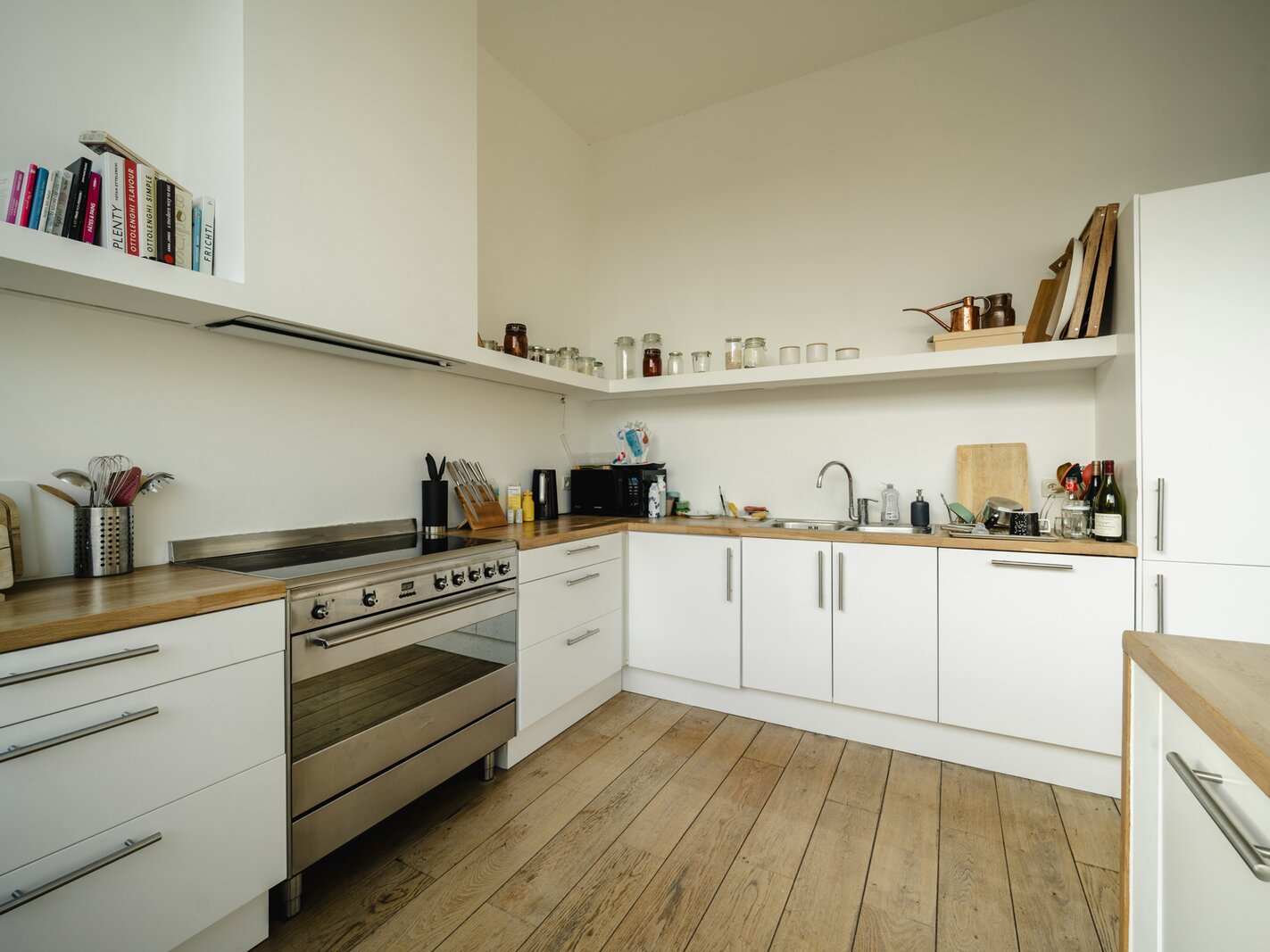 In een klein art-nouveaugebouw, gelegen op de 2e en 3e verdieping, komt het appartement uit op een inkomhal die leidt naar de leefruimtes in loftstijl. Deze omvatten een volledig uitgeruste keuken met kookeiland, die open is naar de eetkamer en woonkamer met open haard. De ruimte wordt gekenmerkt door hoge plafonds en veel natuurlijk licht dankzij grote ramen. Het slaapgedeelte bestaat uit een hoofdslaapkamer met een en-suite badkamer en twee andere slaapkamers die een doucheruimte delen. Boven biedt een ruime familiekamer of kantoor toegang tot het achterterras.