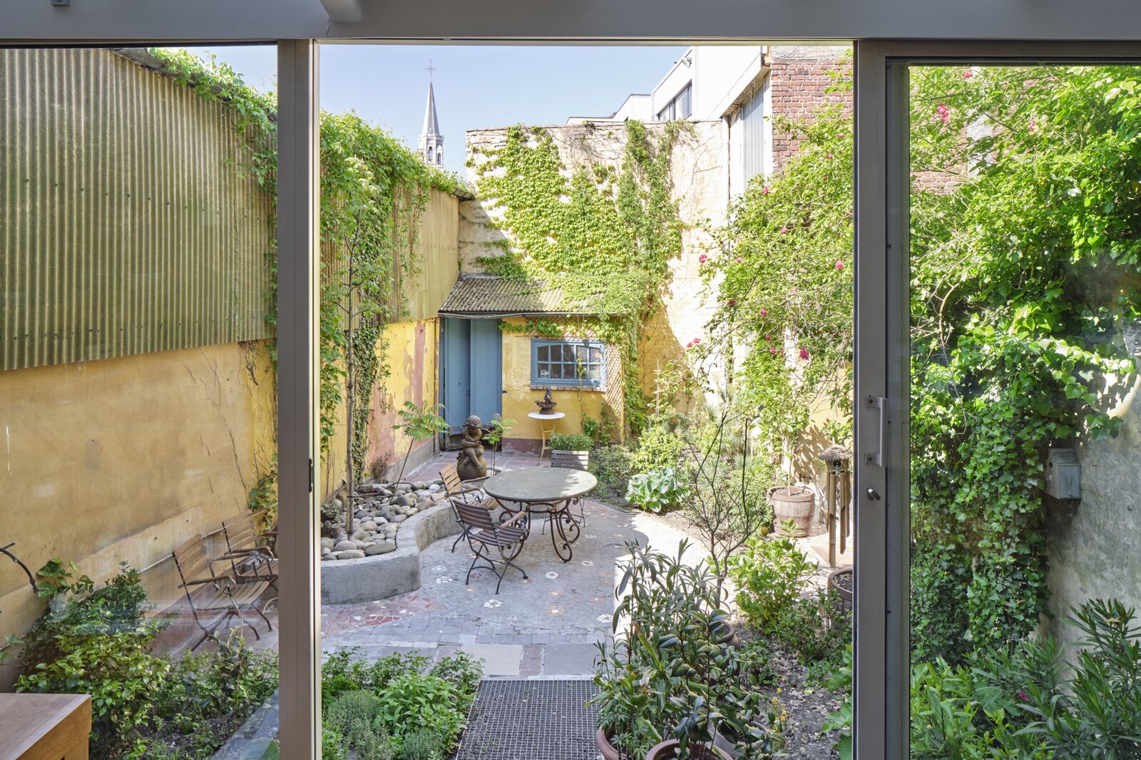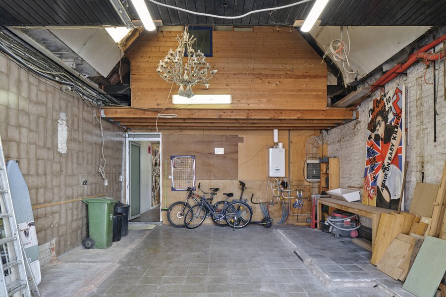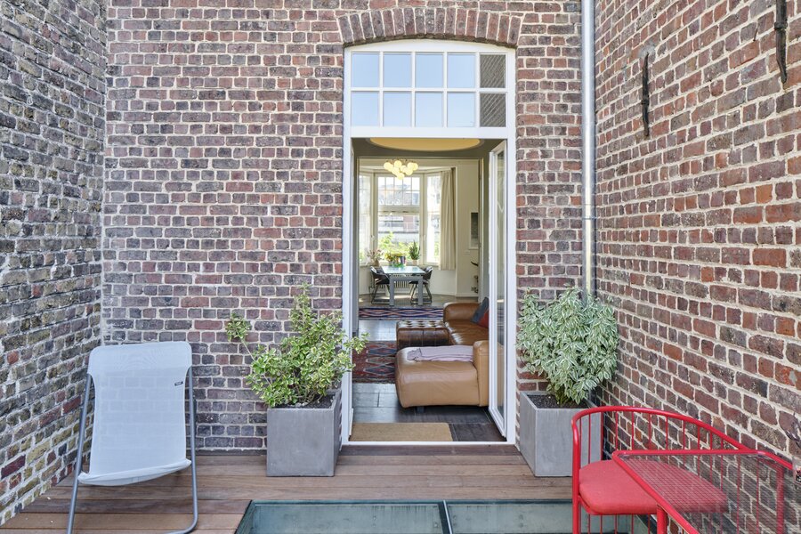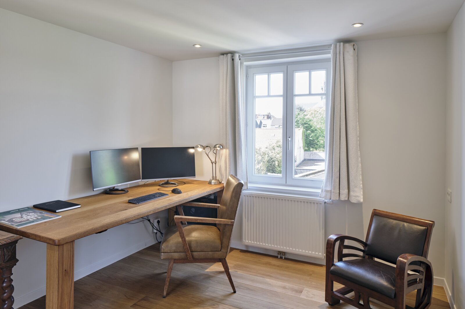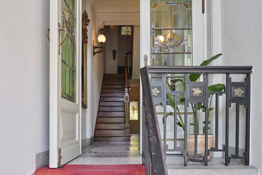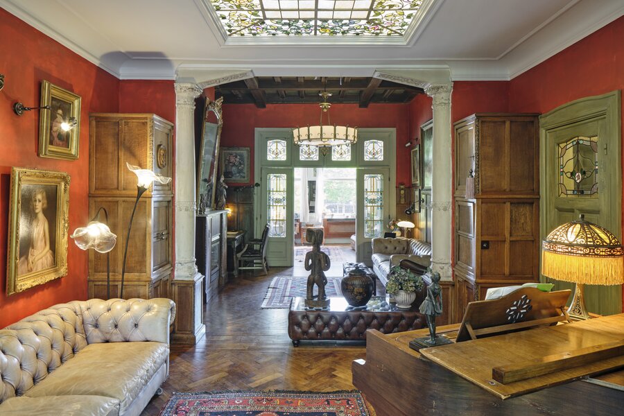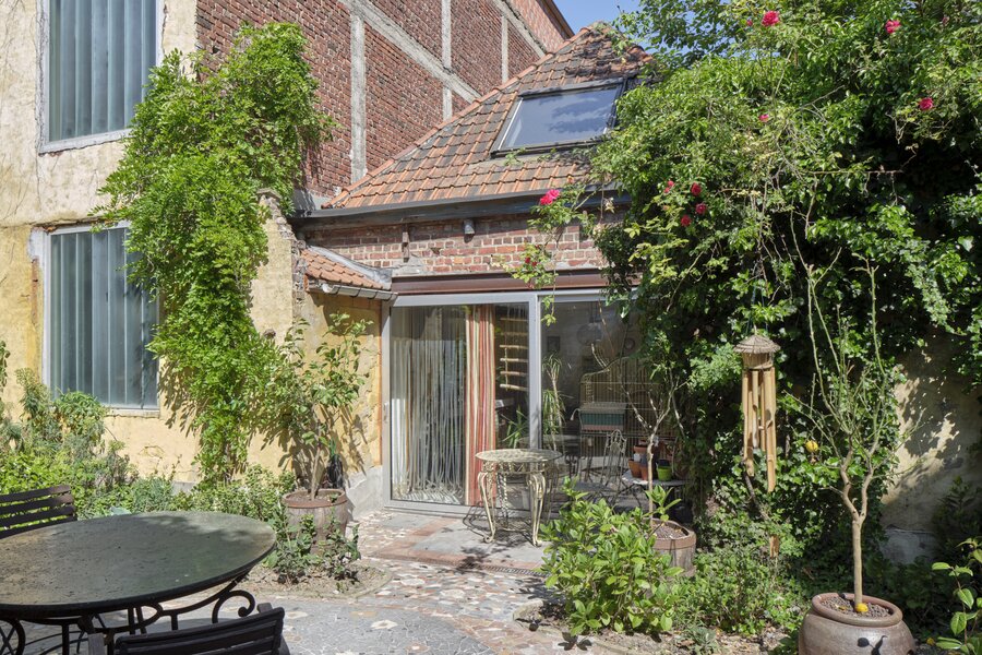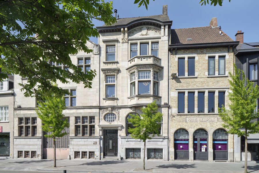 Aan het monumentale Stationsplein van Roeselare staat een unieke woning met uitzonderlijke architecturale waarde. Dit art-decoburgerhuis met achterliggend magazijn werd ontworpen in 1922–1923 door de gerenommeerde architect Ernest Apers, wiens naam nog altijd prijkt op de gevel. De monumentale gevel met geometrische erkers, fijne baksteenfriezen en een elegante smeedijzeren deur weerspiegelt een overgangsperiode tussen art nouveau en art deco. Binnen tref je een doordachte indeling: een verhoogde leefruimte voor meer licht en privacy, een benedenverdieping met slaapkamer, bibliotheek en royale badkamer, en een indrukwekkende inkom met mozaïekvloer en glas-in-lood. De leefruimtes op de verdieping bieden klassieke verhoudingen, een eetkamer met zicht op het plein en een uitbouw richting de tuin. De omsloten stadstuin vormt een groene patio, ideaal als rustgevende buitenkamer. Achteraan ligt een voormalig atelier met mezzanine, aparte toegang en groot herbestemmingspotentieel: perfect voor creatievelingen, zelfstandigen of wie extra woonruimte zoekt. Dit erfgoedpand combineert karakter, geschiedenis en toekomst – een kans voor wie meer zoekt dan vier muren.
