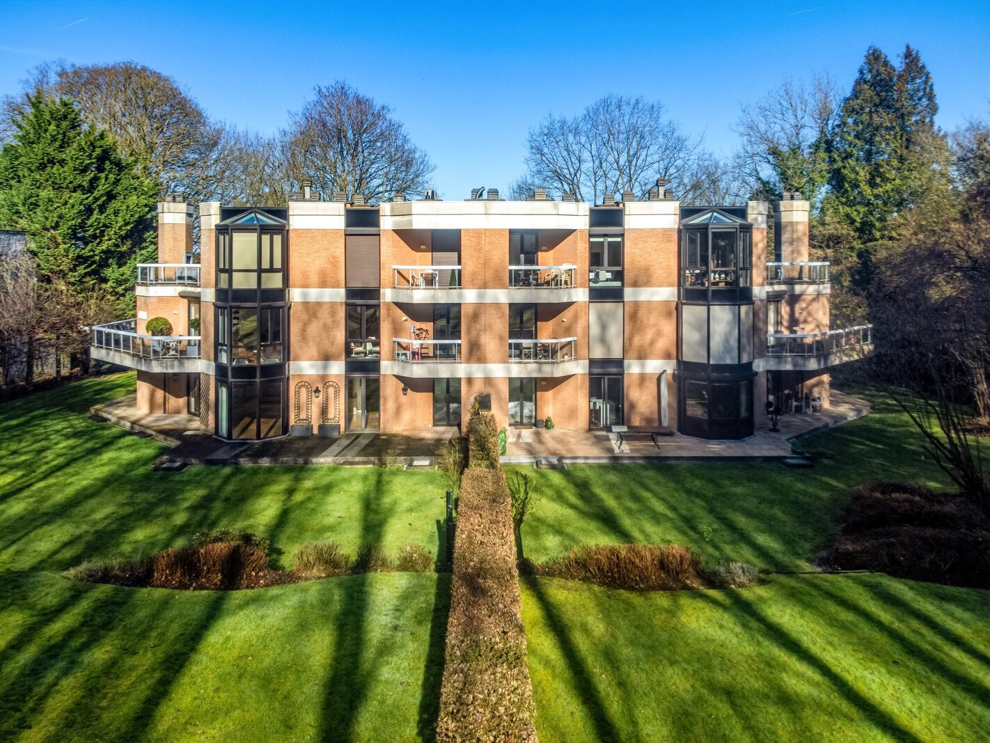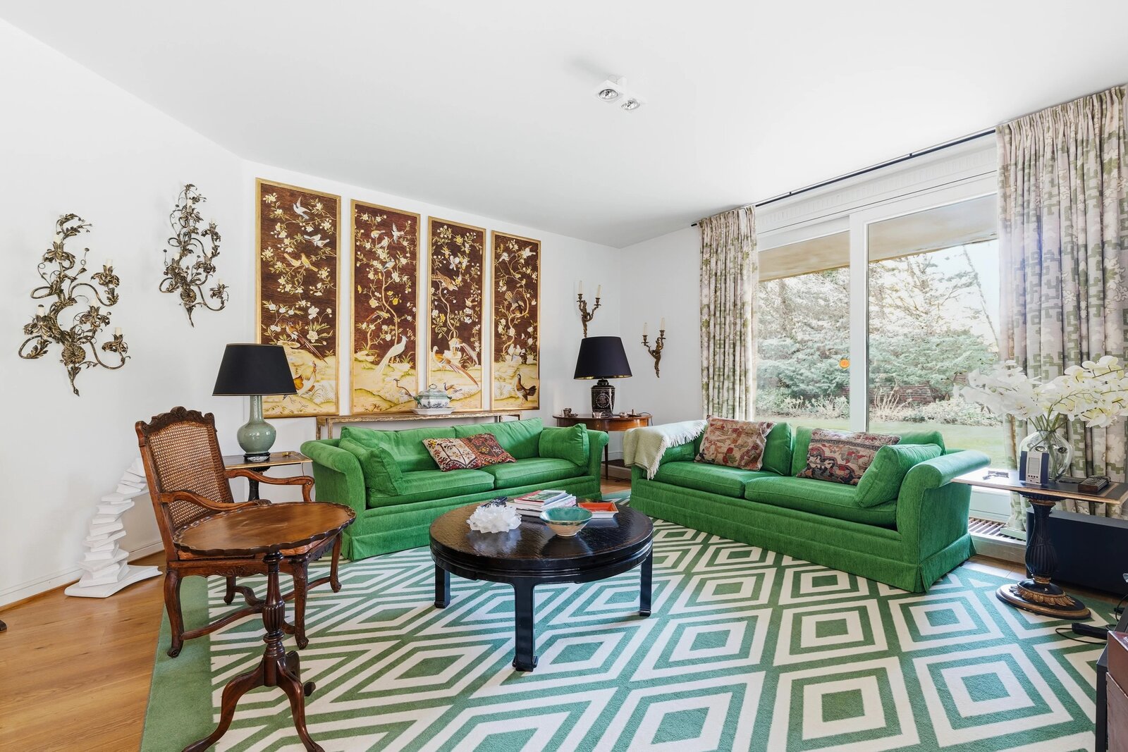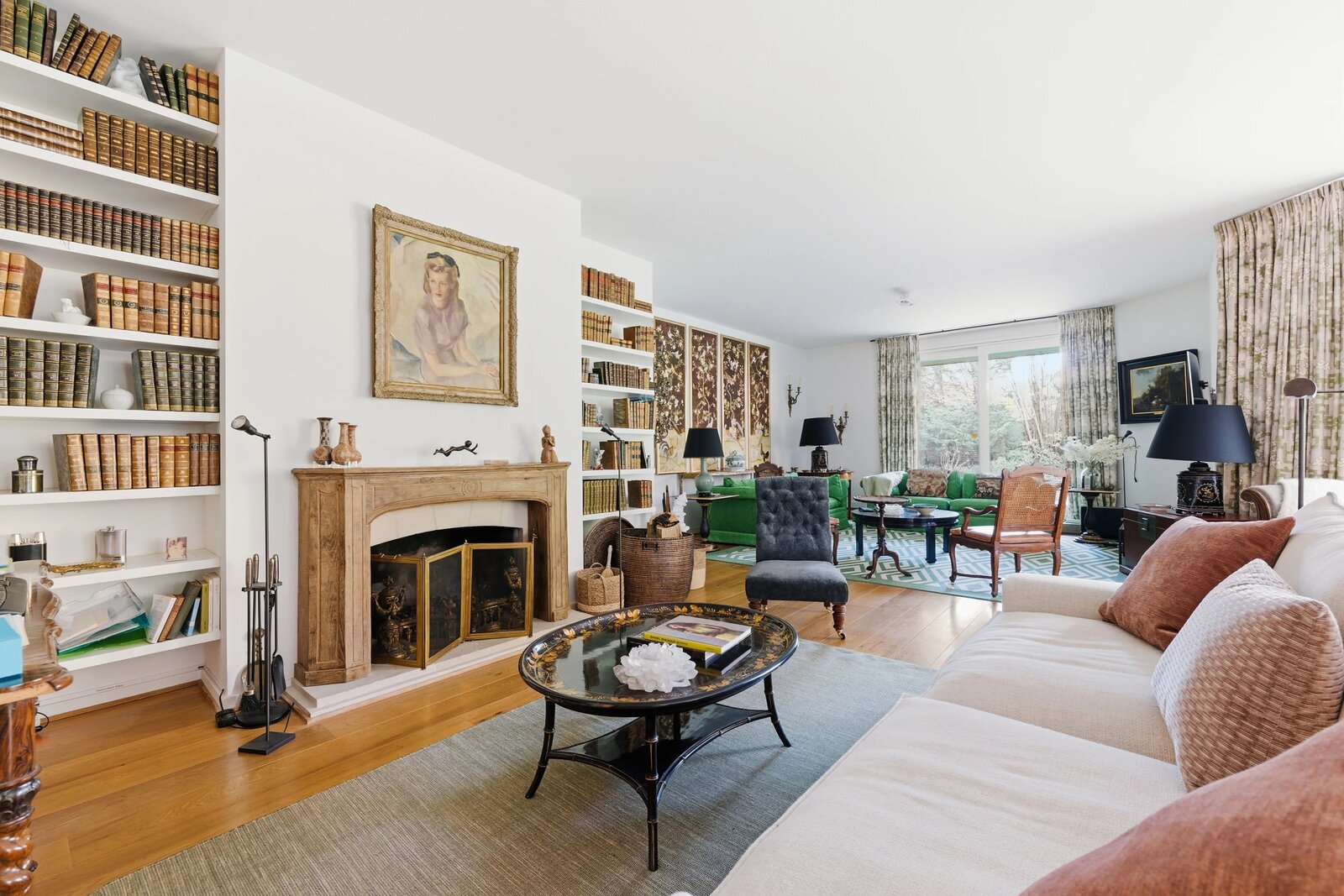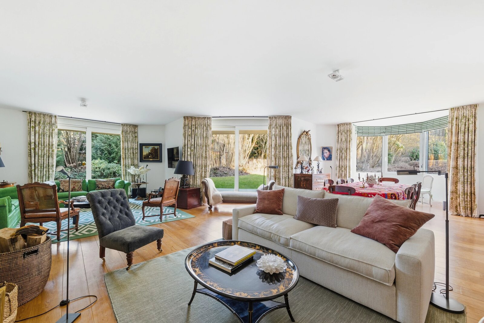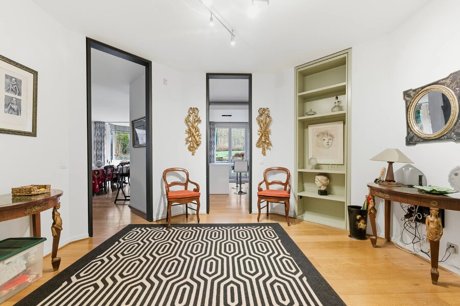 Met een vloeroppervlak van ongeveer 243 m², aangevuld met ongeveer 60 m² ideaal georiënteerde terrassen, geniet het appartement van een onbelemmerd, rustgevend uitzicht op het omliggende platteland. De royale volumes van de ontvangstruimten, met hun elegante open haarden, openen harmonieus naar buiten.