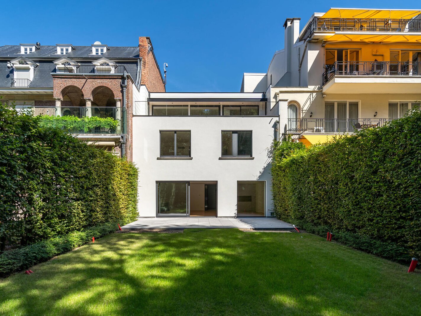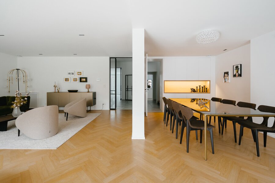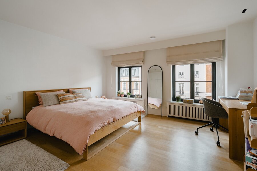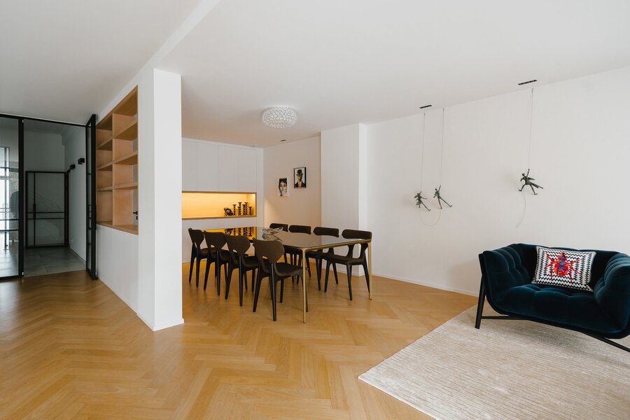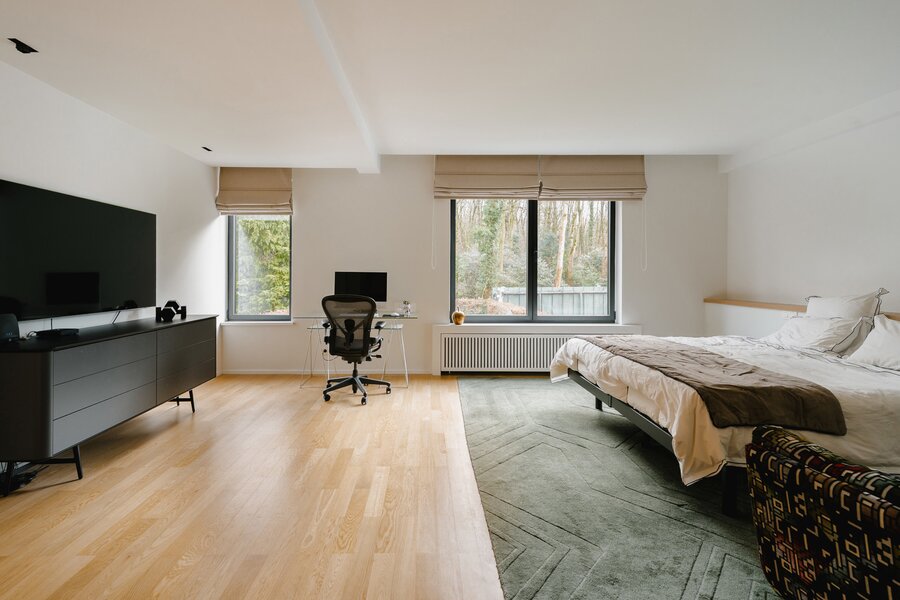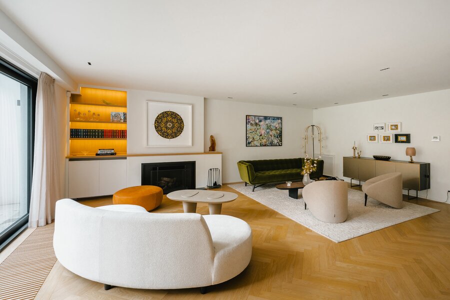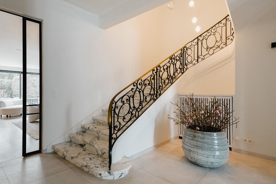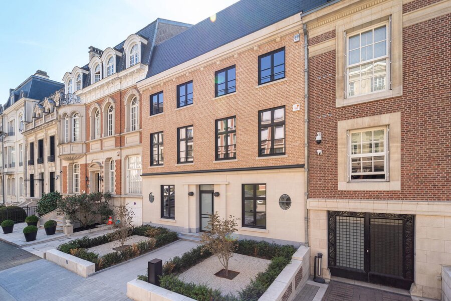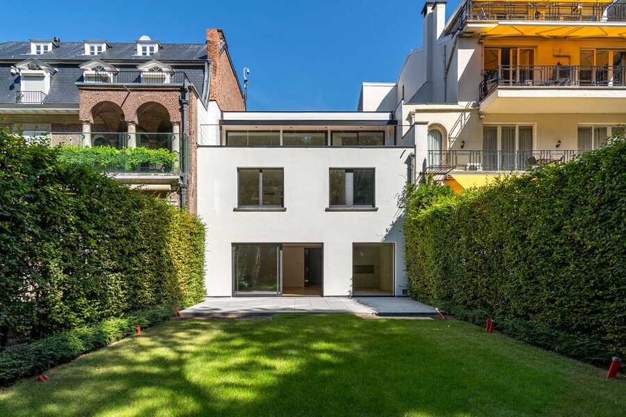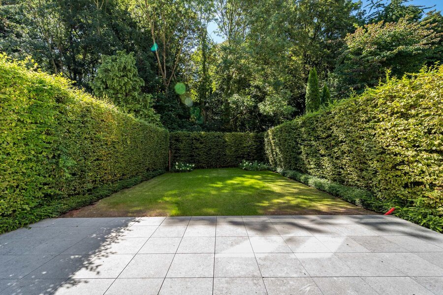 Aan de rand van het park Bois de la Cambre opent deze herenwoning zich naar een ruime entreehal met een marmeren hoofdtrap, garderobe en gastentoilet. Vanuit hier bereikt u de woonruimtes, perfect om gasten te ontvangen, badend in natuurlijk licht dankzij grote erkers die uitkijken op de op het zuiden georiënteerde tuin. Deze omvatten een woonkamer met open haard en een eetkamer met plaats voor 18 personen. Een aparte, volledig uitgeruste keuken met ontbijthoek completeert deze verdieping. De hoofdtrap leidt naar de slaapvertrekken, bestaande uit een master bedroom met een dubbele kleedkamer en en-suite badkamer, en twee extra slaapkamers, elk met een inbouwkleedkamer en en-suite doucheruimte. Een diensttrap leidt naar de bovenverdieping, waar zich een zelfstandig appartement bevindt met drie slaapkamers, een keuken, twee badkamers en een ruim terras.