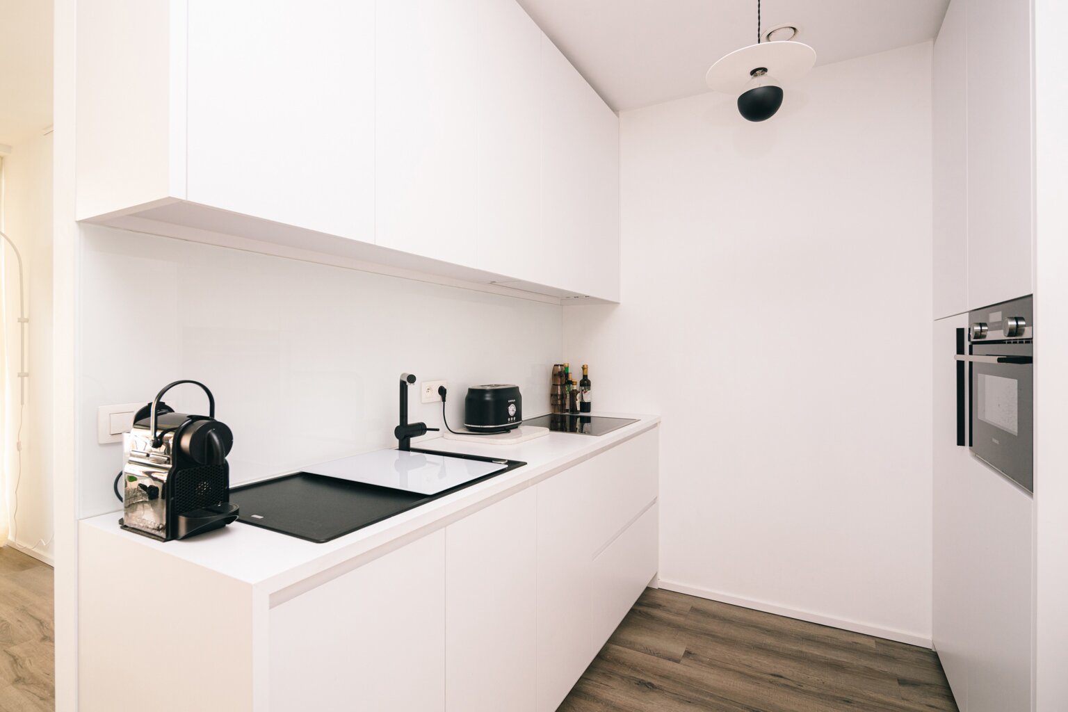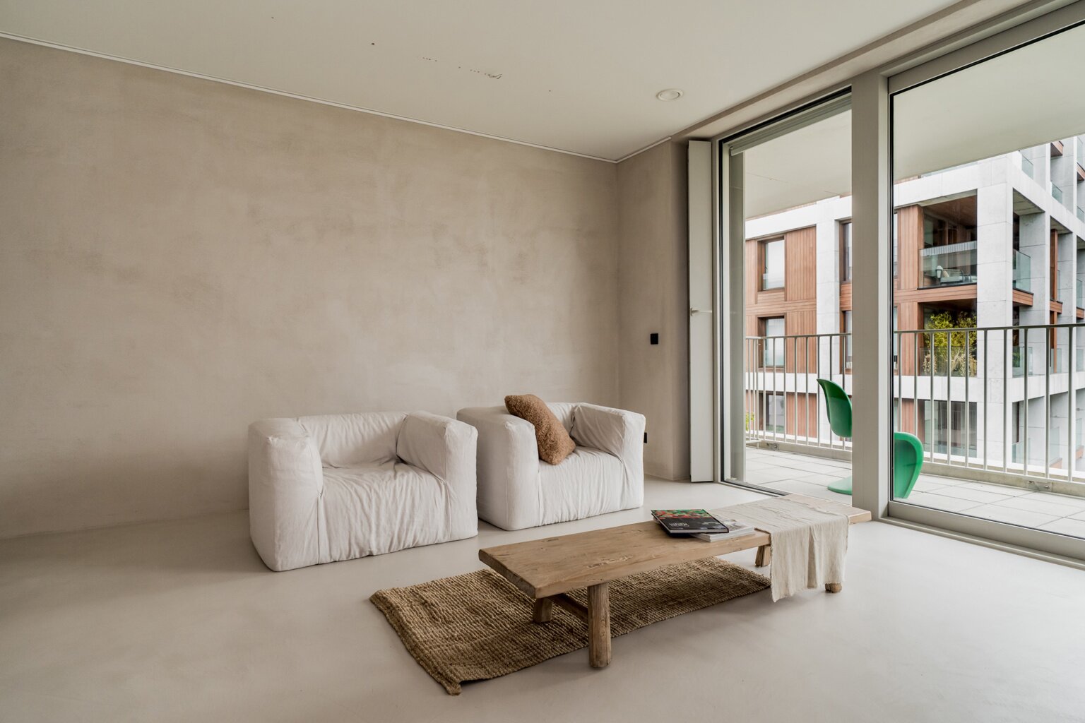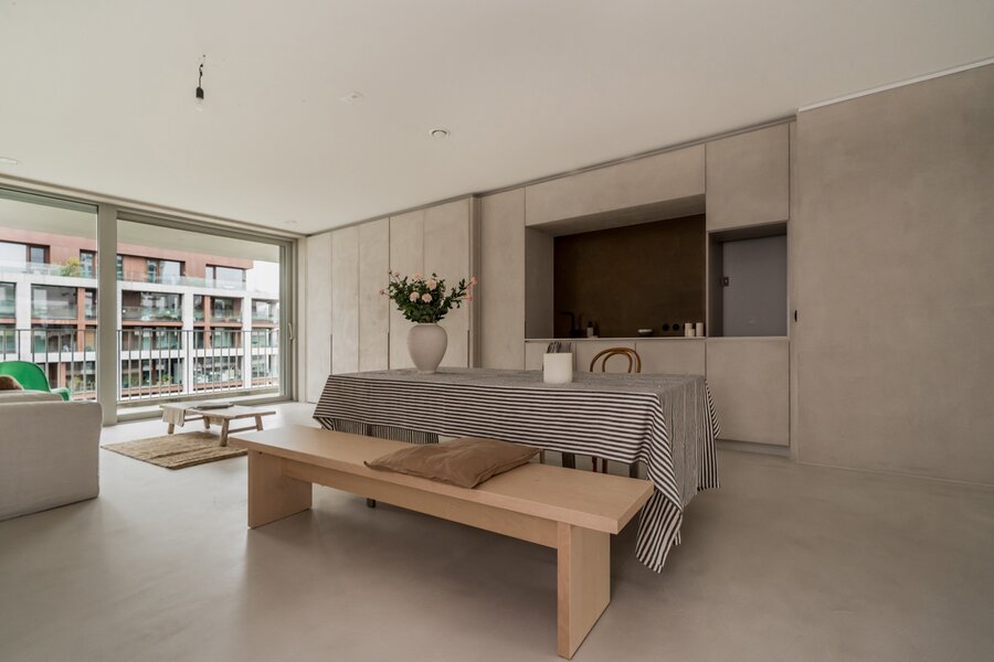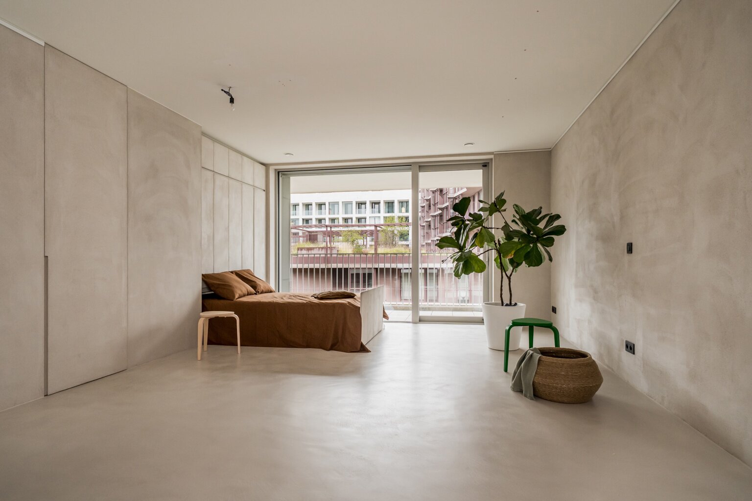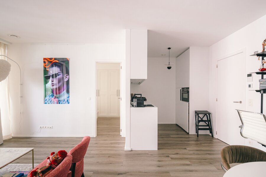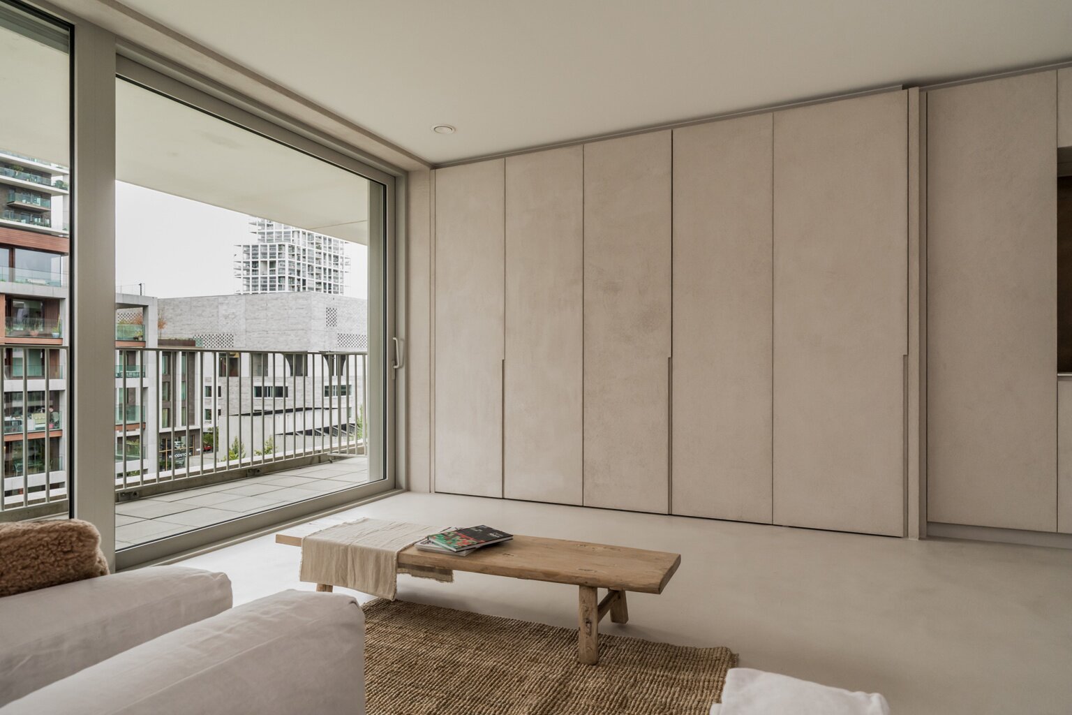 Het eerste appartement werd praktisch en modern ingericht met zachte materialen. Je kan hier werken, maar ook wonen: de kastenwand leent zich perfect voor elk aspect dat je nodig hebt. Een ingewerkte keuken met alle nodige toestellen, veel opbergruimte, een automatisch uitschuifbaar bed en zelfs een handige douchekamer – alles werd prachtig verwerkt in één samenhangend, rustgevend geheel.