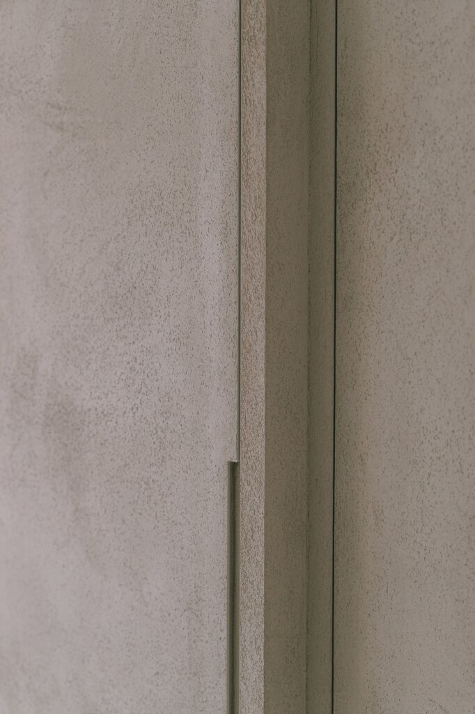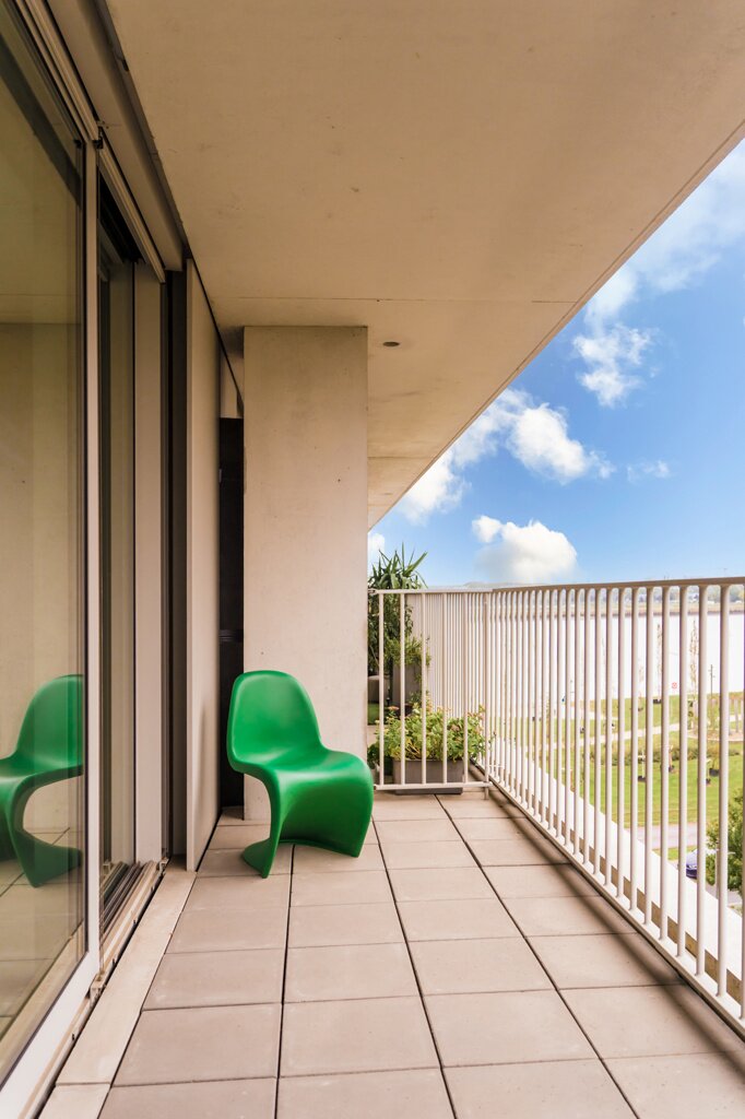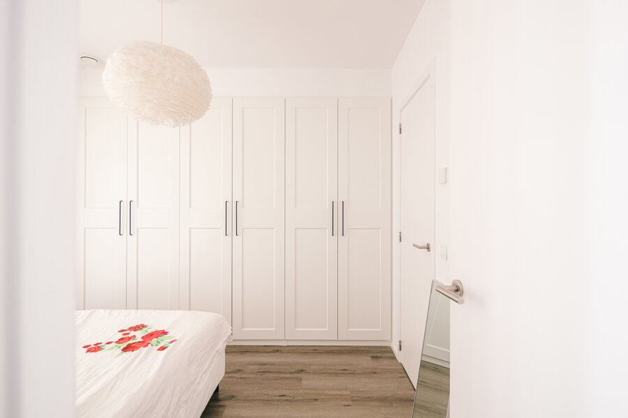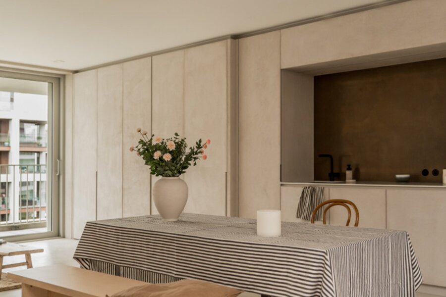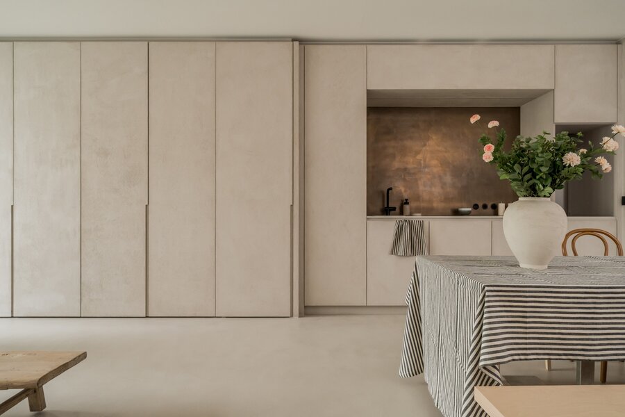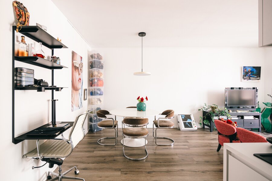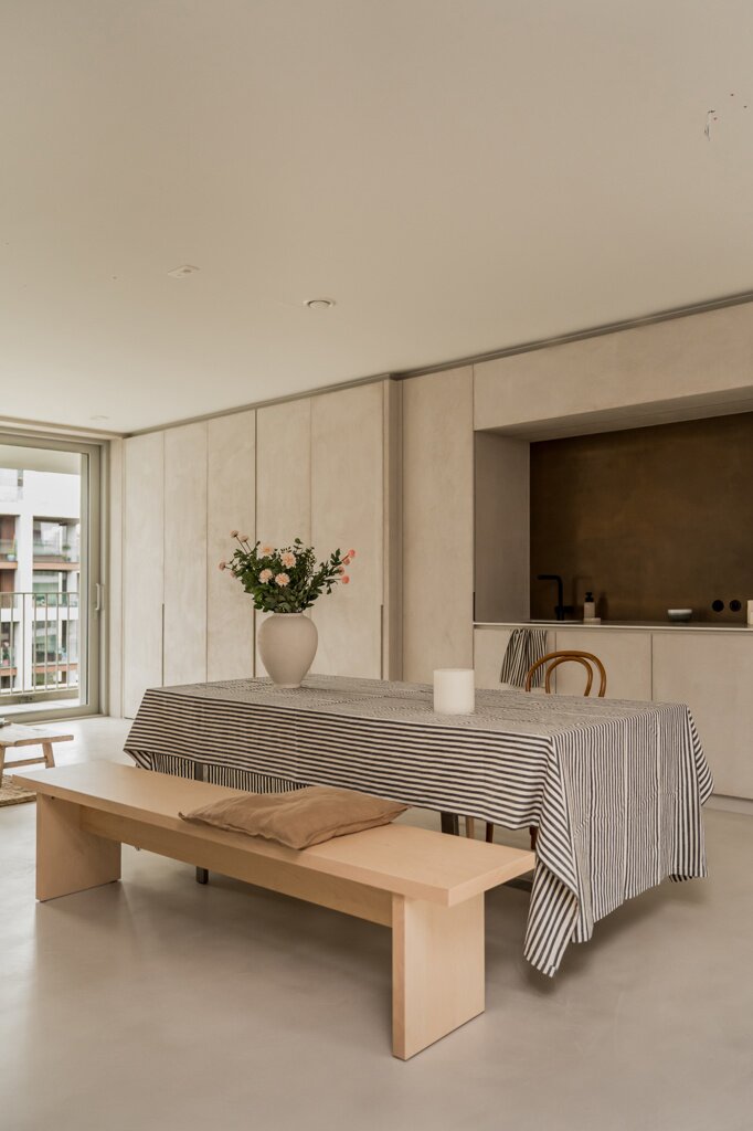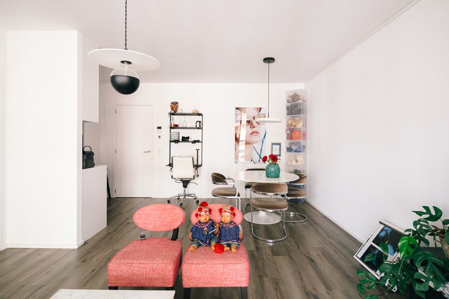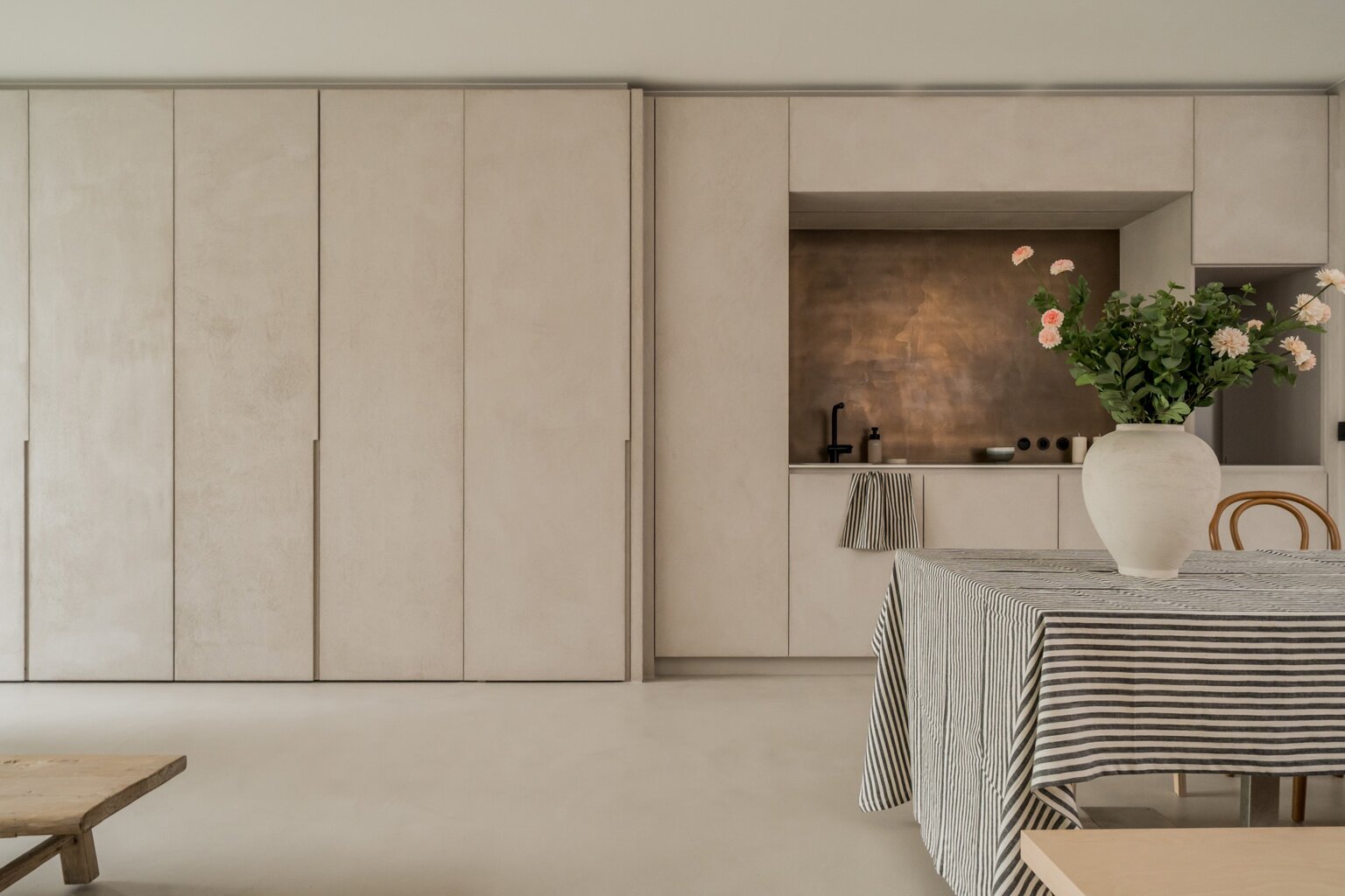 Het eerste appartement werd praktisch en modern ingericht met zachte materialen. Je kan hier werken, maar ook wonen: de kastenwand leent zich perfect voor elk aspect dat je nodig hebt. Een ingewerkte keuken met alle nodige toestellen, veel opbergruimte, een automatisch uitschuifbaar bed en zelfs een handige douchekamer – alles werd prachtig verwerkt in één samenhangend, rustgevend geheel.