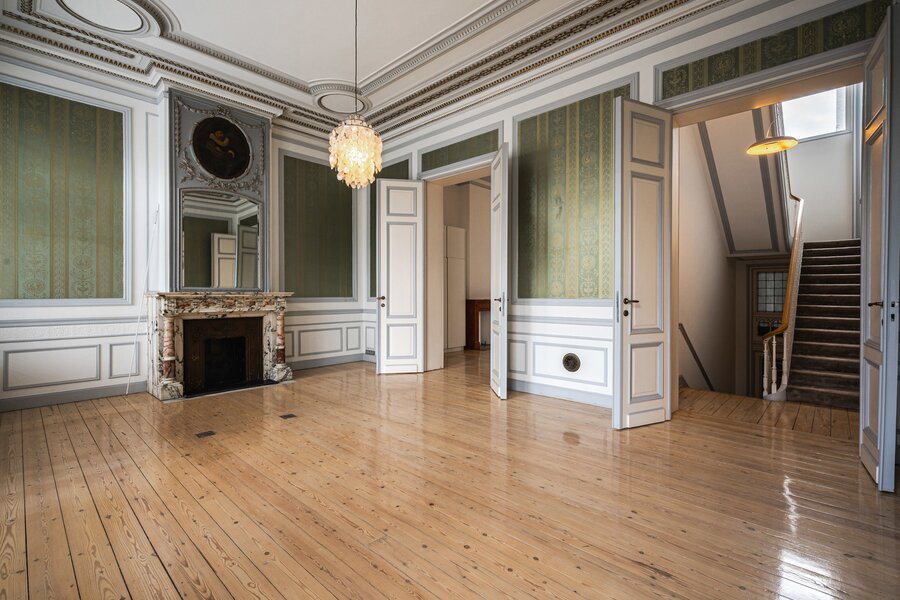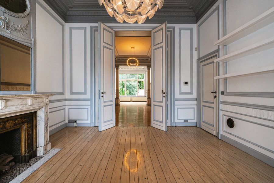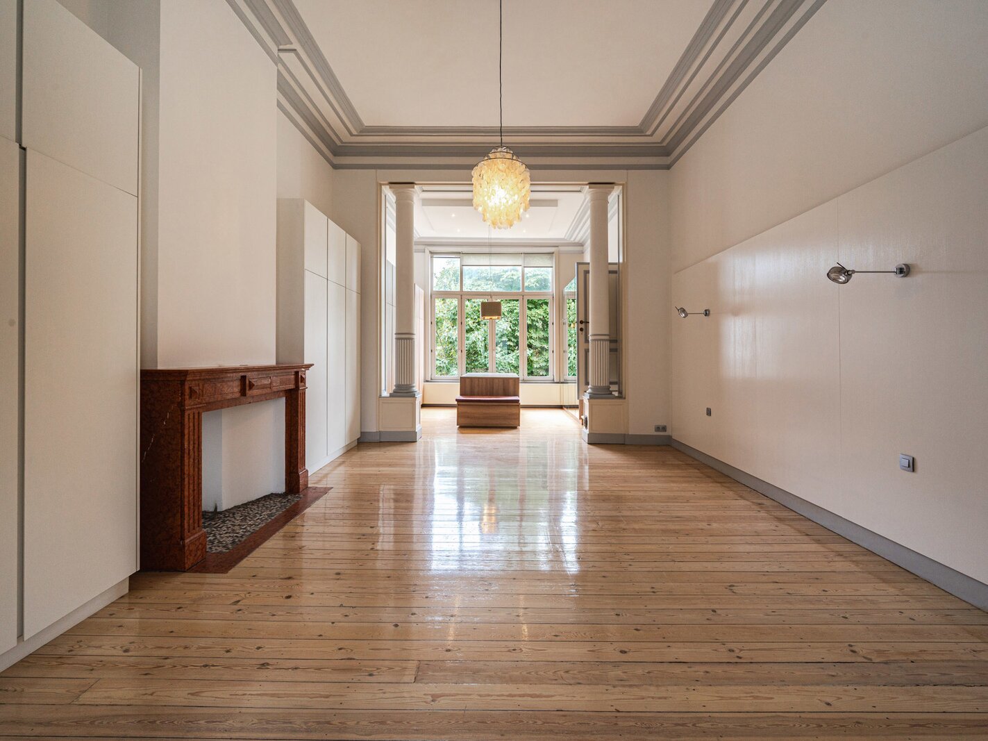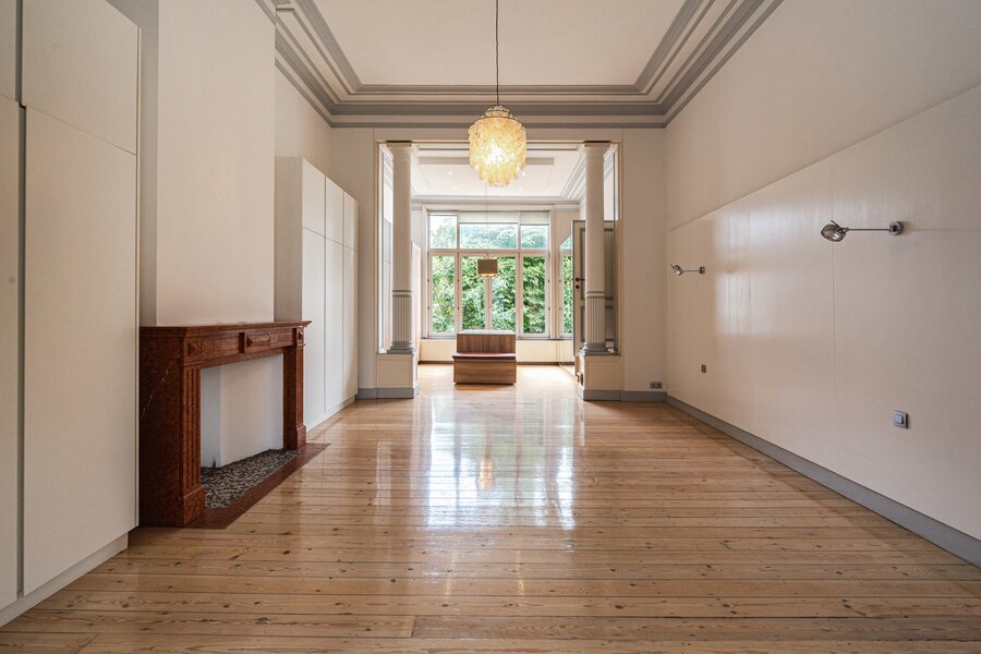 De woning komt uit op een hal die toegang geeft tot de leefruimtes van ± 72 m², met plafonds van meer dan 4 meter hoog, sierlijsten en decoratieve schouwen. Deze ruimtes zijn in serie geplaatst en bieden toegang tot het terras en de tuin. Ze worden gecompleteerd door een volledig uitgeruste, halfopen keuken. Op de eerste verdieping bevindt zich de master suite van ± 83 m² met een en-suite dressing, badkamer en kantoor/boudoir. Op de tweede verdieping bevinden zich een slaapkamer met kantoor, badkamer en toegang tot een terras, en een slaapkamer met een eigen badkamer. Op de derde verdieping bevinden zich nog twee slaapkamers, elk met een eigen badkamer. Een aparte wasruimte op de mezzanine, een familiekamer van ± 50 m² op de bovenste verdieping en een personeelsappartement op de onderste verdieping completeren het geheel. Ideaal voor coliving.