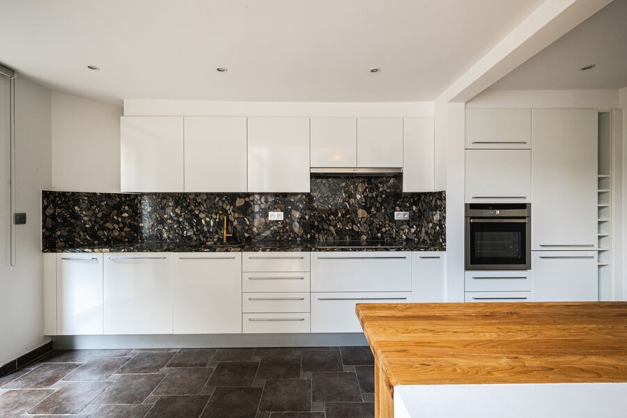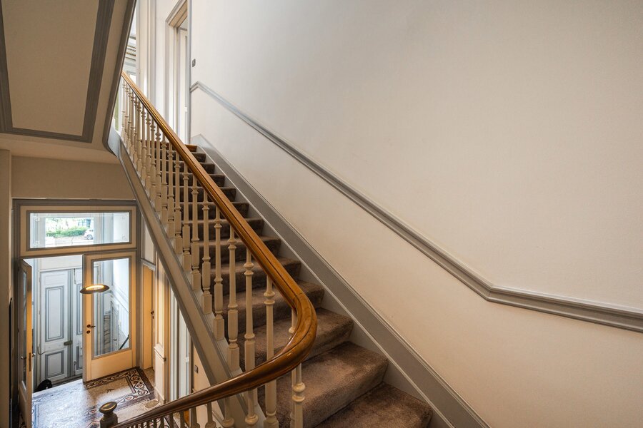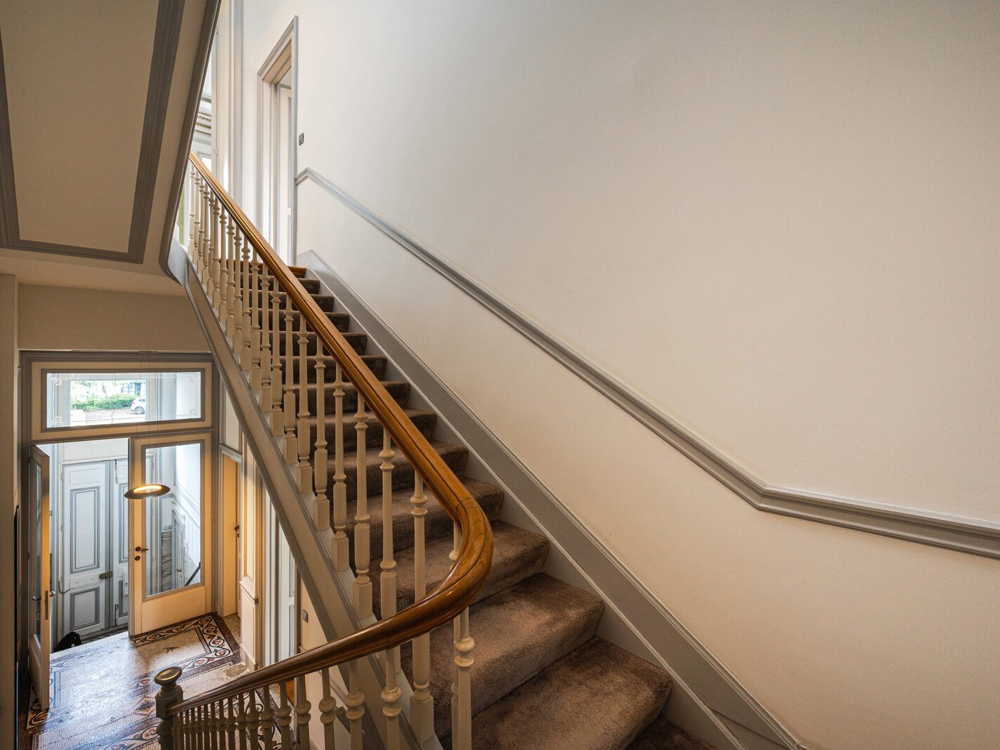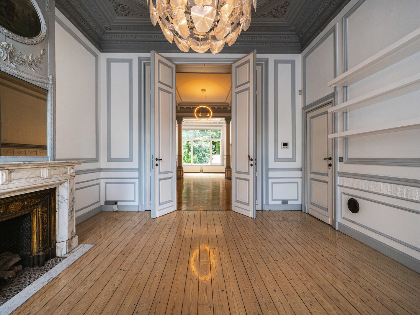 De woning komt uit op een hal die toegang geeft tot de leefruimtes van ± 72 m², met plafonds van meer dan 4 meter hoog, sierlijsten en decoratieve schouwen. Deze ruimtes zijn in serie geplaatst en bieden toegang tot het terras en de tuin. Ze worden gecompleteerd door een volledig uitgeruste, halfopen keuken. Op de eerste verdieping bevindt zich de master suite van ± 83 m² met een en-suite dressing, badkamer en kantoor/boudoir. Op de tweede verdieping bevinden zich een slaapkamer met kantoor, badkamer en toegang tot een terras, en een slaapkamer met een eigen badkamer. Op de derde verdieping bevinden zich nog twee slaapkamers, elk met een eigen badkamer. Een aparte wasruimte op de mezzanine, een familiekamer van ± 50 m² op de bovenste verdieping en een personeelsappartement op de onderste verdieping completeren het geheel. Ideaal voor coliving.