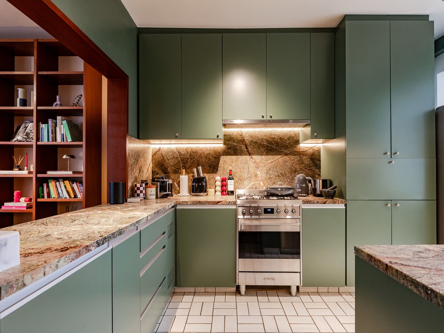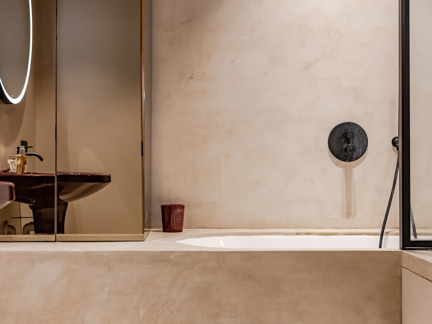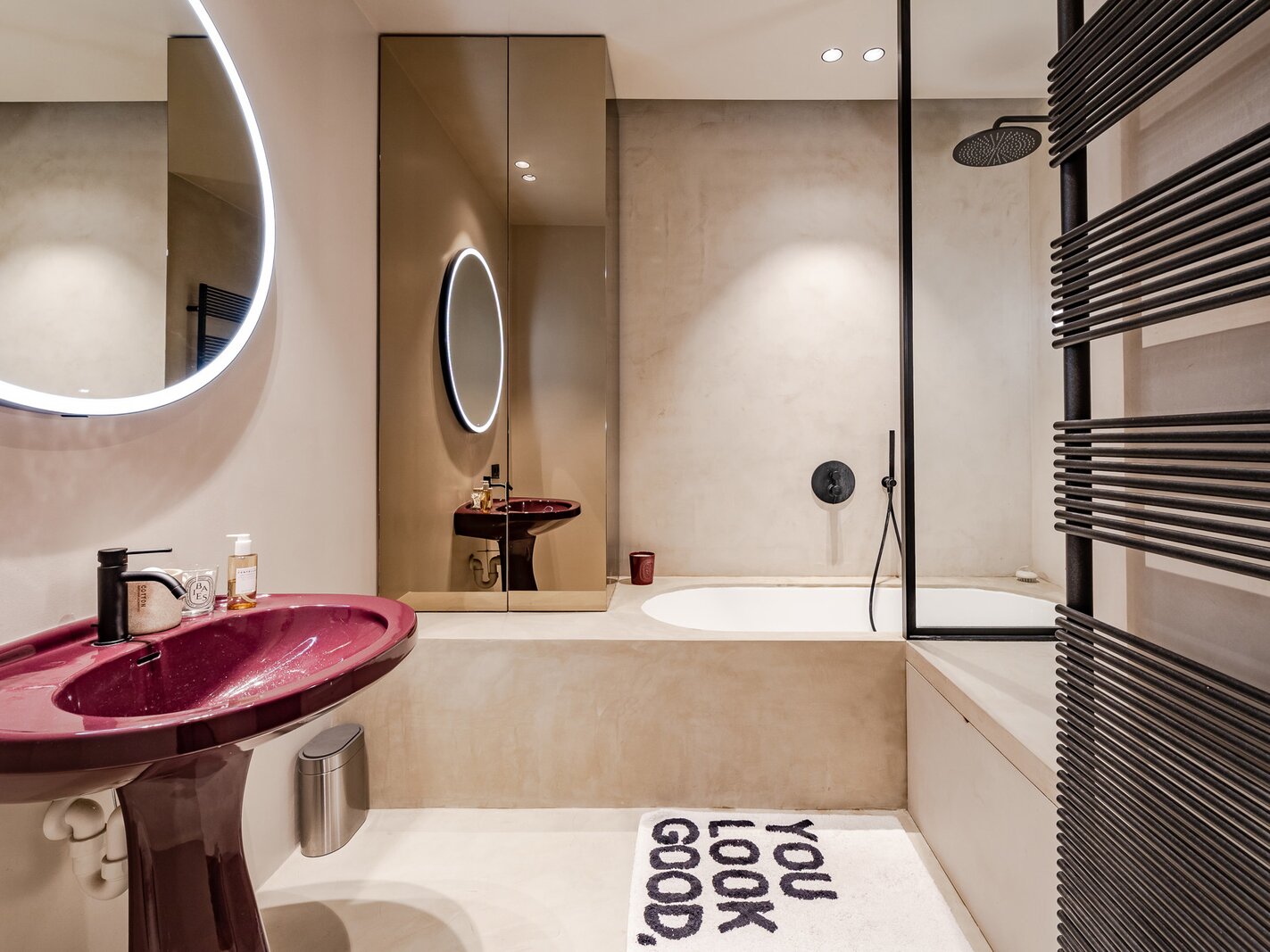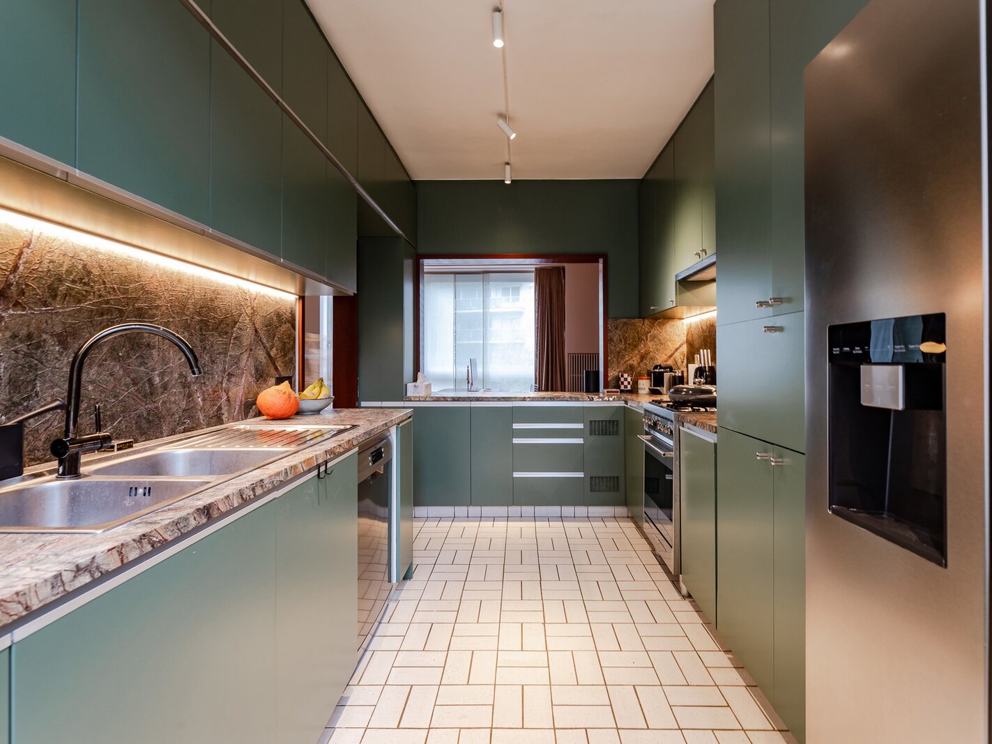 Het appartement vormt een perfecte harmonie tussen oud en modern en bestaat uit een inkomhal die toegang geeft tot de ontvangstruimtes rond een prachtige open haard in messing, die een zachte en verfijnde sfeer creëert. In de keuken zorgt het Forest Green marmeren werkblad voor een natuurlijke elegantie en een luxueuze uitstraling, terwijl de edelhouten doorgeefluik is bedoeld als overgangselement tussen de keuken en de eetkamer. Het slaapgedeelte bestaat uit twee comfortabele slaapkamers en een badkamer met natuurlijke tinten. Een afgesloten garage en een buitenparkeerplaats maken dit geheel compleet.