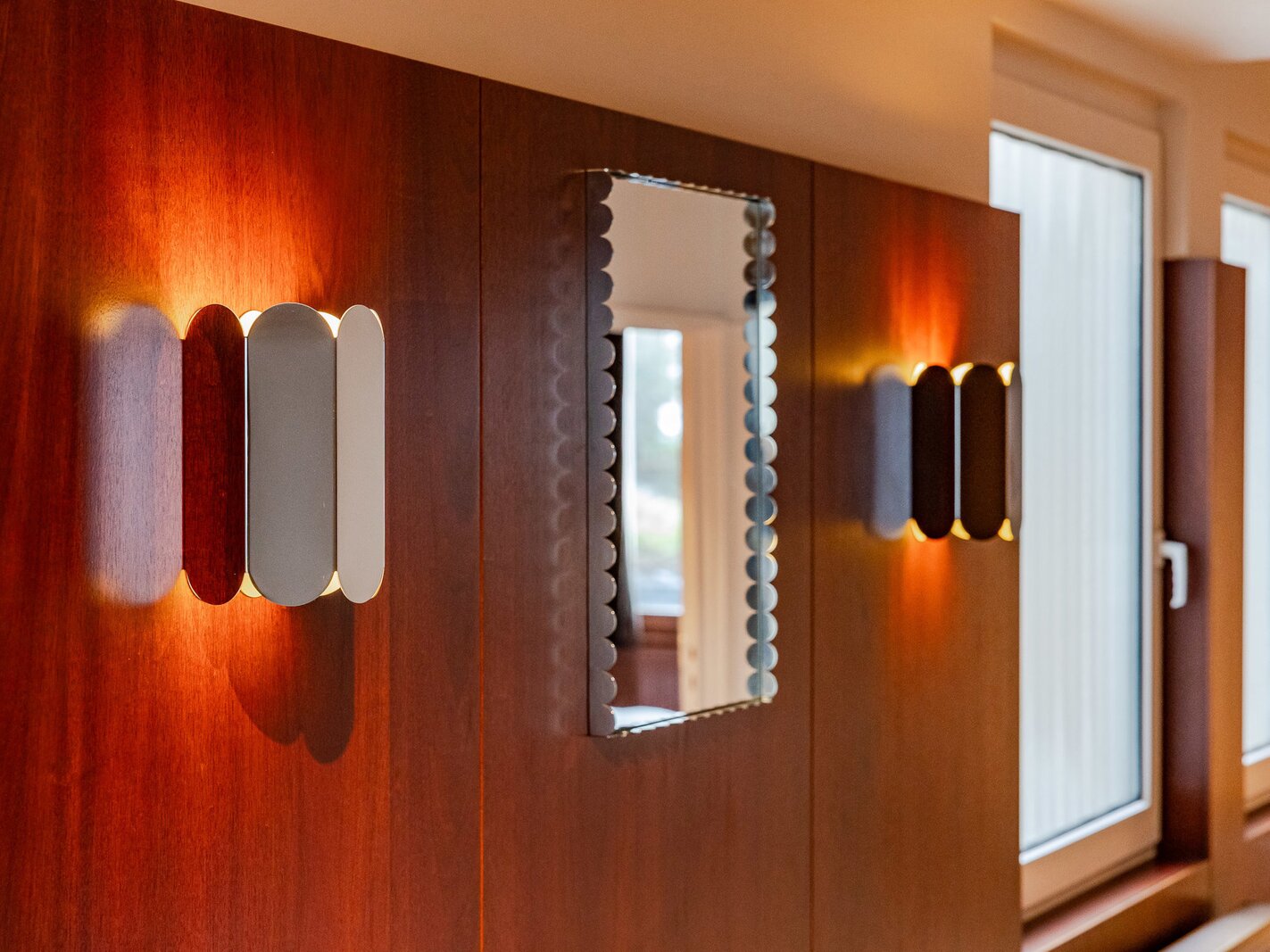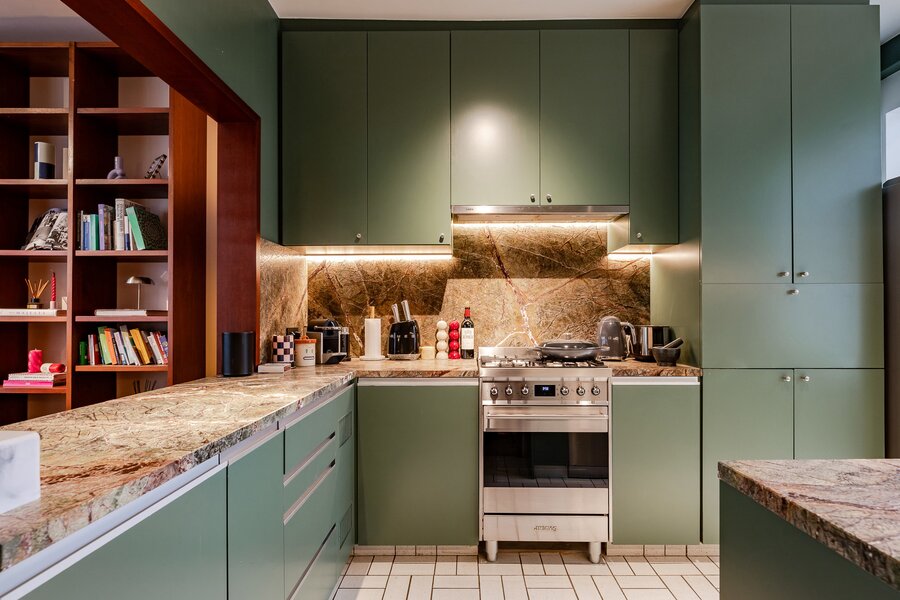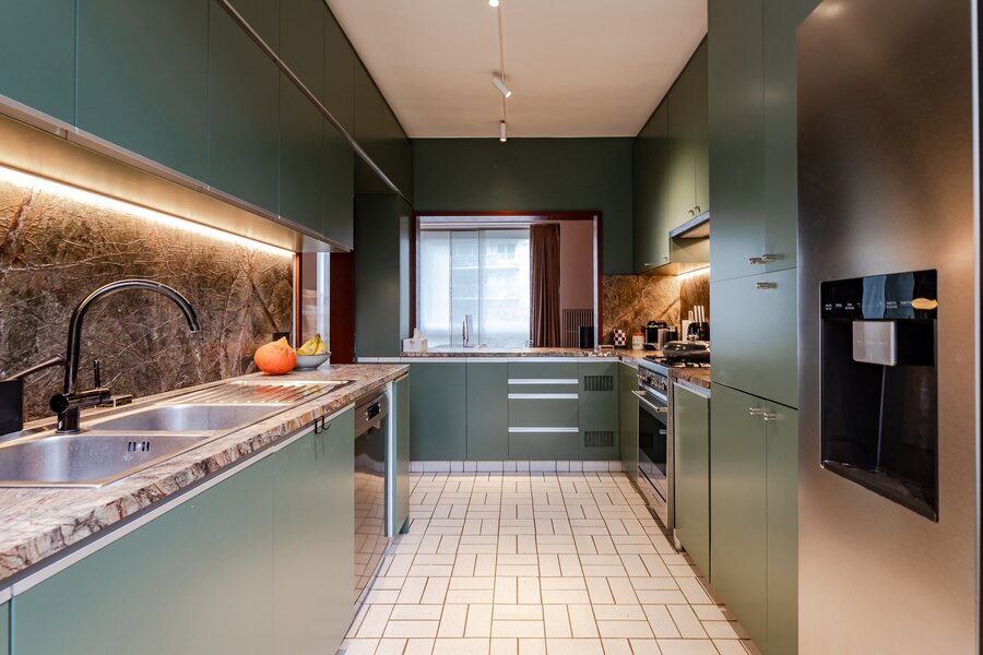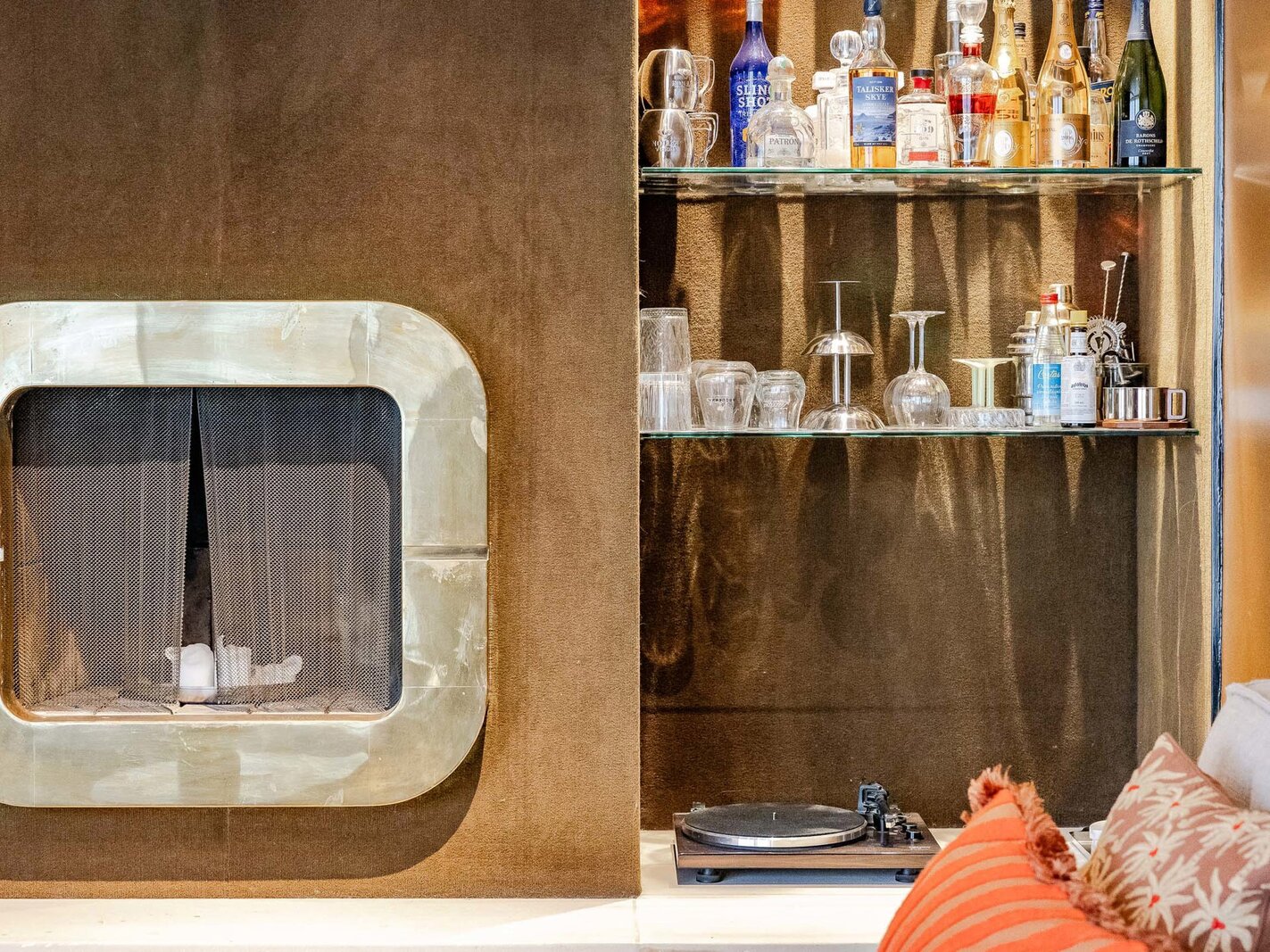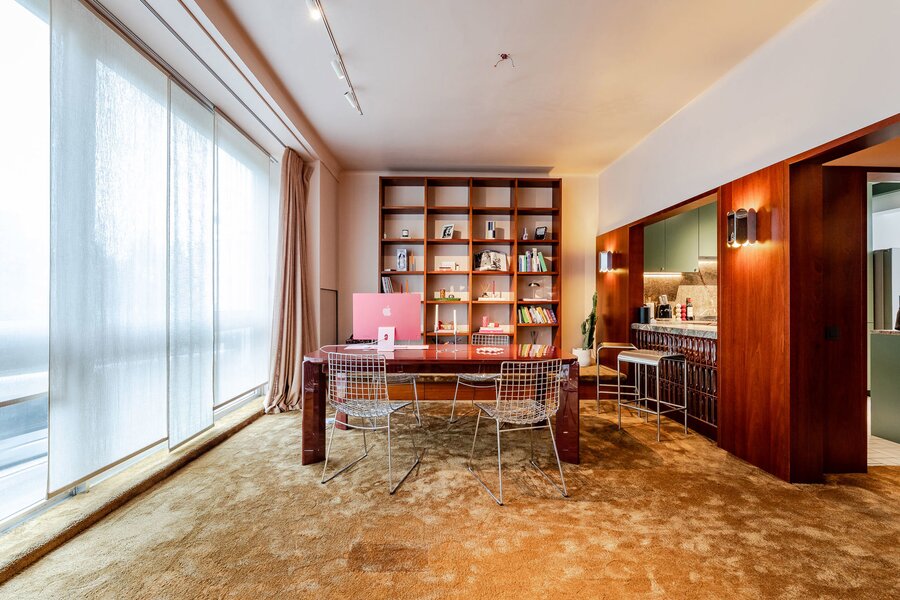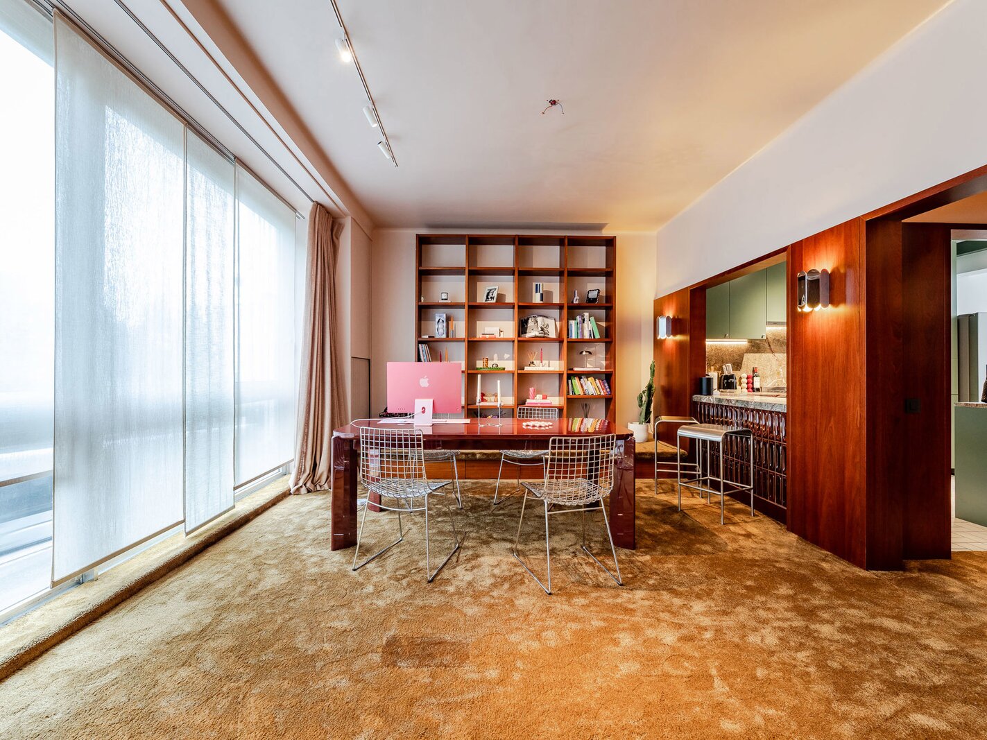 Het appartement vormt een perfecte harmonie tussen oud en modern en bestaat uit een inkomhal die toegang geeft tot de ontvangstruimtes rond een prachtige open haard in messing, die een zachte en verfijnde sfeer creëert. In de keuken zorgt het Forest Green marmeren werkblad voor een natuurlijke elegantie en een luxueuze uitstraling, terwijl de edelhouten doorgeefluik is bedoeld als overgangselement tussen de keuken en de eetkamer. Het slaapgedeelte bestaat uit twee comfortabele slaapkamers en een badkamer met natuurlijke tinten. Een afgesloten garage en een buitenparkeerplaats maken dit geheel compleet.