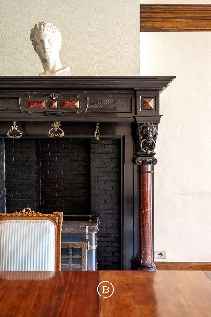 De prachtige inkomhal met vestiaire en gastentoilet geeft toegang tot een salon met open haard, eetplaats en keuken met berging.