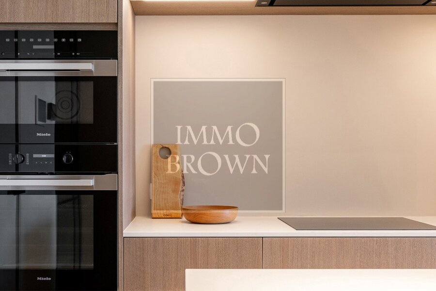 Aansluitend bevindt zich de volledig ingerichte open keuken, afgewerkt met hoogwaardige materialen en uitgerust met moderne, kwalitatieve toestellen, perfect geïntegreerd in de leefruimte.