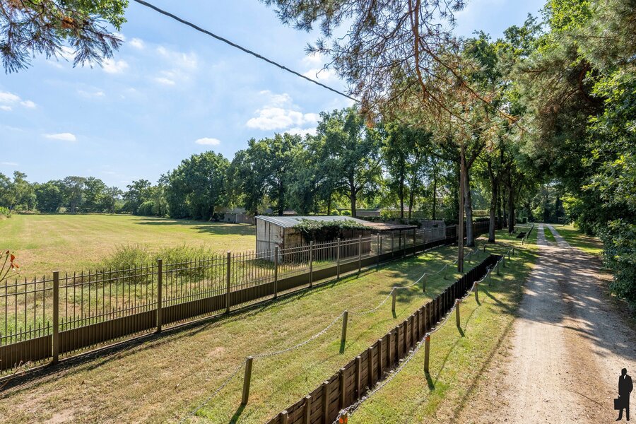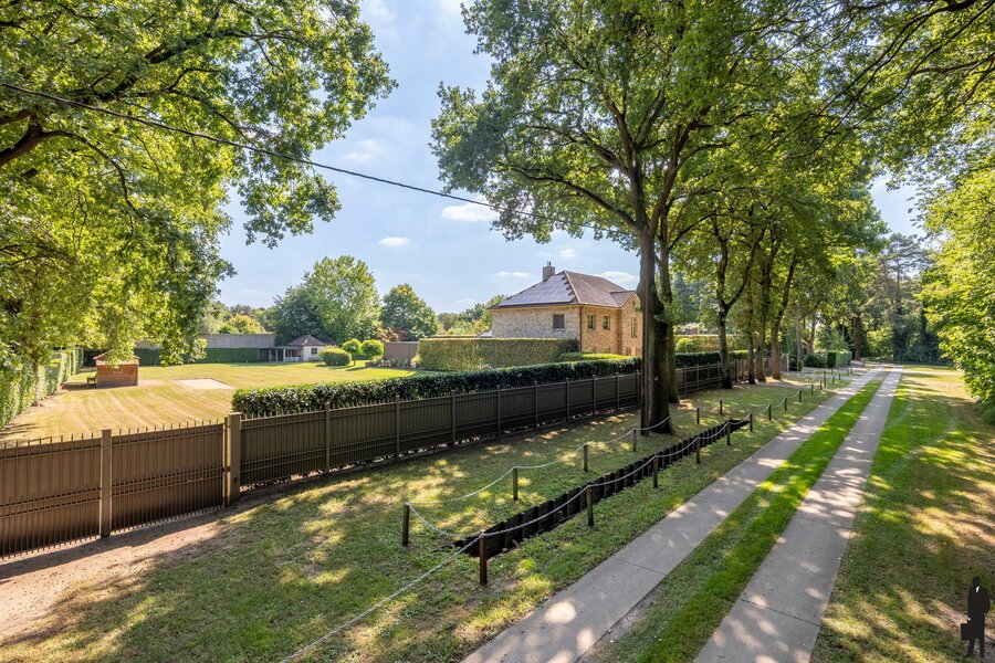 De woning heeft een oprit met poort aan de zijkant van de woning en een garagebouw (2 standplaatsen). De terrassen geven uit op verschillende prachtige verzichten in de diepe, landelijke en private tuin, ideaal georiënteerd op het zuiden. De riante tuin met zwembad en pergola is volledig omheind met stijlvol en hoog stalen-hekwerk. Achteraan wordt de afgescheiding gemaak door meters hoge hagen.
