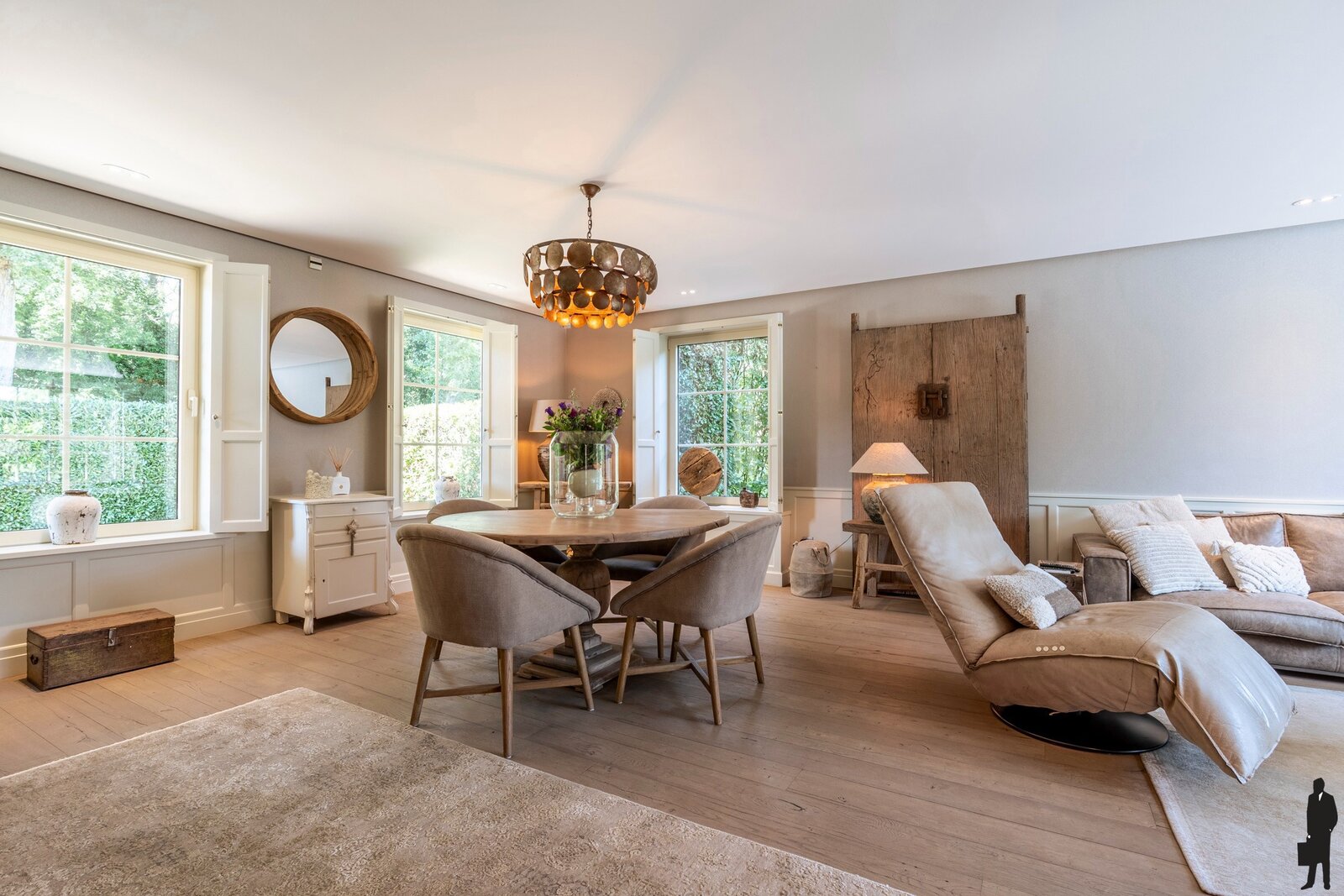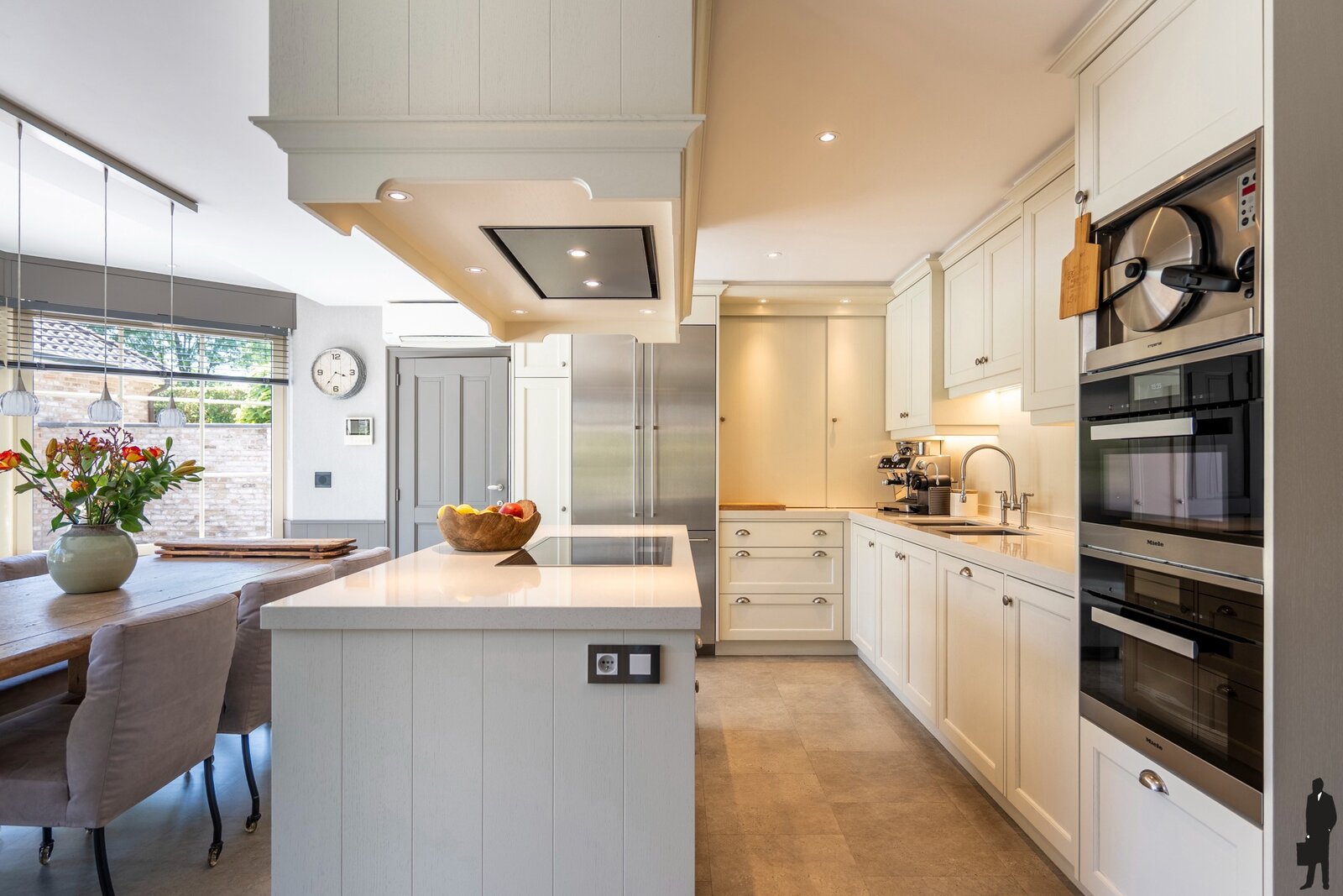 Via de inkomhal met garderobe en gastentoilet heeft u toegang tot de riante leefruimte en de bureau. De leefruimte, met veel natuurlijk daglicht en schitterend zicht op tuin en zwembad, is luxueus afgewerkt en ingericht. Zij biedt meerdere zithoeken en een ruim salon met inbouw (sfeer)gashaard. Vanuit de leefruimte heeft u toegang tot de keuken met toegang naar de ruime kelder op stahoogte. De keuken is compleet uitgerust voor de culinaire hobbyist met volgende recente kwaliteitstoestellen: stoom-, hetelucht- en combi-oven (allen Miele), inductievuur (Gaggenau), dubbele koelkast met vriesdeel (Gaggenau), vaatwas (Miele) en voldoende kastruimte. Aan de keuken bevindt zich een riante waskamer met inbouwkasten, douchekamer en afzonderlijke toilet. Wasmachine en droogkast kunnen op hoogte worden geplaatst.