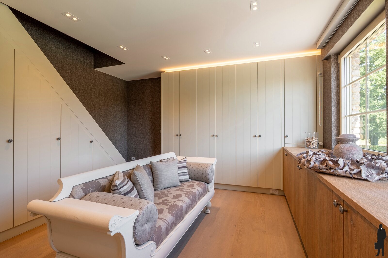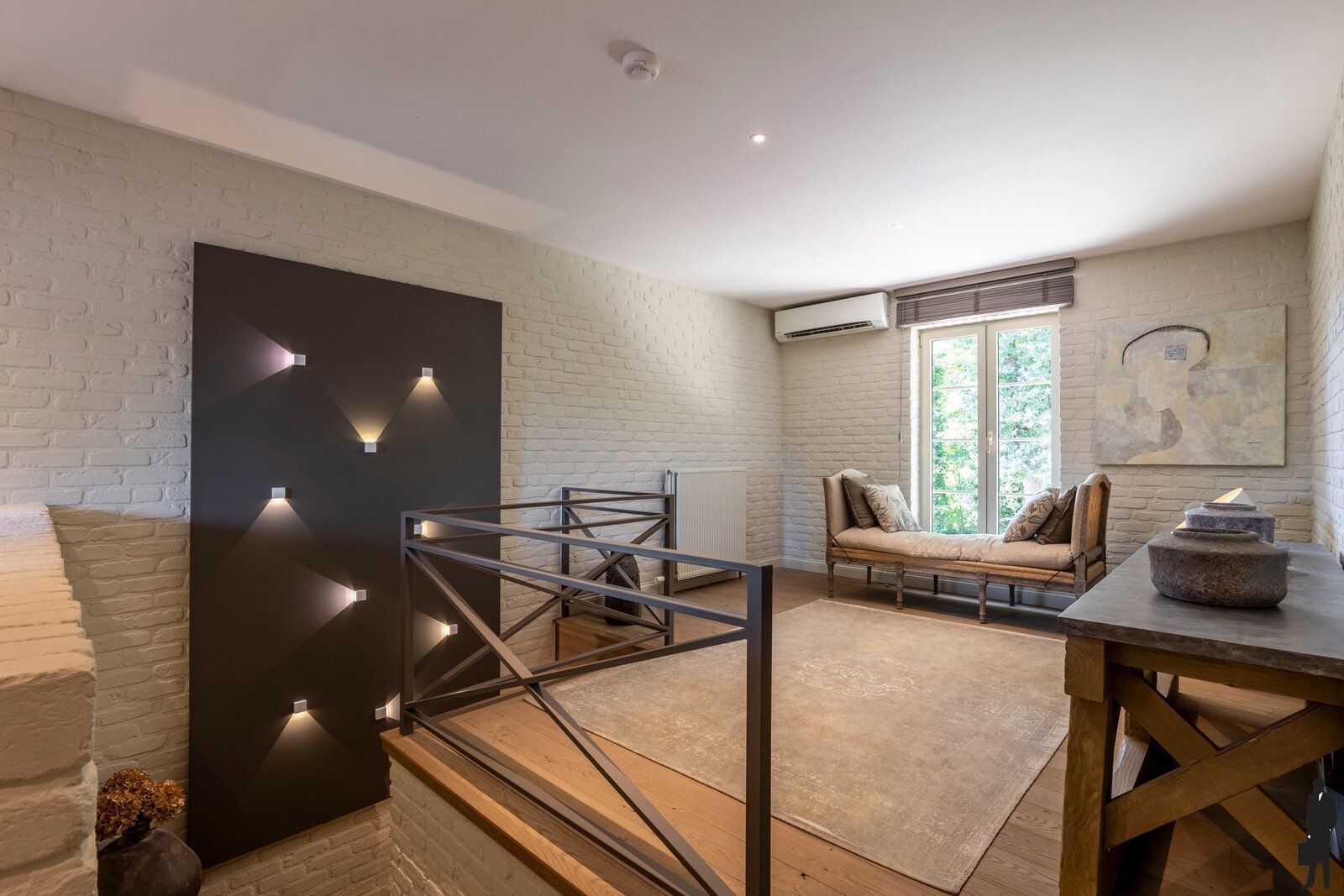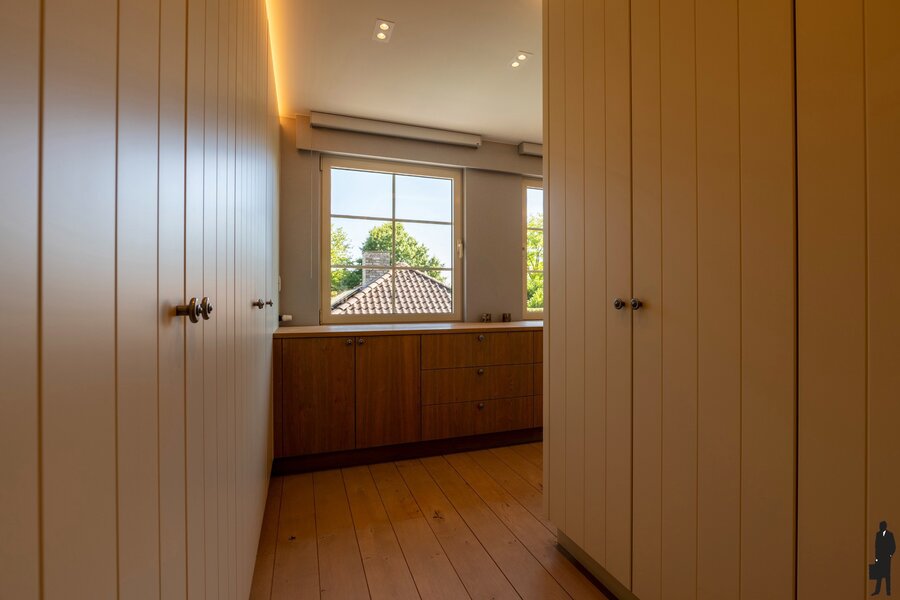 De vaste trap in de inkomhal brengt u naar de eerste verdieping. Hier bevinden zich 2 ruime slaapkamers, 2 dressings en een badkamer met inloopdouche, ligbad, dubbele lavabo en toilet. Deze ruimtes zijn toegankelijk via de nachthal/overloop met zithoek.