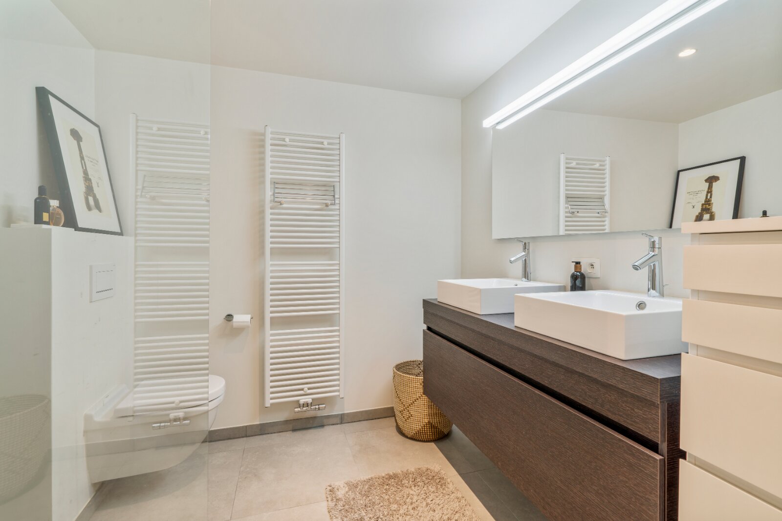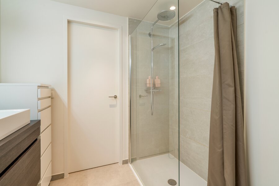 Bij het binnenkomen van het appartement betreedt u de inkomhal met vestiaire die toegang geeft tot de leefruimte met volledig geïnstalleerde open keuken en eetplaats. Vanuit de leeftruimte heeft u toegang tot het terras georiënteerd naar het zuiden. Het appartement beschikt over twee ruime slaapkamers. Moderne badkamer met ruime inloopdouche, dubbele lavabo en toilet. Praktische berging met aansluiting voor wasmachine en droogkast. Gastentoilet aanwezig.