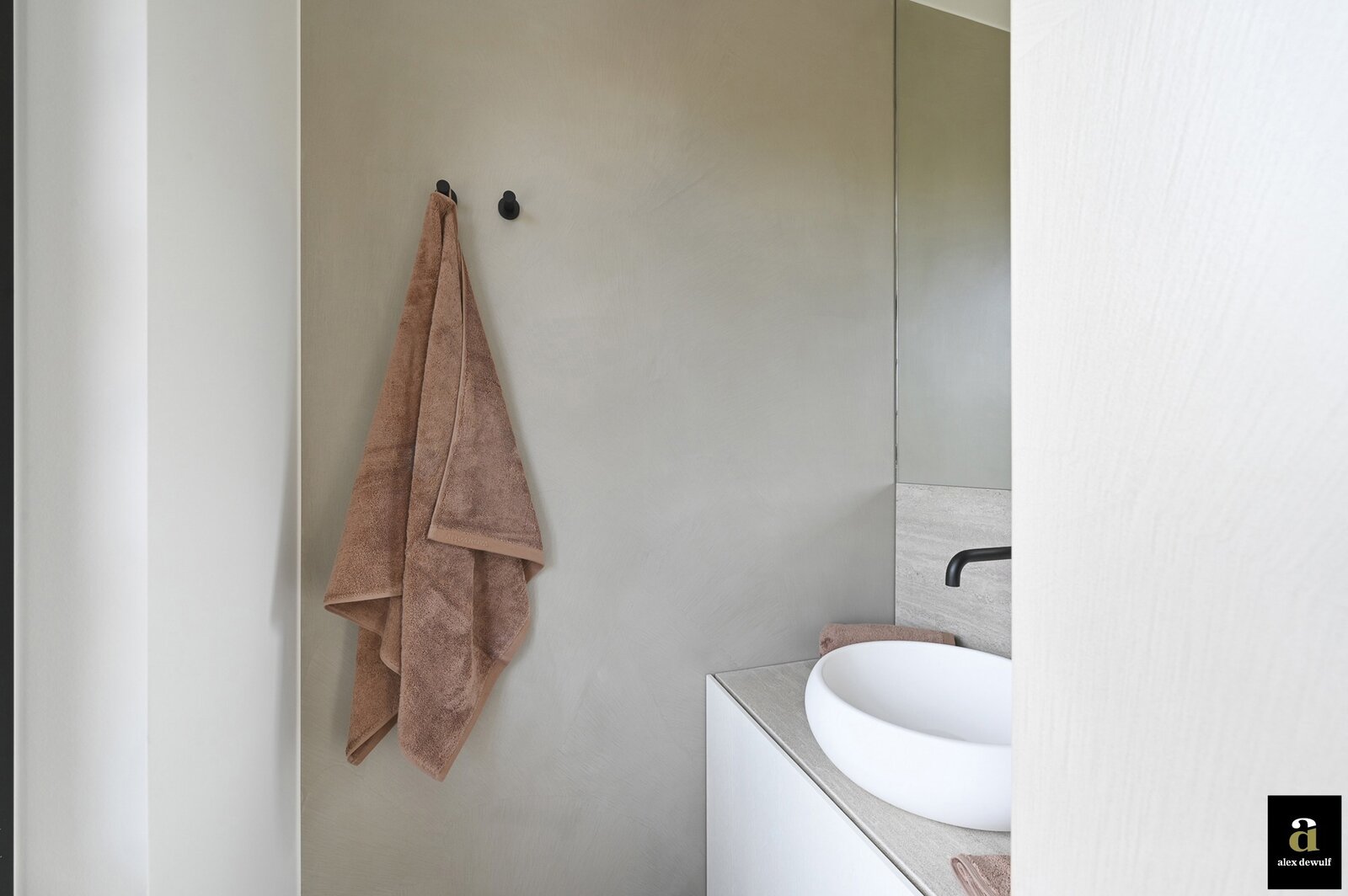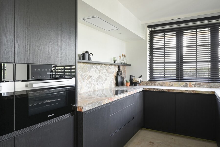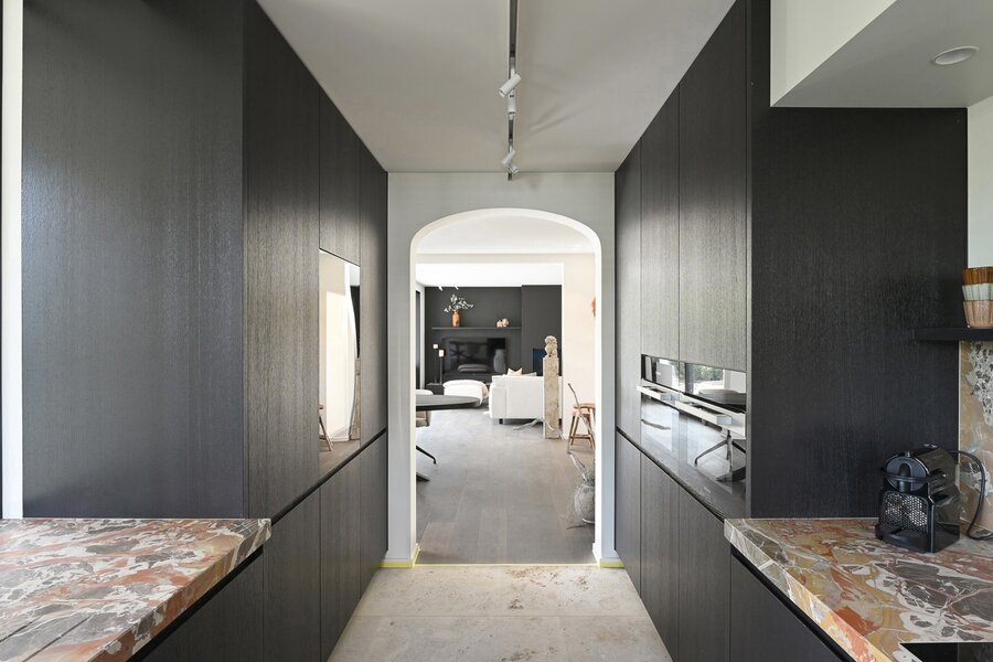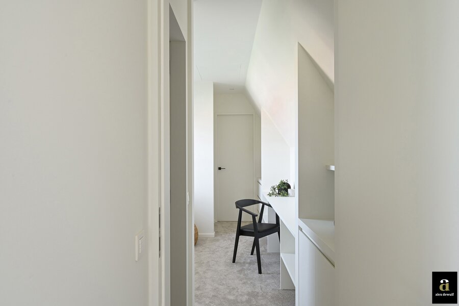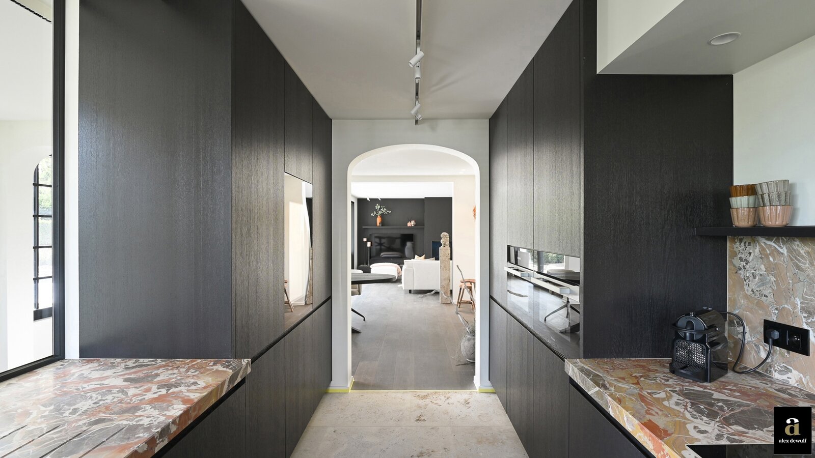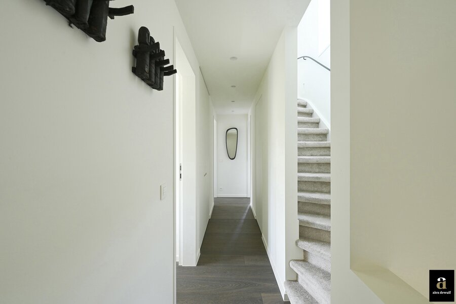 Indeling: inkomhal met vestiaire en gastentoilet, ruime leefruimte in parket met open haard en maatwerkkasten in fineer eik, aparte eetruimte met toegang tot het overdekte terras en de tuin. De moderne keuken is volledig uitgerust met Miele-toestellen en een marmeren werkblad. Praktische wasruimte met extra bergruimte.