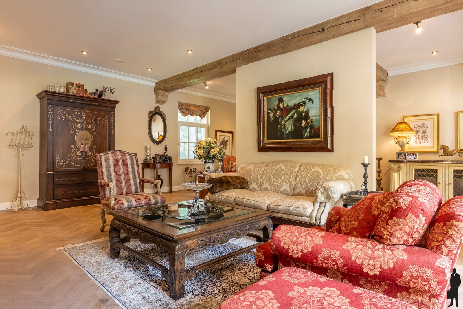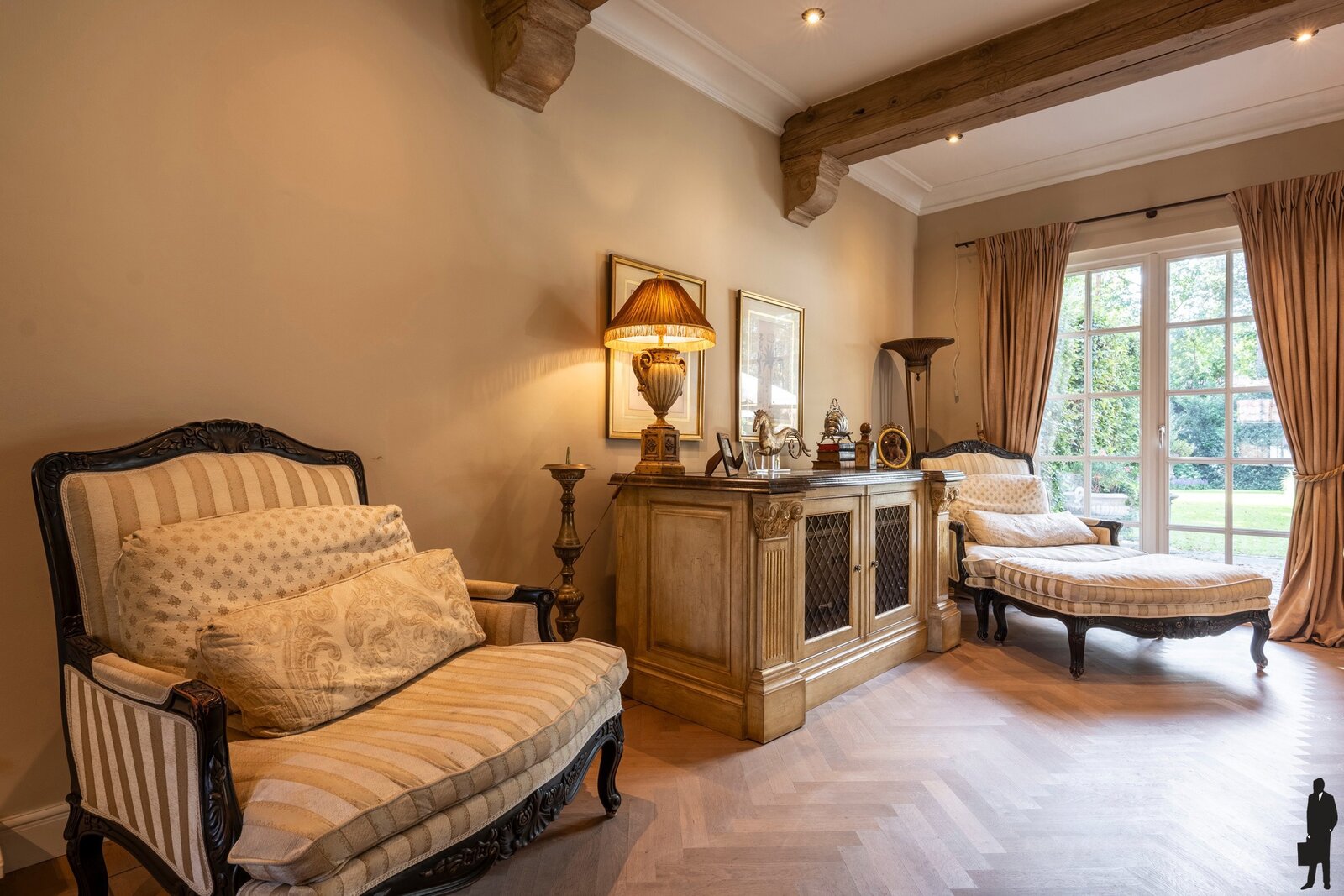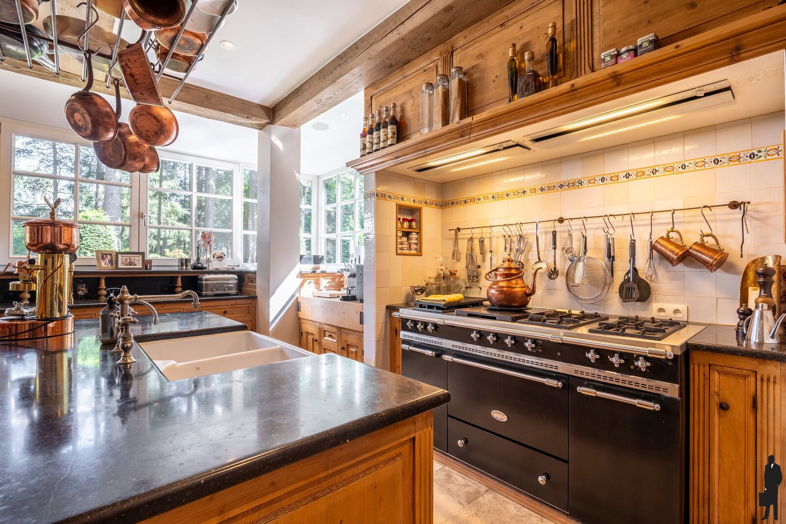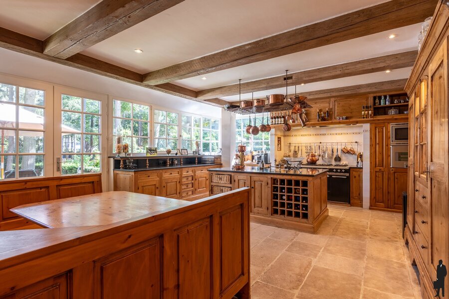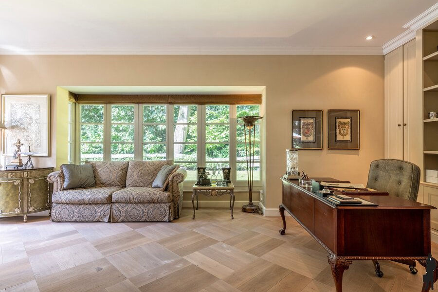 Gelijkvloerse verdieping: Bij het betreden van de woning valt meteen de imposante inkomhal op, voorzien van een open vide, natuurstenen vloer, garderobe en gastentoilet. Vanuit deze centrale hal is er toegang tot de verschillende leefruimten. De ruime woonkamer straalt een tijdloze elegantie uit met haar parketvloer, hoge plafonds, gashaard in een antieke Franse schouw en vier openslaande deuren die rechtstreeks naar het terras leiden. Aansluitend bevindt zich een gezellige tv-kamer met ingemaakte kasten, alsook een kantoor met zicht op de tuin. Het eetgedeelte sluit naadloos aan bij de keuken, die het hart van deze woning vormt. Deze luxueuze woonkeuken is uitgerust met hoogwaardige toestellen, waaronder een Lacanche fornuis, dubbele dampkap, dubbele spoelbak, Miele vaatwasser en zowel een combi-microgolf als een stoomoven. Aansluitend is er een praktische bijkeuken met spoelbak, Amerikaanse koelkast en extra bergruimte. De dubbele inpandige garage, voorzien van twee automatische poorten, herbergt naast veel opbergruimte ook een wijnklimaatkast die achterblijft.