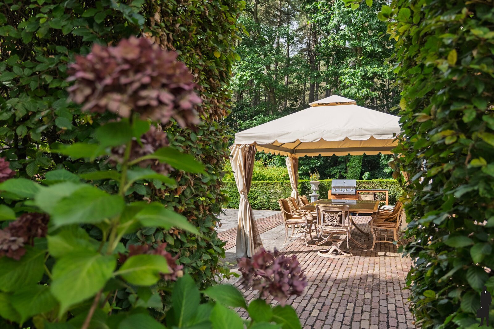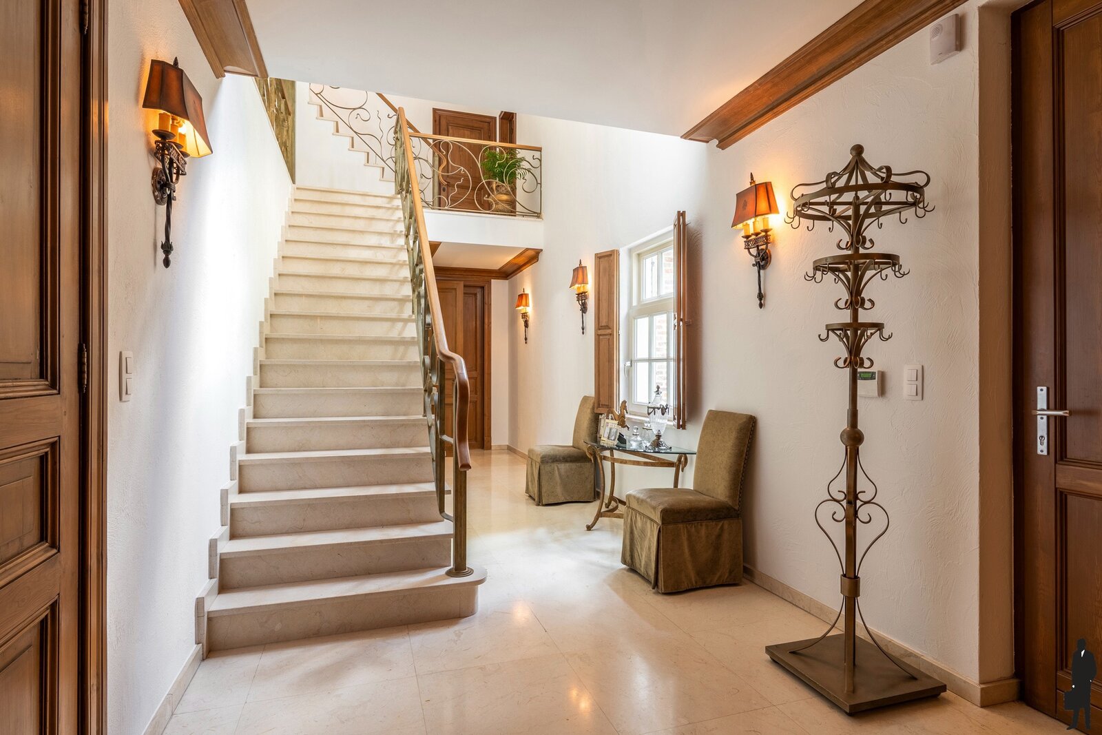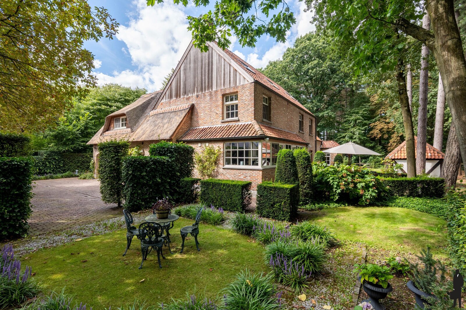 Gelijkvloerse verdieping: Bij het betreden van de woning valt meteen de imposante inkomhal op, voorzien van een open vide, natuurstenen vloer, garderobe en gastentoilet. Vanuit deze centrale hal is er toegang tot de verschillende leefruimten. De ruime woonkamer straalt een tijdloze elegantie uit met haar parketvloer, hoge plafonds, gashaard in een antieke Franse schouw en vier openslaande deuren die rechtstreeks naar het terras leiden. Aansluitend bevindt zich een gezellige tv-kamer met ingemaakte kasten, alsook een kantoor met zicht op de tuin. Het eetgedeelte sluit naadloos aan bij de keuken, die het hart van deze woning vormt. Deze luxueuze woonkeuken is uitgerust met hoogwaardige toestellen, waaronder een Lacanche fornuis, dubbele dampkap, dubbele spoelbak, Miele vaatwasser en zowel een combi-microgolf als een stoomoven. Aansluitend is er een praktische bijkeuken met spoelbak, Amerikaanse koelkast en extra bergruimte. De dubbele inpandige garage, voorzien van twee automatische poorten, herbergt naast veel opbergruimte ook een wijnklimaatkast die achterblijft.
