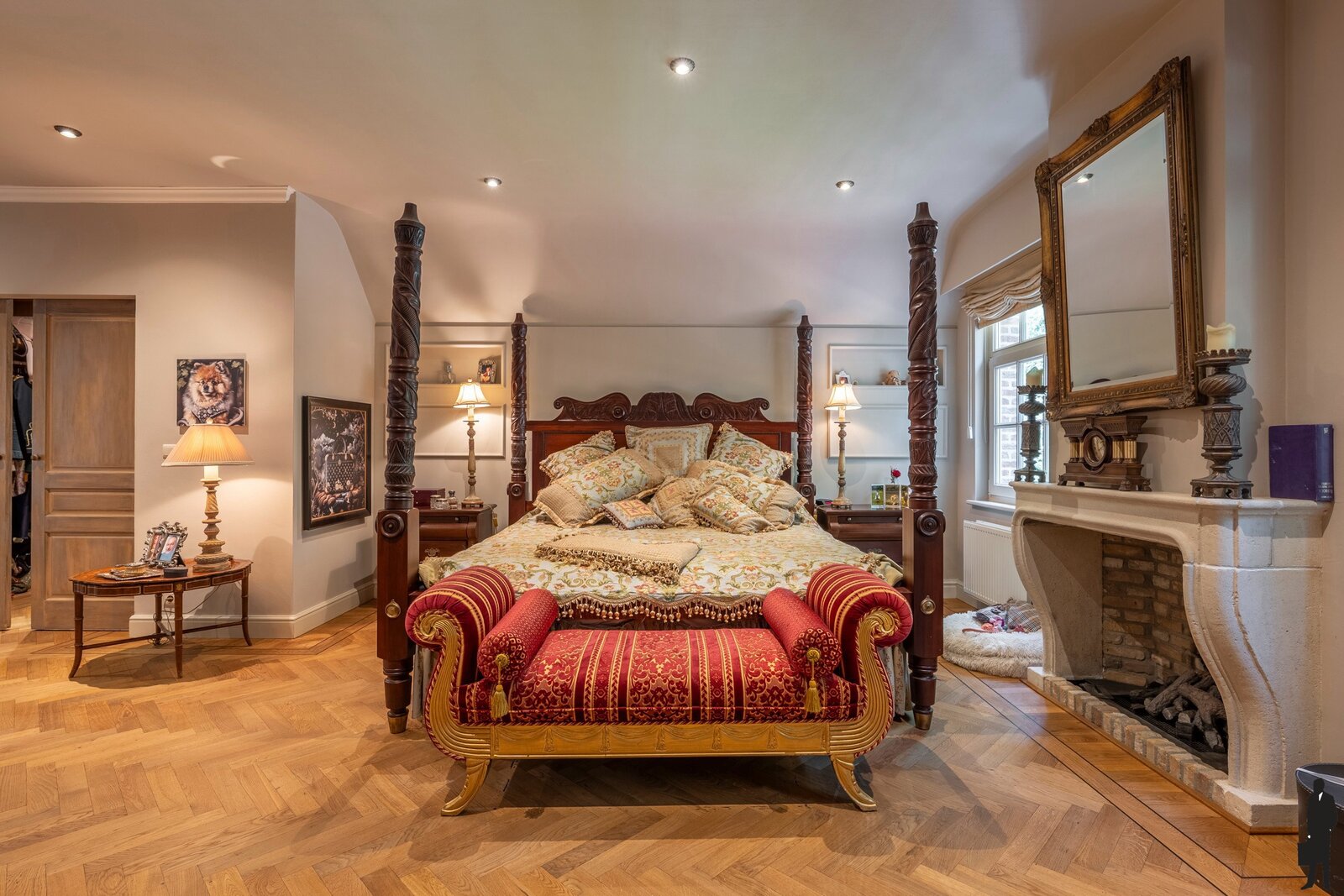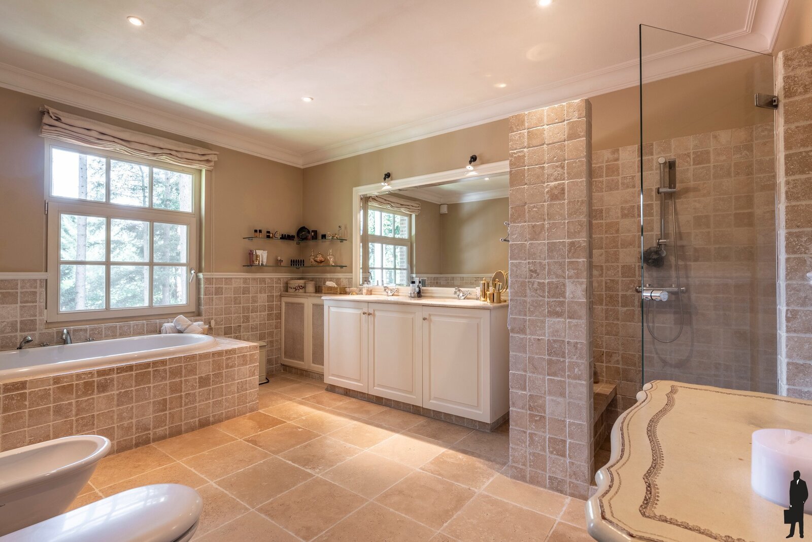 Eerste verdieping: Hier bevindt zich de masterbedroom met parketvloer, gashaard, airconditioning, dubbele dressing en een ensuite badkamer in natuursteen. Deze luxueuze badkamer is uitgerust met een ligbad, douche, dubbele wastafel, toilet en bidet. Daarnaast zijn er nog twee volwaardige slaapkamers, beide afgewerkt met parketvloer en ingemaakte kasten, waarvan één uitgerust met airconditioning. Een tweede badkamer, eveneens afgewerkt in natuursteen, beschikt over een douche en toilet. Verder is er op deze verdieping een praktische wasruimte met ingemaakte kasten en aansluitingen voor wasapparatuur.