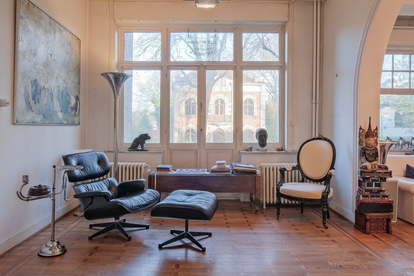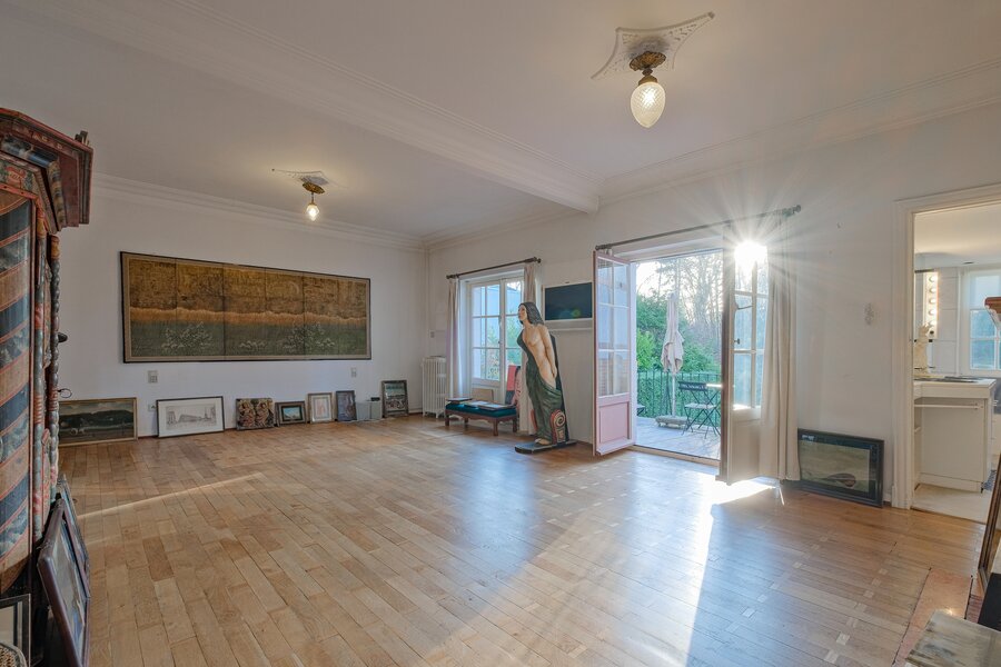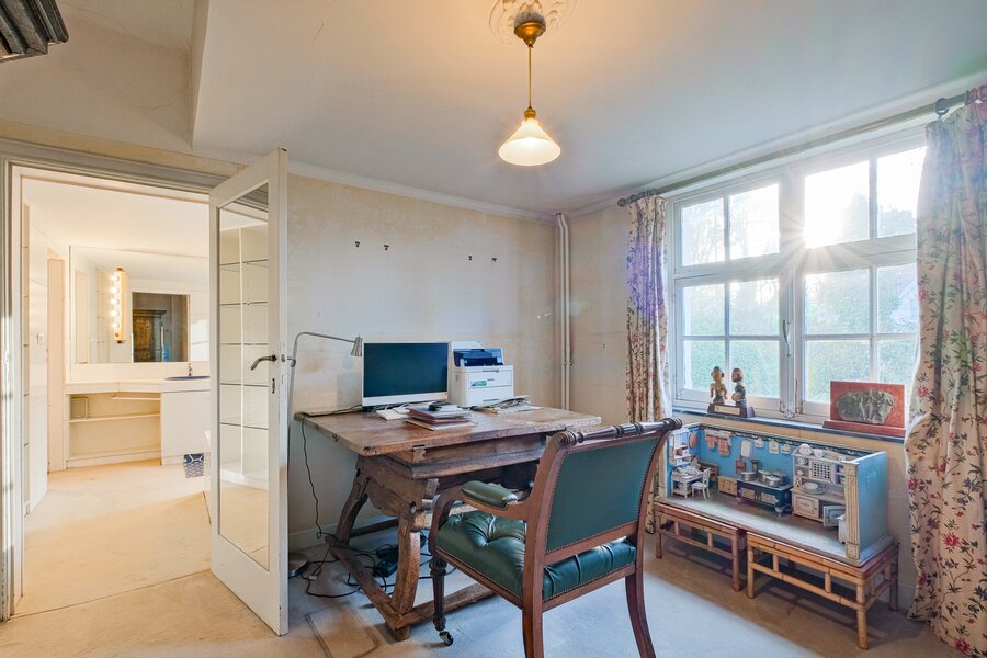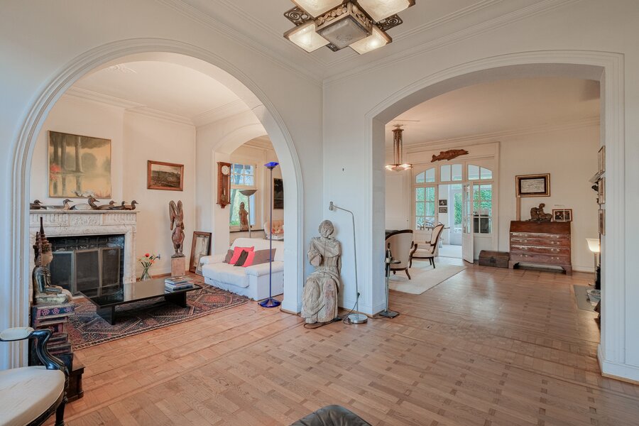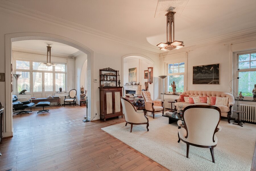 De woning is als volgt ingedeeld: Gelijkvloers (± 165 m²): ruime inkomhal die uitgeeft op een enfilade woonkamer, een eetkamer, een volledig uitgeruste leefkeuken, een apart toilet en een grote tuin. 1e verdieping (± 155 m²): overloop die uitgeeft op een master suite met badkamer, dressing en terras, een tweede slaapkamer met douchekamer en toilet, een bureau en een bergruimte. 2e verdieping (± 125 m²): nachthal met toegang tot drie ingerichte slaapkamers, een douchekamer met toilet, twee bureaus en een zolder. Kelderverdieping (± 165 m²): garage met atelierhoek, stookruimte, wijnkelder, wasruimte, bergkelder en sauna met douche. PEB G. Verder: functionele open haard, nieuw dak, gasketel, mooie plafondhoogte, tuin van 11 are, tal van authentieke elementen bewaard, echte “coup de cœur”-woning. Snel te ontdekken!