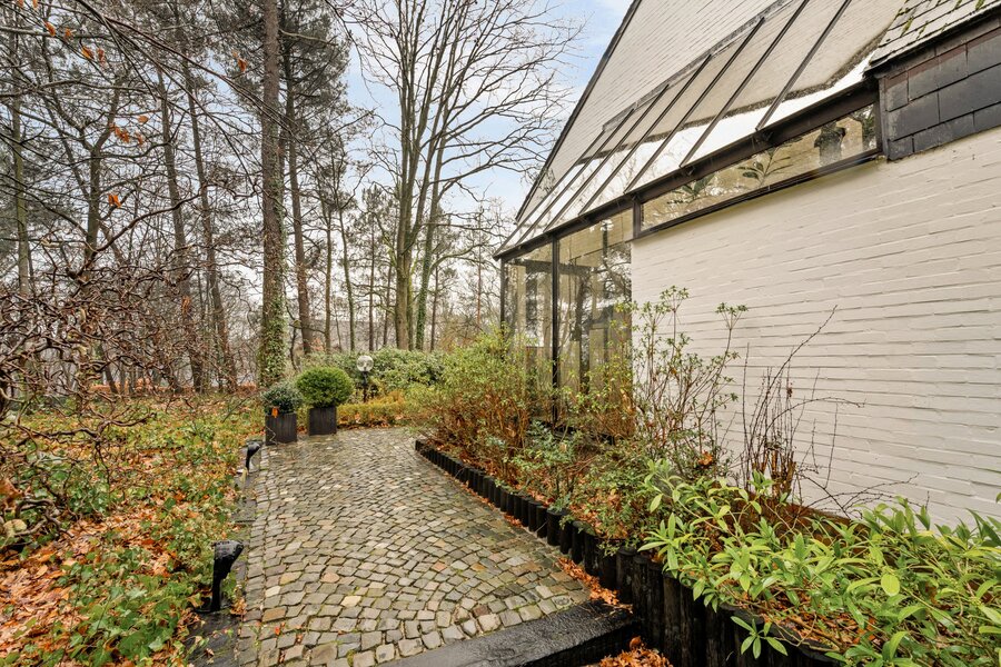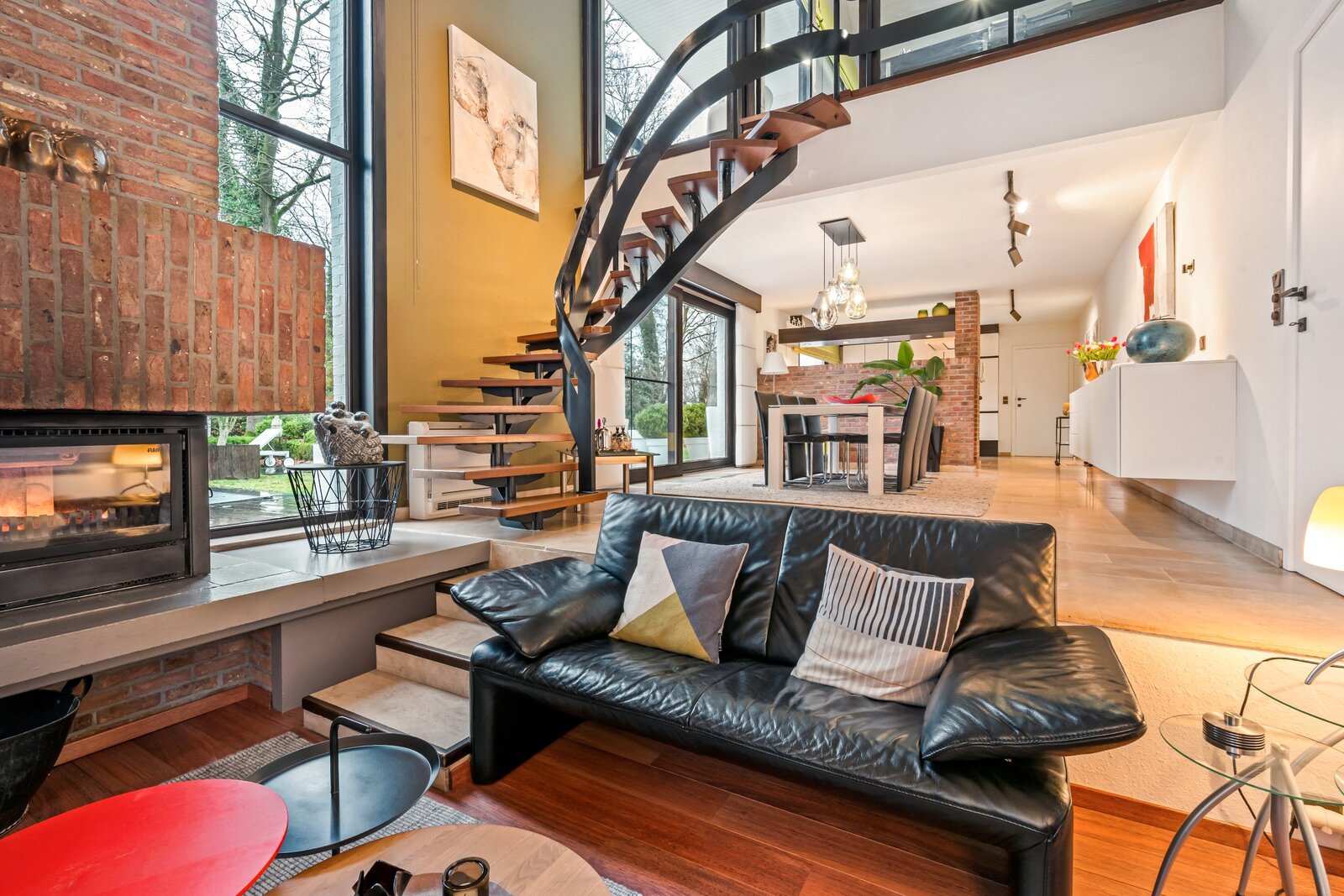 Via een 5-tal treden gaat men naar de linkerkant van de woning waar de voordeur is. De uit glaspanelen bestaande inkomhal creëert een overvloed aan lichtinval en zorgt meteen voor een vakantiegevoel. Dat gevoel wordt nog versterkt wanneer we binnentreden en de leefruimte overschouwen. De houtcassette met kolossale schoorsteenmantel draagt hier zeker toe bij. Ook hier, geflankeerd door grote glaspartijen. Het hoger gelegen bureel is bereikbaar via de trap tussen eet- en zitplaats. Men heeft er een prachtig zicht over de tuin en zwembad.