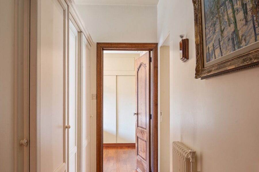Aan de linkerzijde van de inkomhal bevinden zich twee volwaardige slaapkamers en een ruime badkamer, uitgerust met ligbad, douche, dubbele lavabo, toilet en ingemaakte kasten.