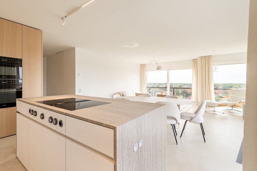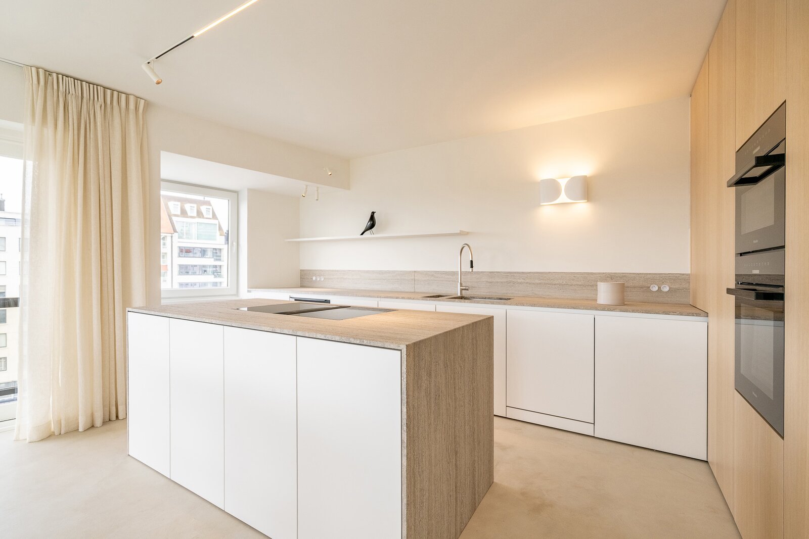 De volledig uitgeruste open keuken vormt een harmonieus geheel met de eetruimte en is voorzien van topapparatuur van het merk Miele, inclusief een ingebouwde wijnkoeler. De strakke afwerking met kwaliteitsmaterialen en het gebruik van beton ciré doorheen het appartement zorgen voor een moderne, warme uitstraling en een open gevoel.