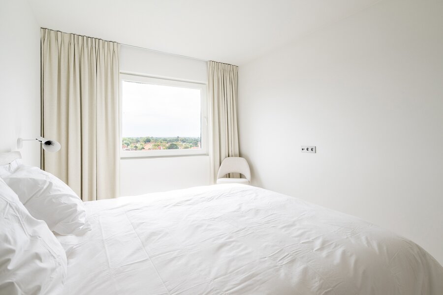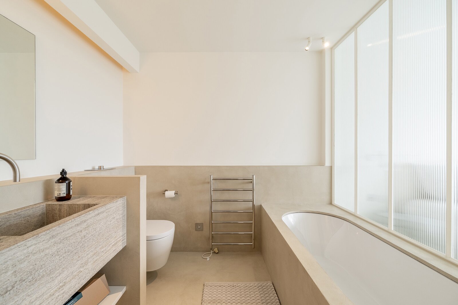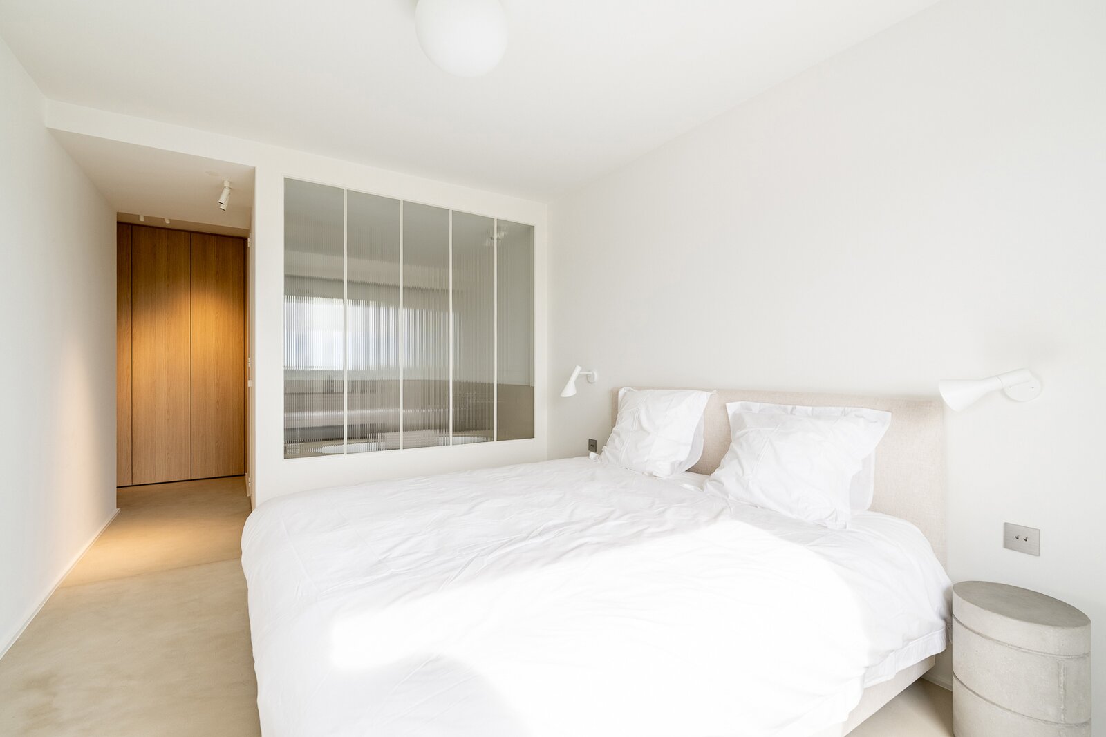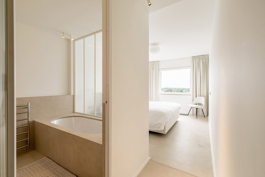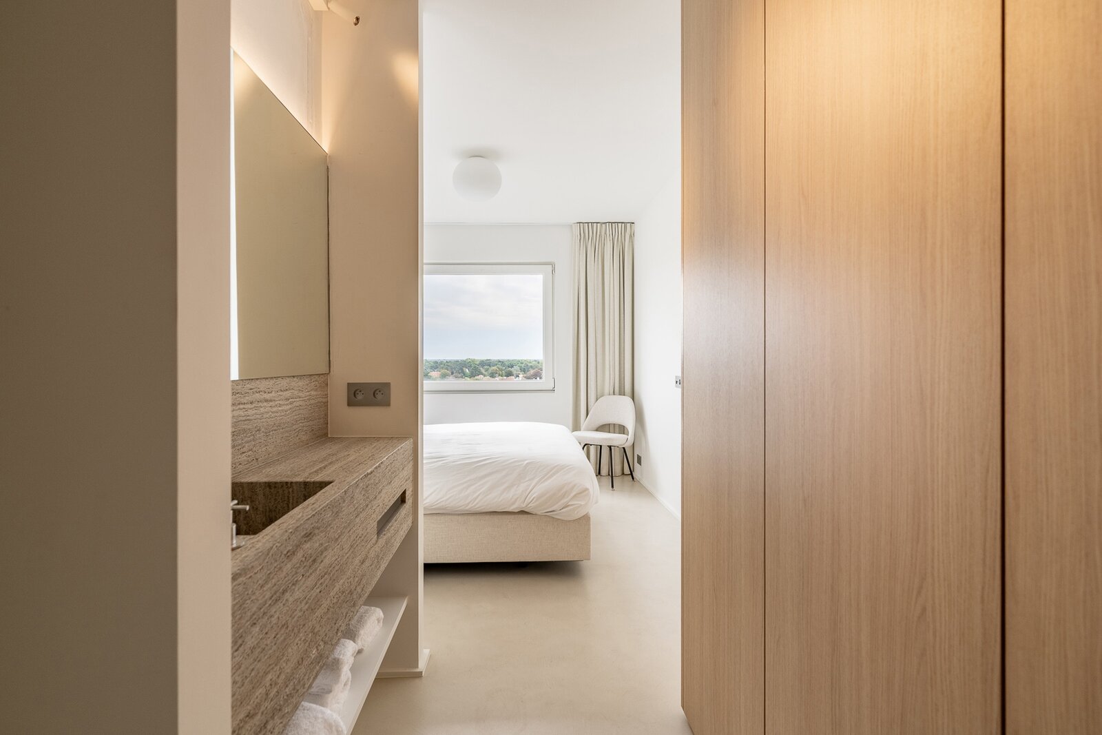 Het appartement beschikt over twee volwaardige slaapkamers, elk voorzien van maatwerkkasten en een eigen badkamer of doucheruimte. De sanitaire ruimtes zijn afgewerkt in natuurlijke materialen en voorzien van stijlvolle kwaliteitskranen.