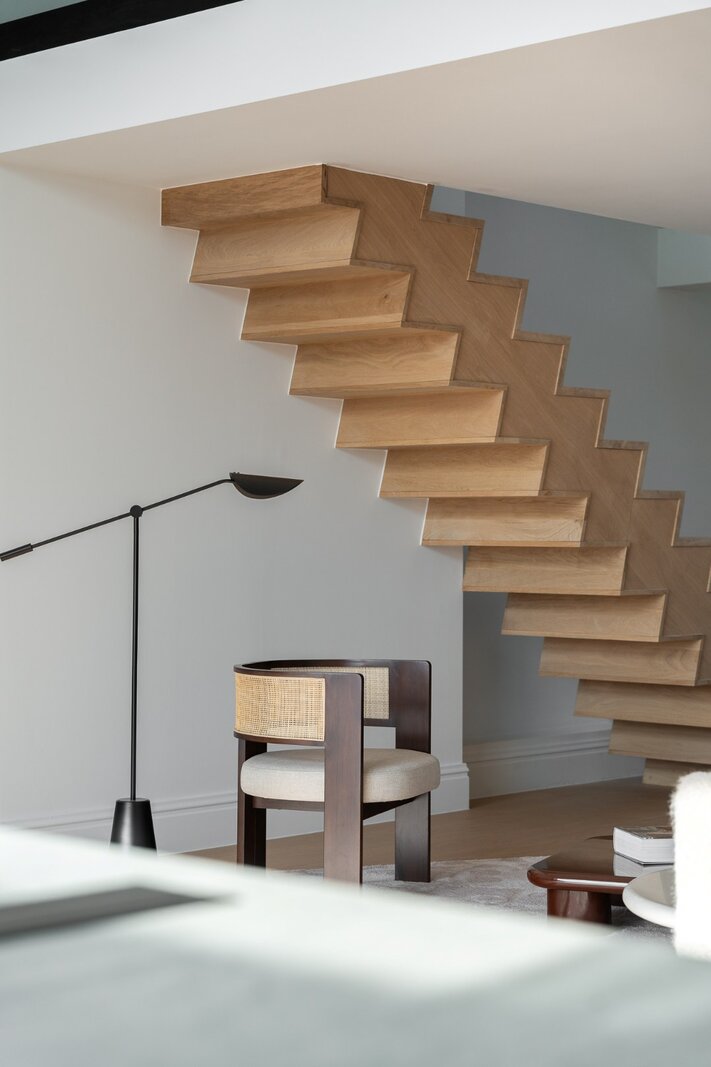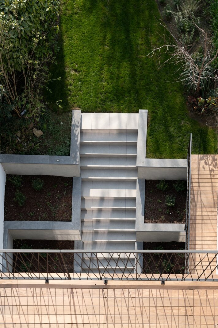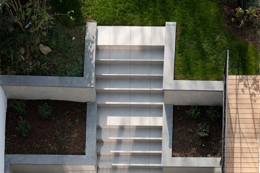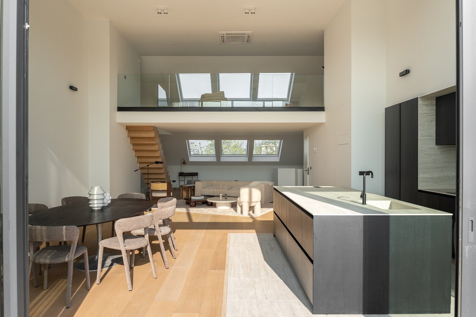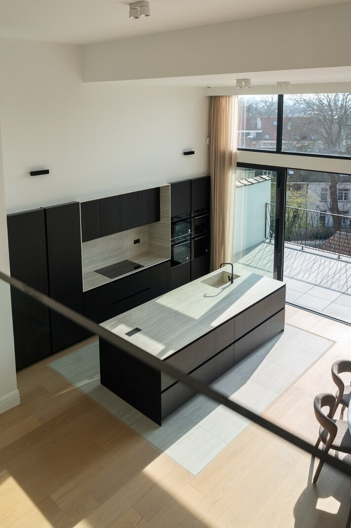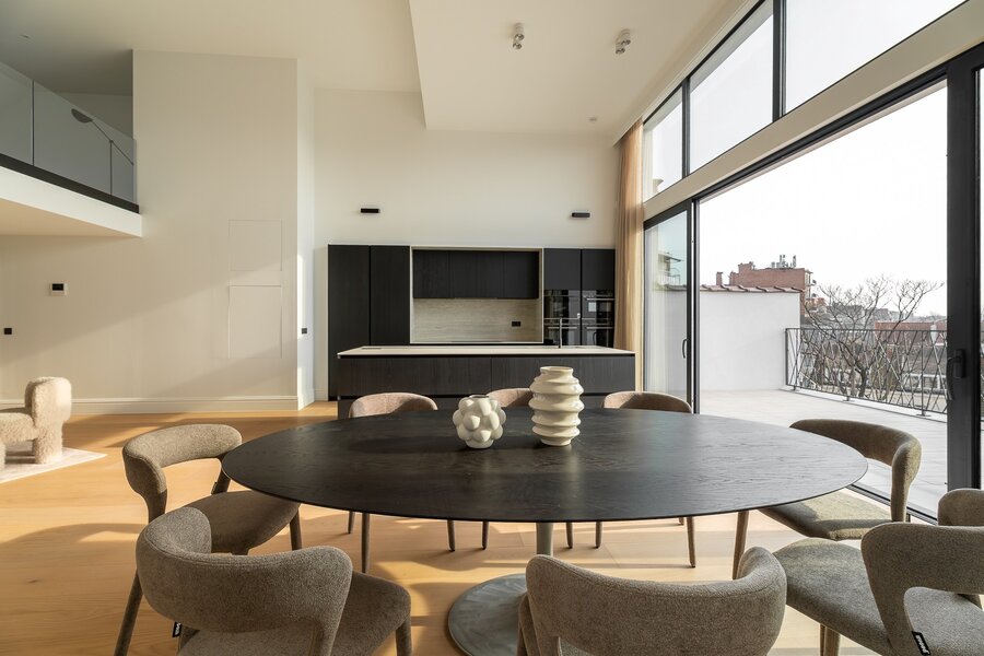 De 4de verdieping omvat de ontvangstruimtes. De doorzonindeling zorgt voor een aangename lichtinval in de leefruimte en eetkamer. De keuken sluit hier naadloos op aan en wordt gekenmerkt door een kathedraalplafond van 4,80 m hoogte en directe toegang tot het terras. Een mezzanine die uitkijkt op de leefruimte biedt plaats aan een bureau of tv-salon met airconditioning.