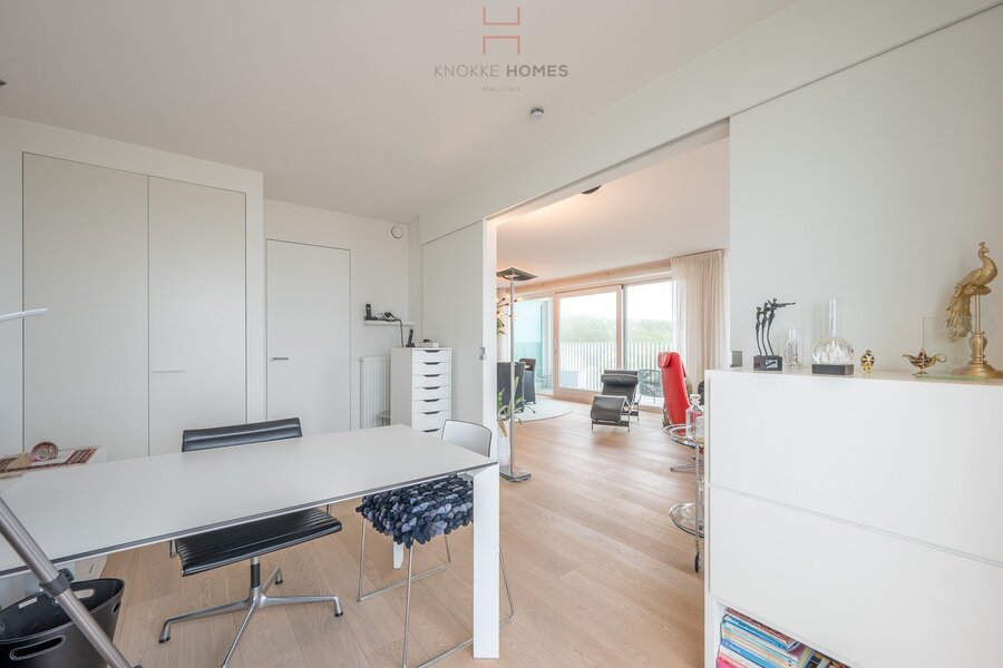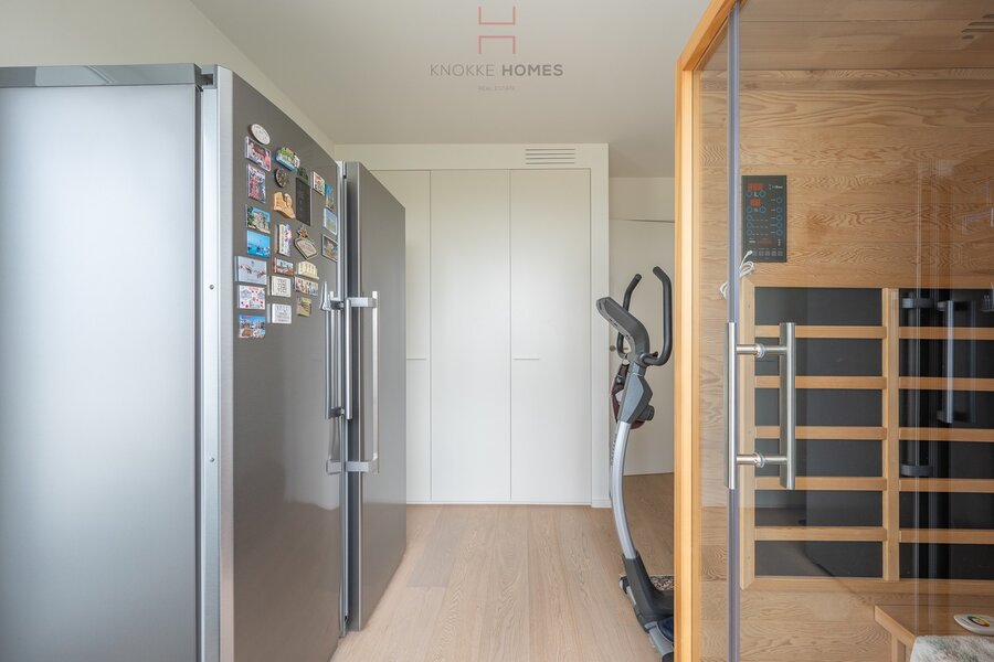 In de inkomhal is het gastentoilet, een vestiaire en een handige bergruimte met aansluiting voor was- en droogmachine. De lichtrijke leefruimte, met een gezellige living en eetplaats, biedt directe toegang tot de zonovergoten terrassen. Geniet van het adembenemende frontale zeezicht en het schitterende uitzicht op het Willemspark, de ideale setting om te ontspannen. Aansluitend vindt u de half-open, volledig uitgeruste keuken, die uitnodigt tot culinaire creaties.