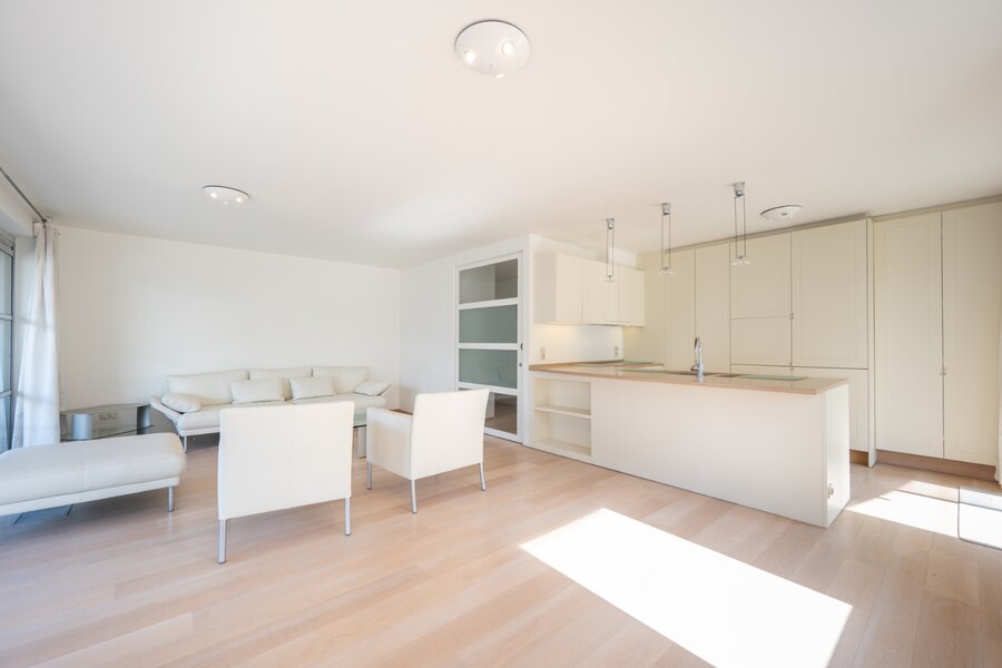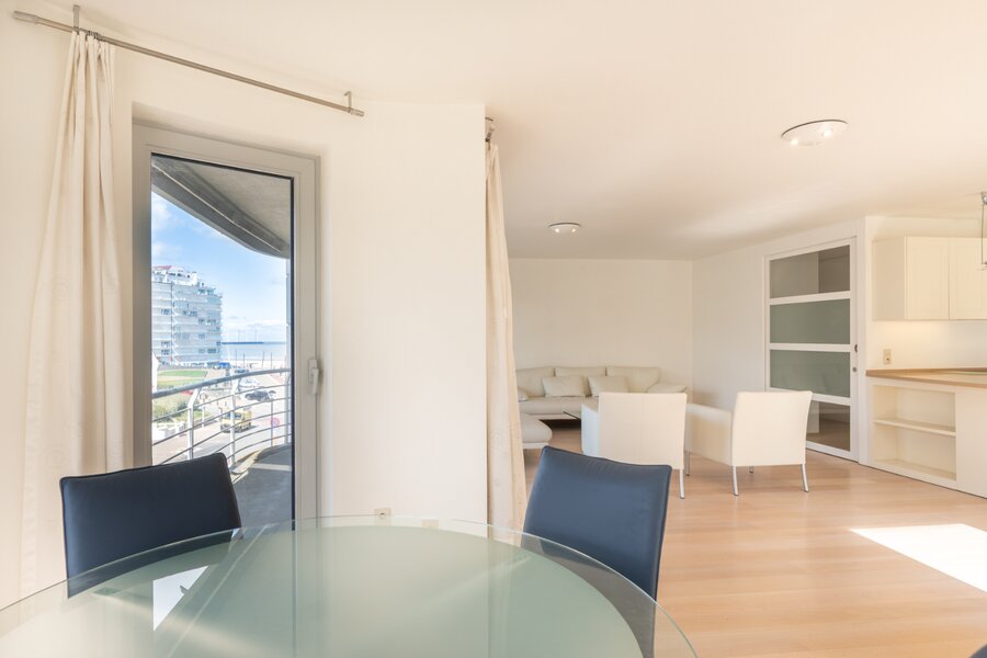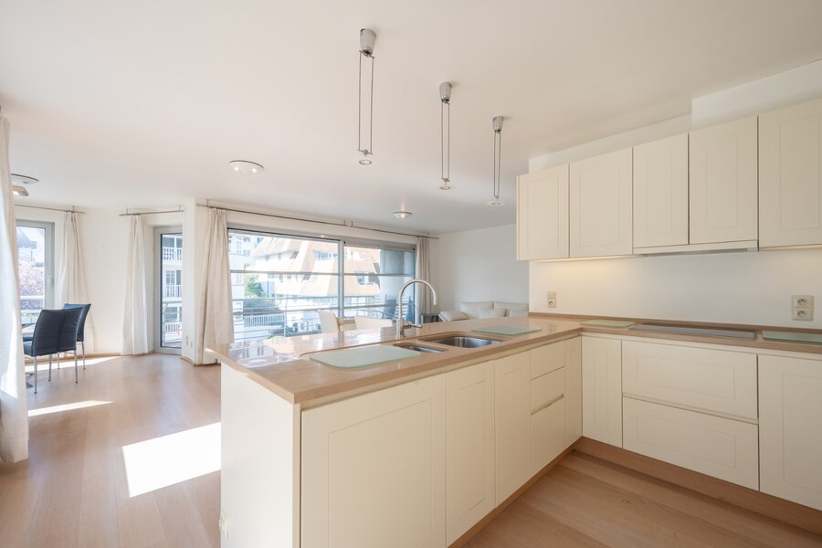Indeling van het appartement: inkomhal met vestiaire en gastentoilet. Ruime en lichtrijke leefruimte met zijdelings zeezicht en een open, volledig ingerichte keuken voorzien van alle hedendaags comfort.