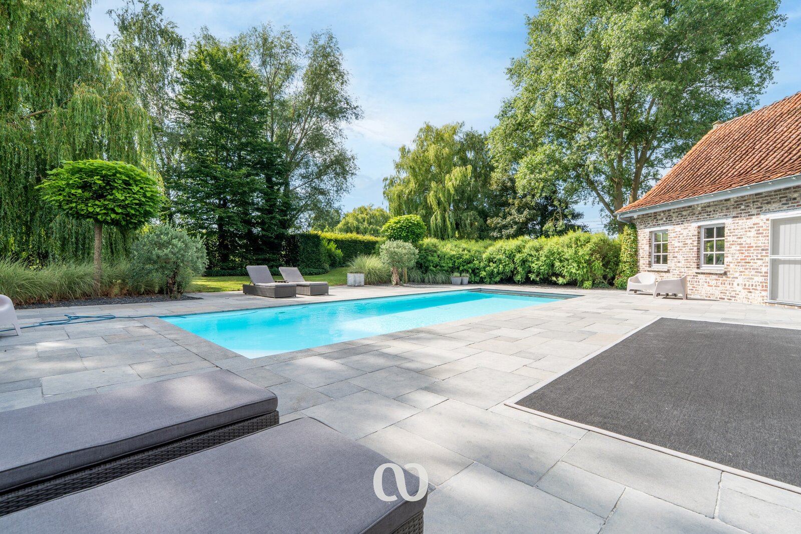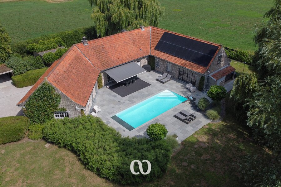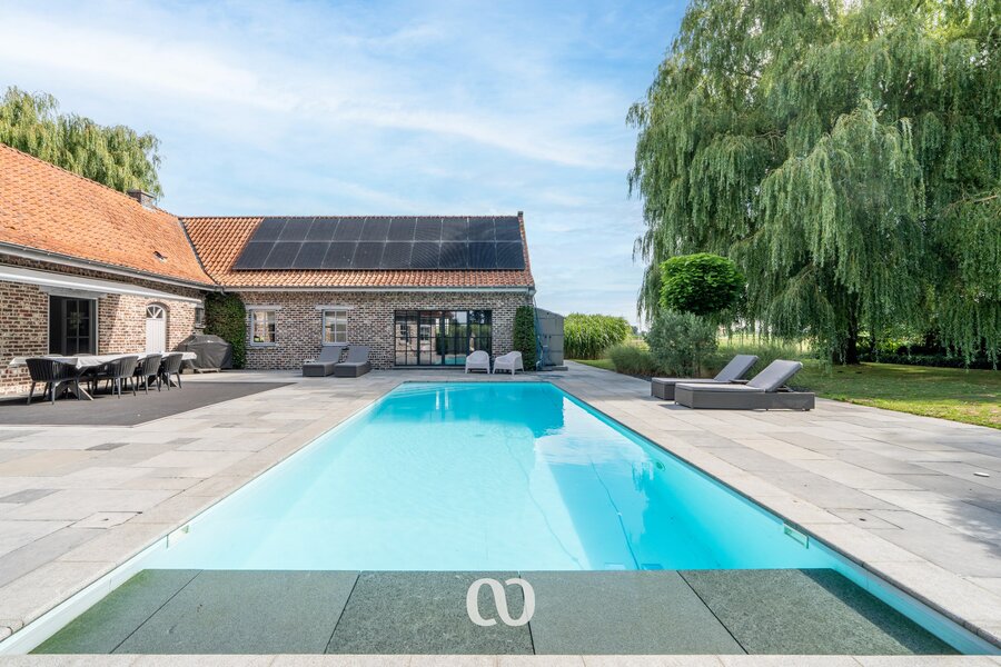 Stap binnen in een oase van rust en charme, verborgen in het groene hart van Kruishoutem. Deze karaktervolle U-vormige hoeve ademt authenticiteit en sfeer, met als absolute eyecatcher het zwembad als centraal middelpunt van de woning.