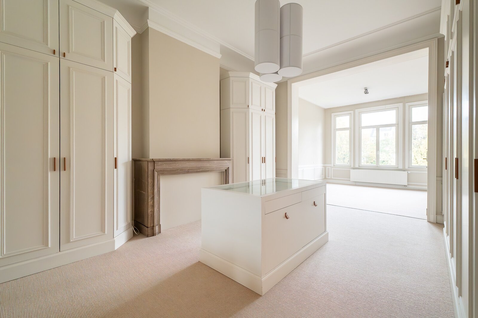 De gelijkvloerse verdieping bestaat uit een ruime inkomhal met vestiaire en gastentoilet, lichtrijke ontvangstruimtes met open haard, een eetkamer en een volledig uitgeruste open Siematic keuken met ontbijthoek die toegang geeft tot het terras en de tuin.